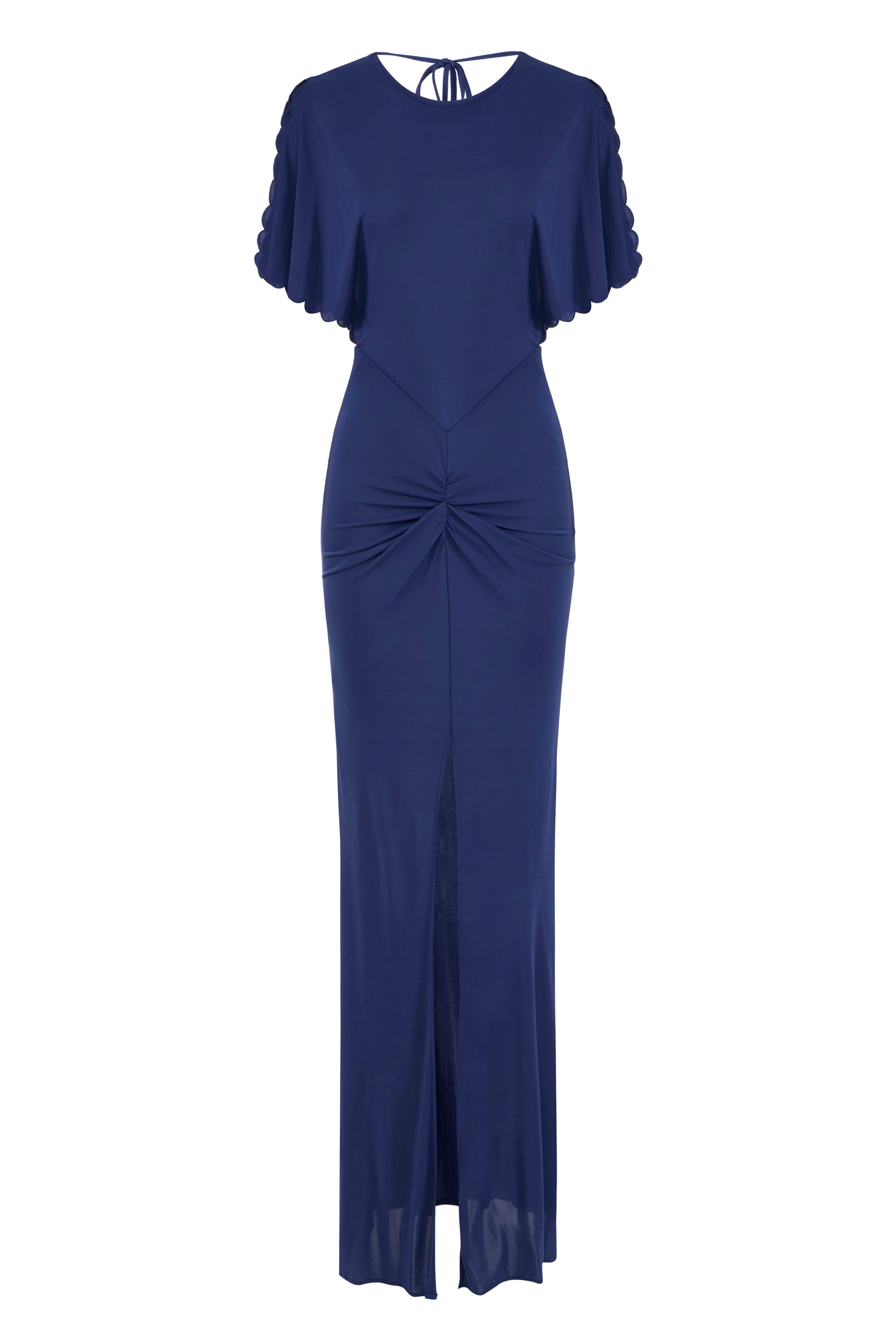 Evening dress in jersey fabric. The dress features short sleeves, a boat neckline and an open back with lace. Details such as the embroidered scallop, the drape at the waistline and the central slit on the skirt give a sinuous and defined line. Slim fit.
