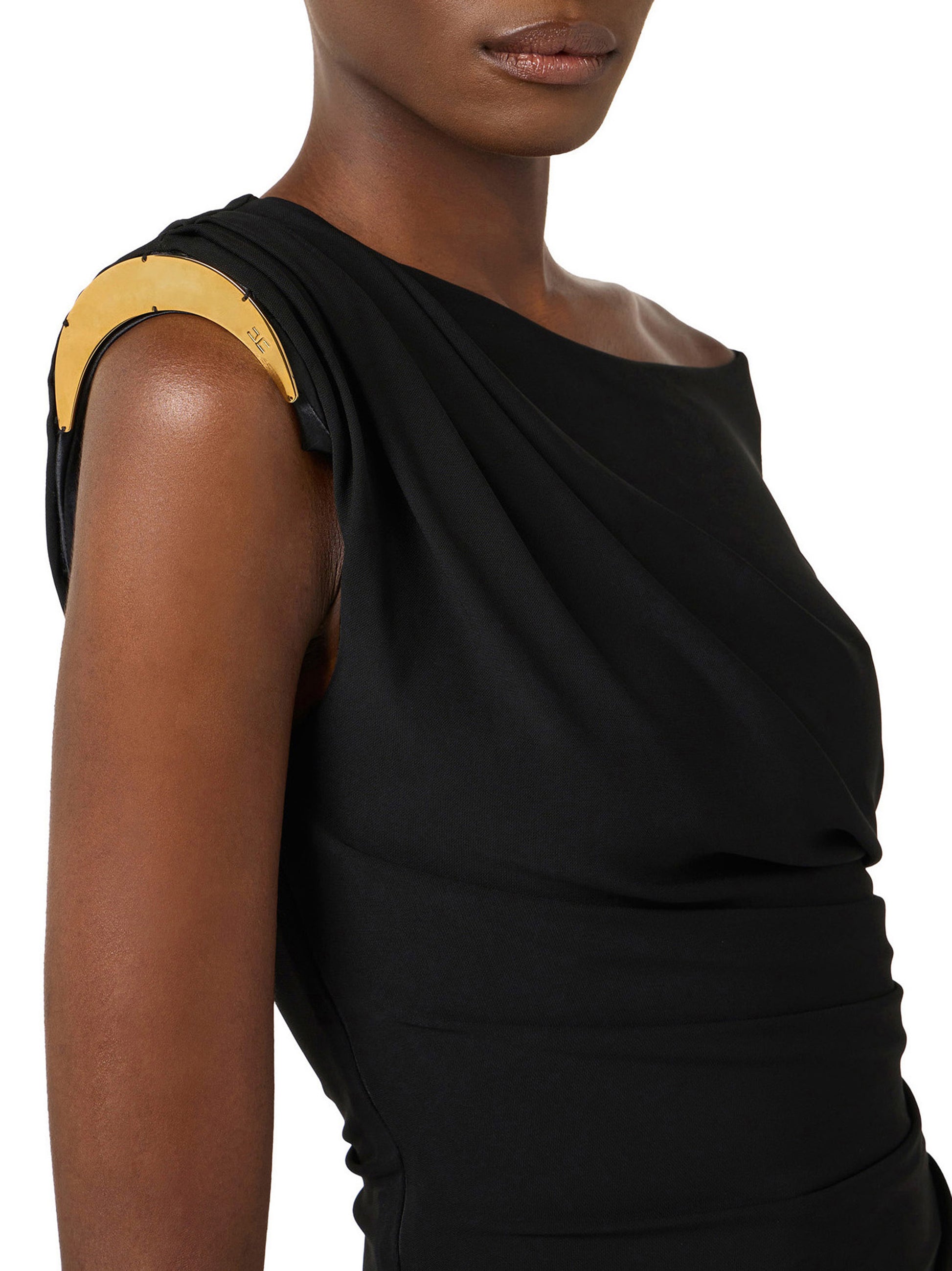 Dress in crêpe jersey fabric with slim fit. The dress has a structured one-shoulder design, fastened with a golden metal crescent that adds sparkle. The skirt has an asymmetrical cut, enhanced by a deep side slit for a seductive touch.