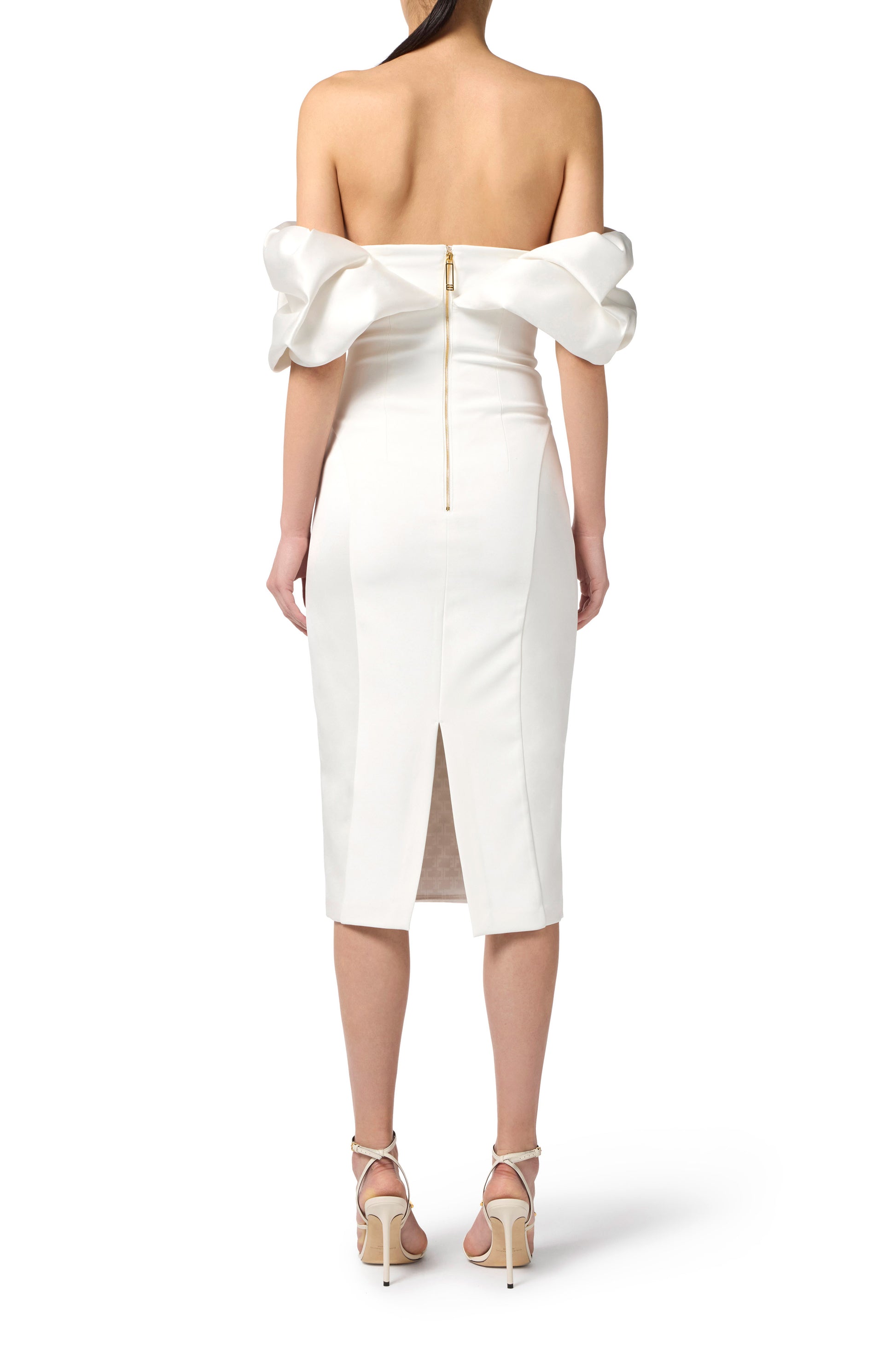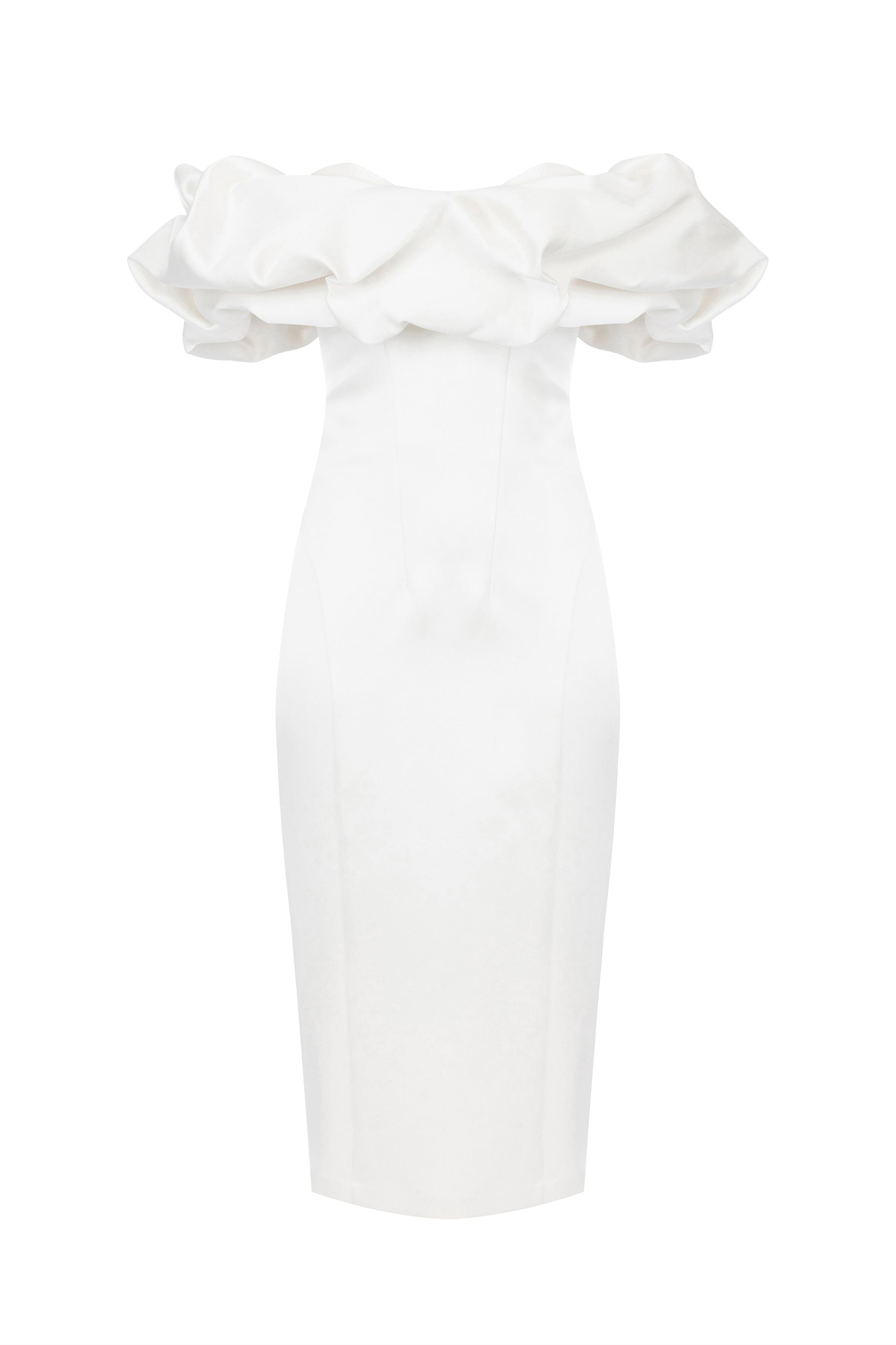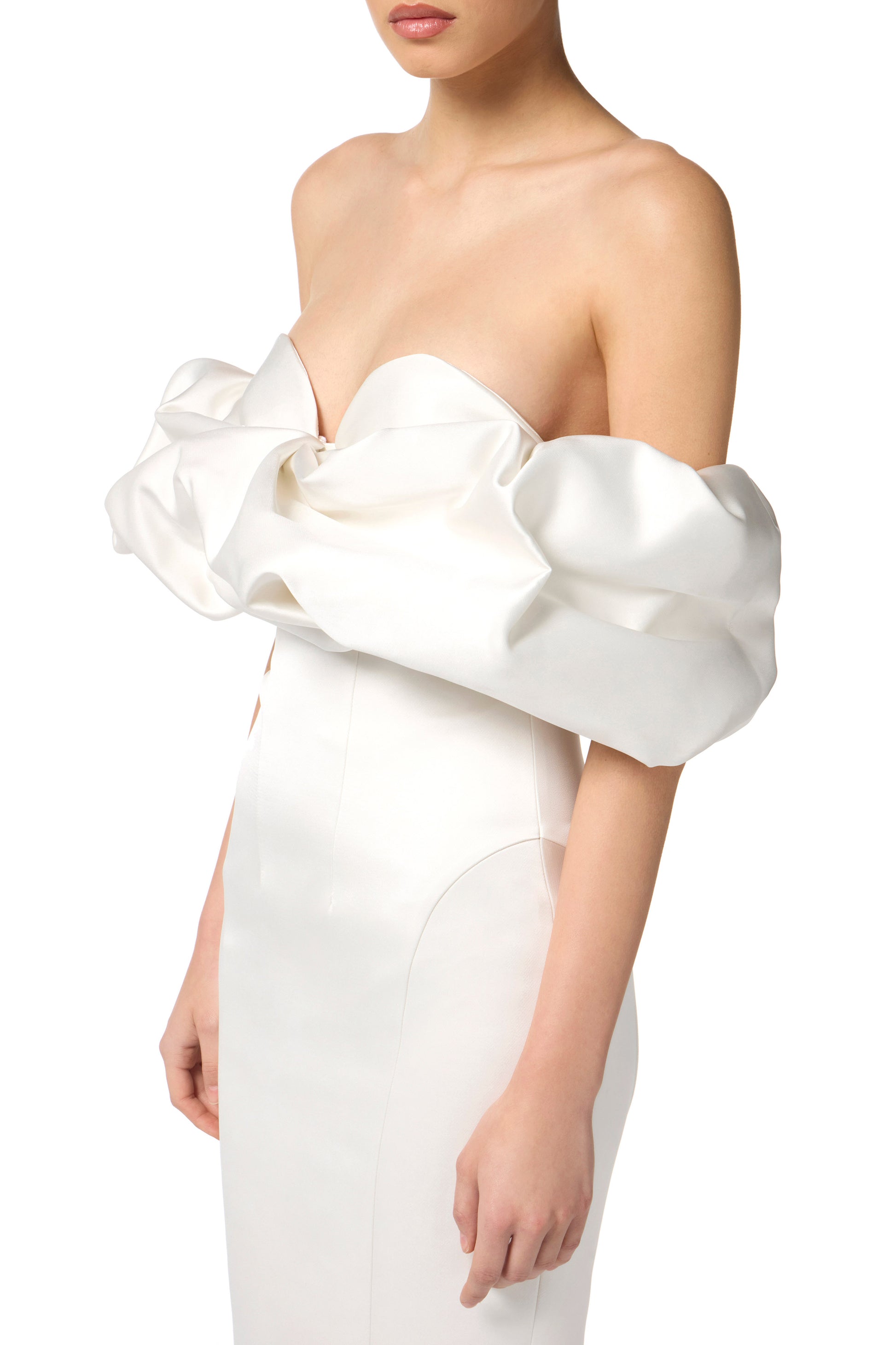 Slim fit sheath dress in duchess satin fabric. The dress has bare shoulders, enveloped by a fluffy neckline in studied 3D volumes that evoke the lightness of a cloud. Crêpe inserts and a back slit give definition and structure.