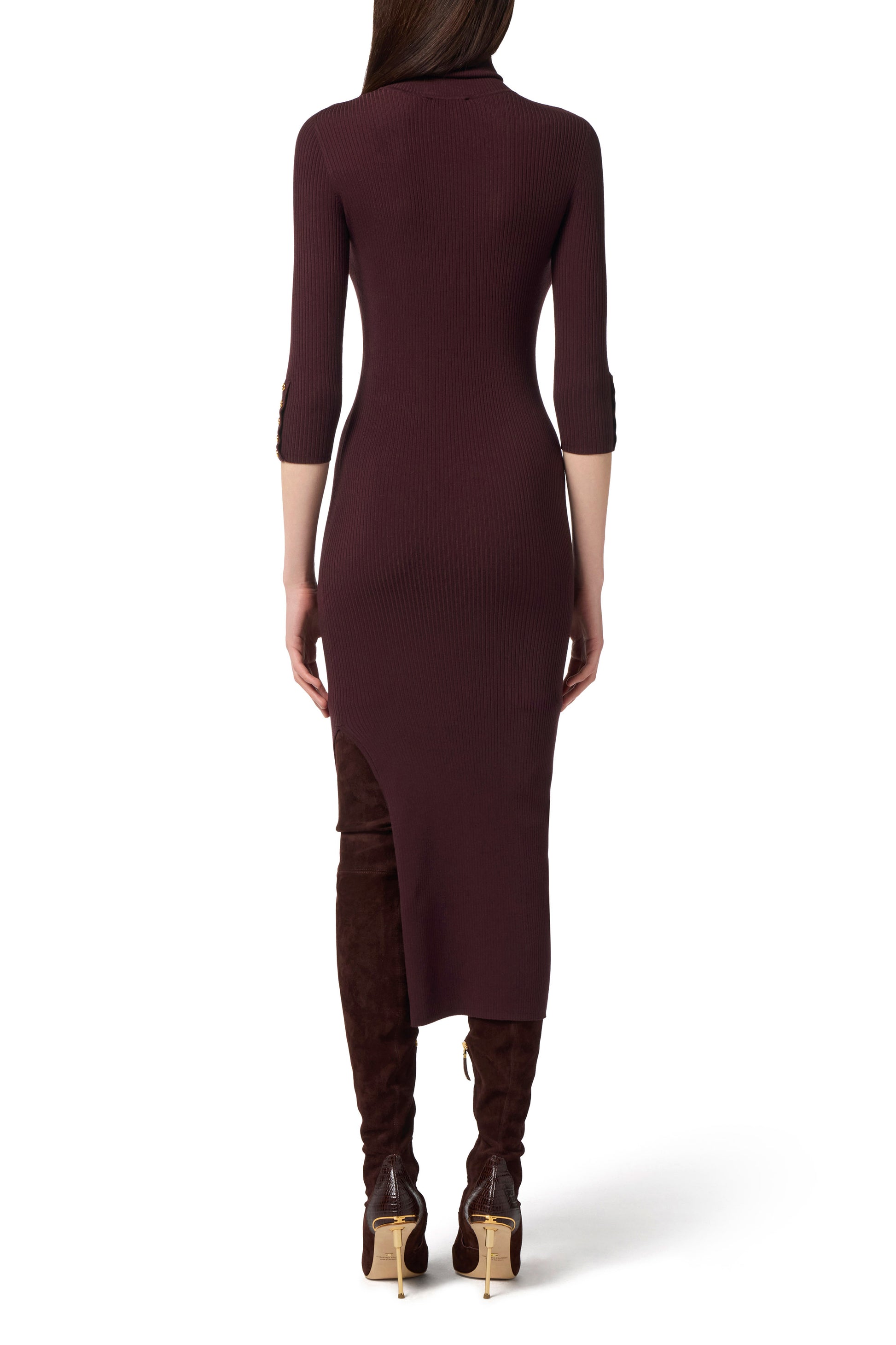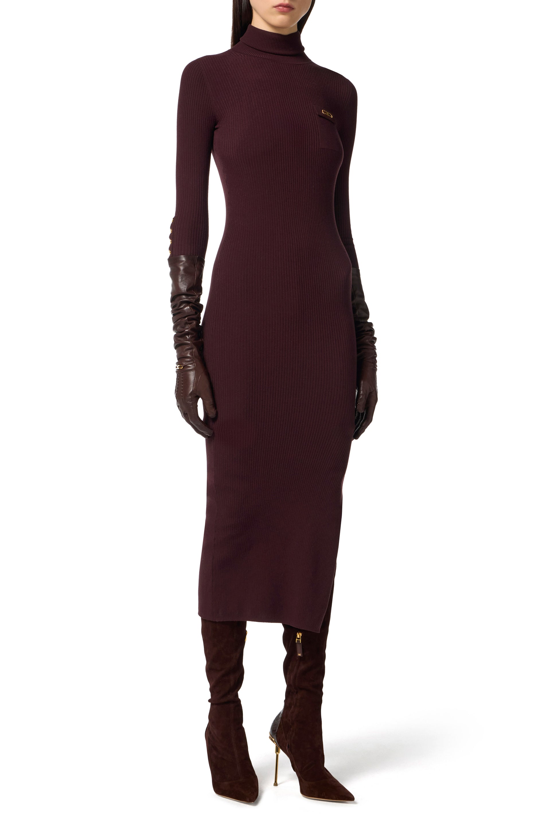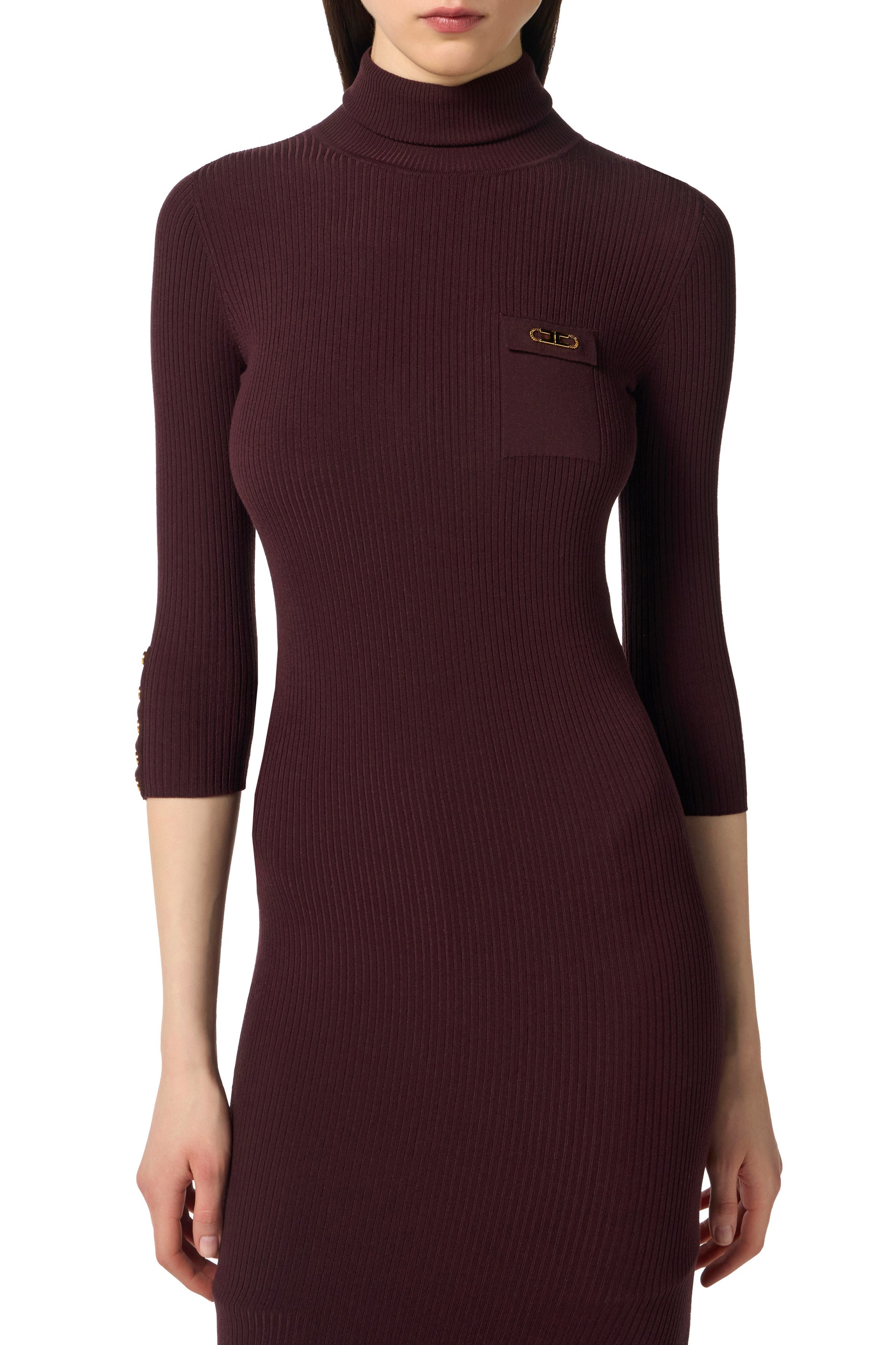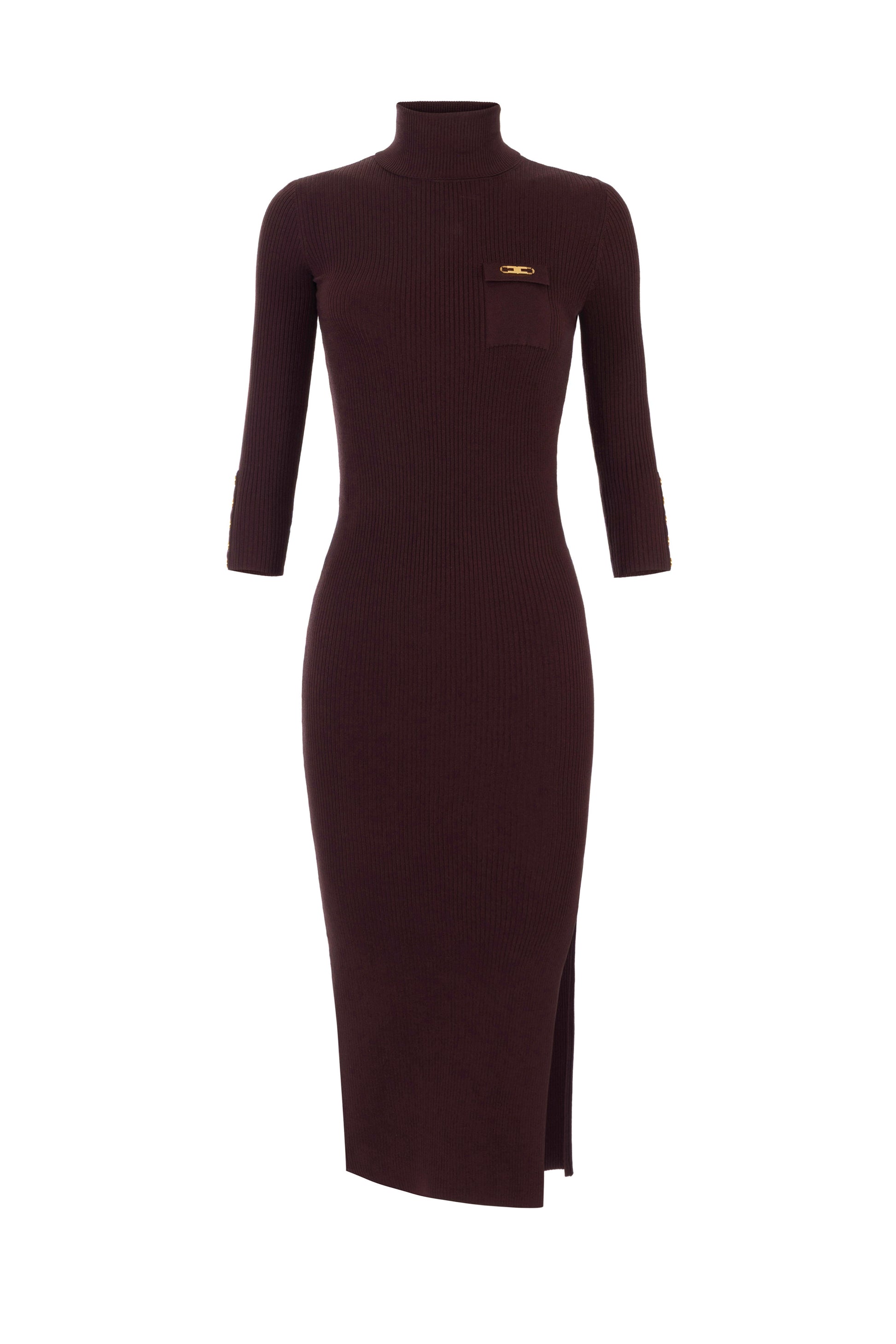 Knit top with a slim fit. The dress has a turtleneck, ¾ sleeves with buttons and is characterised by a calf-length skirt with a deep side slit. Ribbed knitting enriches the essential line of the garment. The satin breast pocket with logo detail gives a final touch of style.