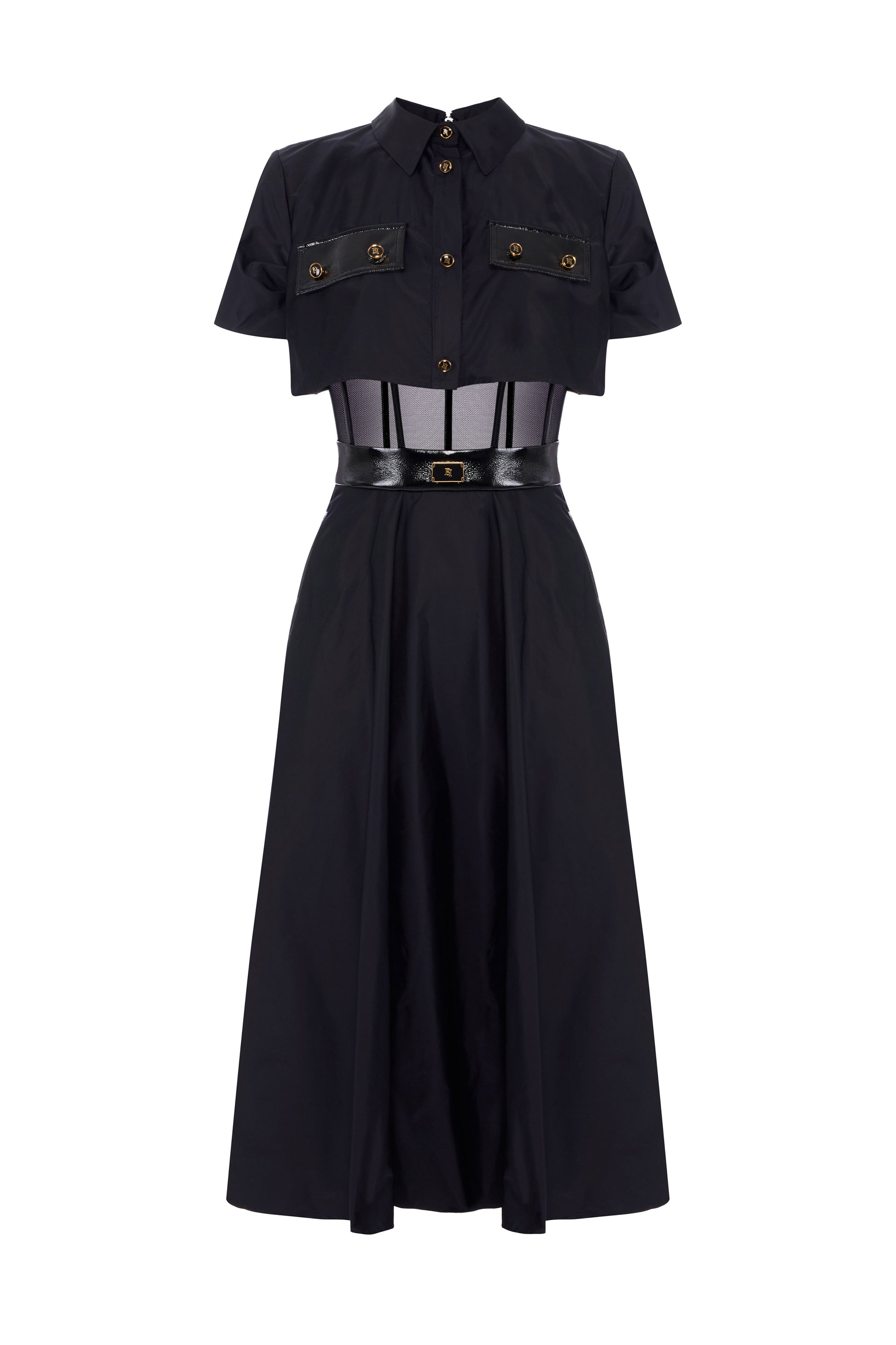 Voile fabric midi dress with circle skirt and slim fit. The dress features a top with cropped shirt that reveals a bodysuit in tulle fabric inspired by bustier styles. Vinyl textured details create interesting textural contrasts and add light.