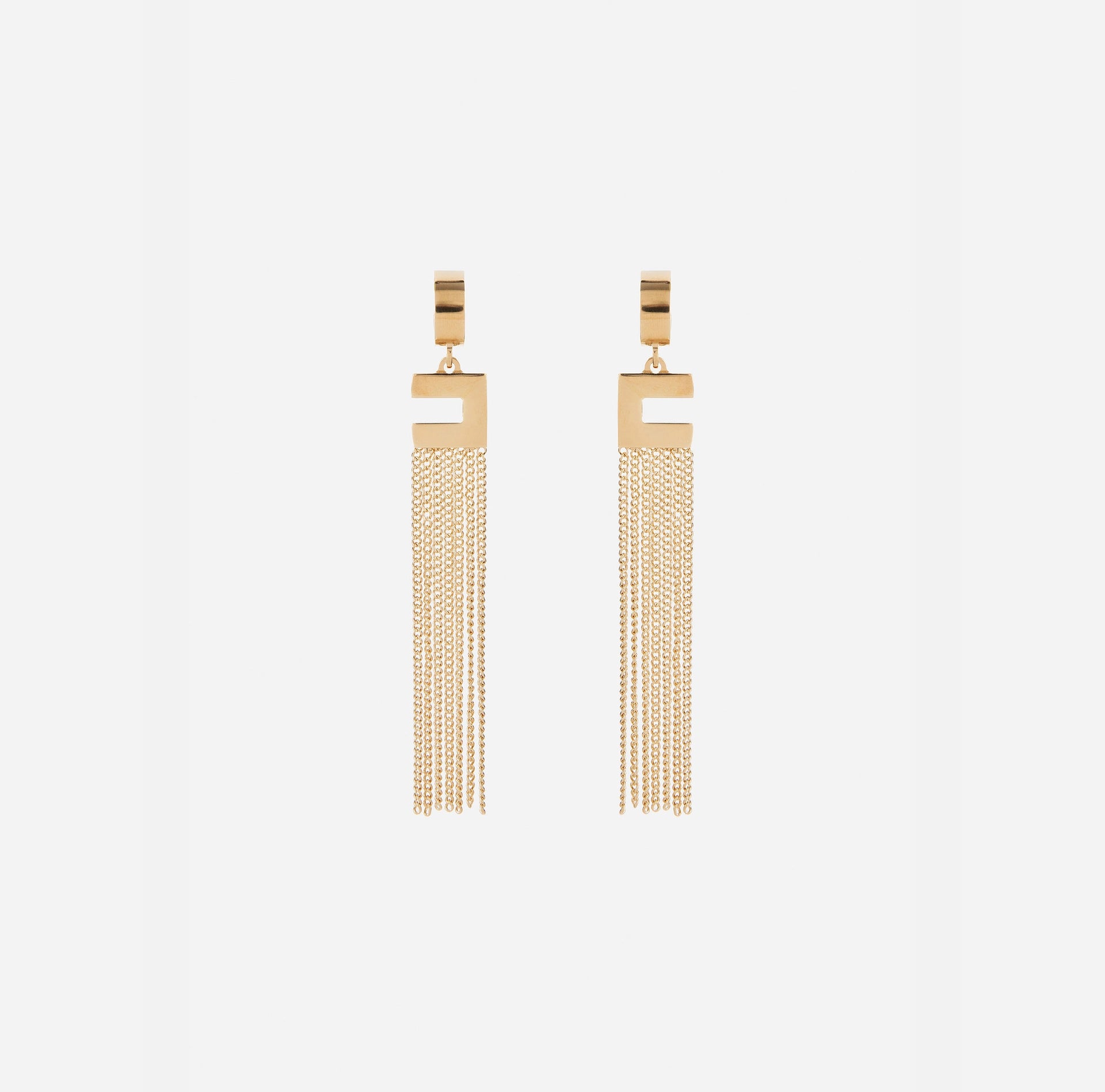 Pendant earrings with logo and micro chain tassels in gold. Closure with c