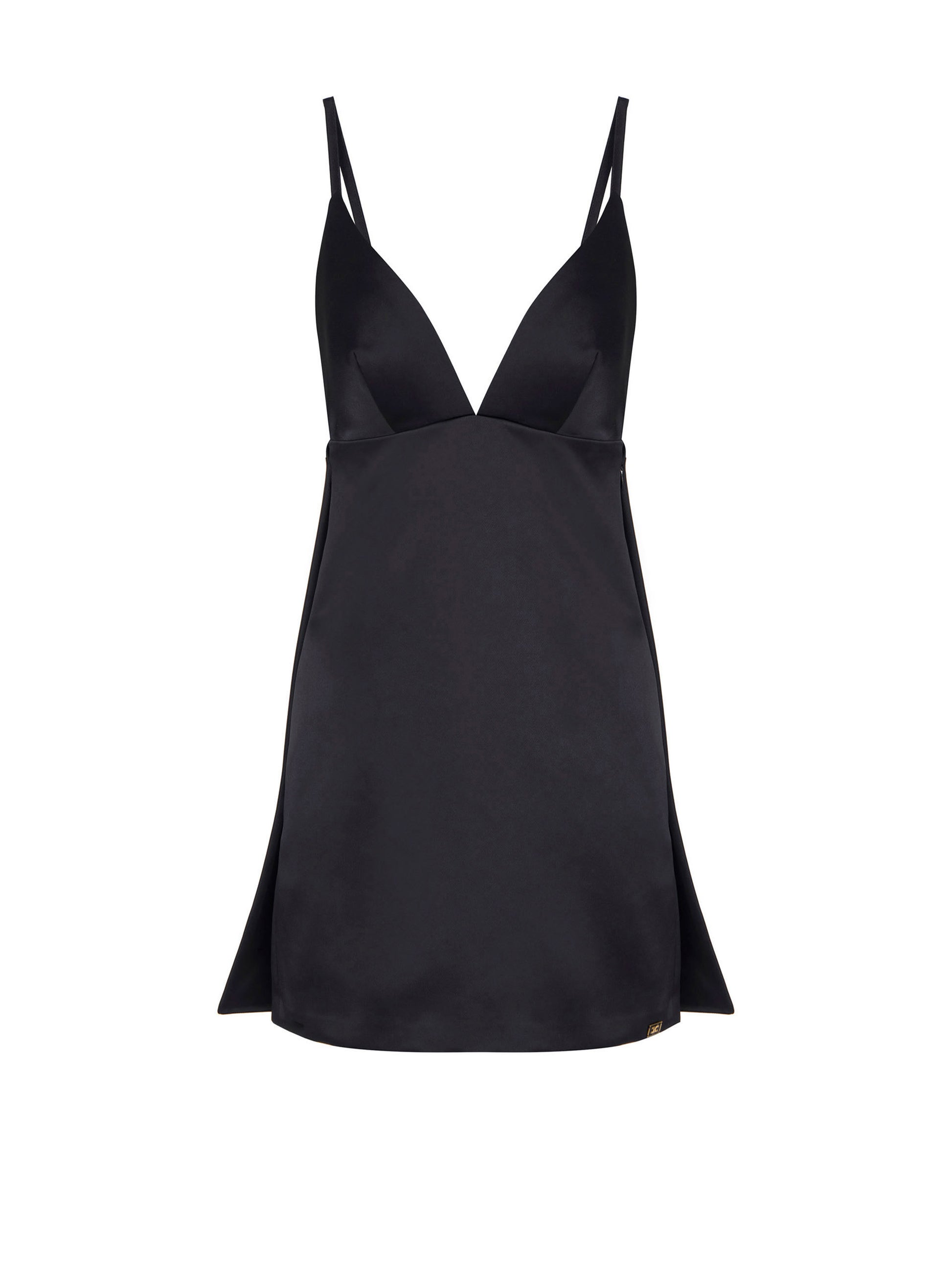 Mini dress in duchess satin with a regular fit. The dress stands out for the cape construction on the back that creates an interesting play of volumes. Logo details decorate the straps and the bottom of the garment, adding bright accents.