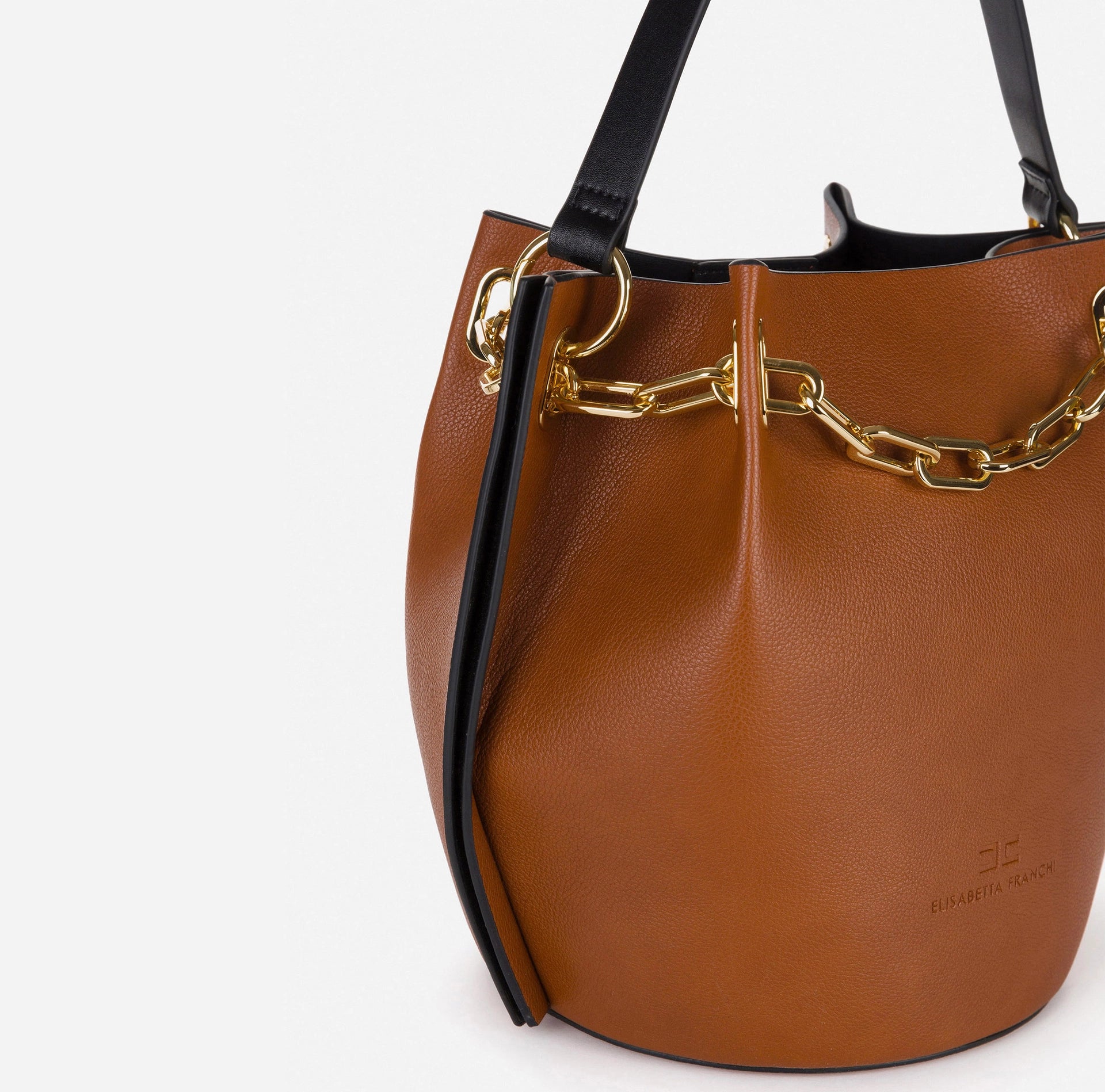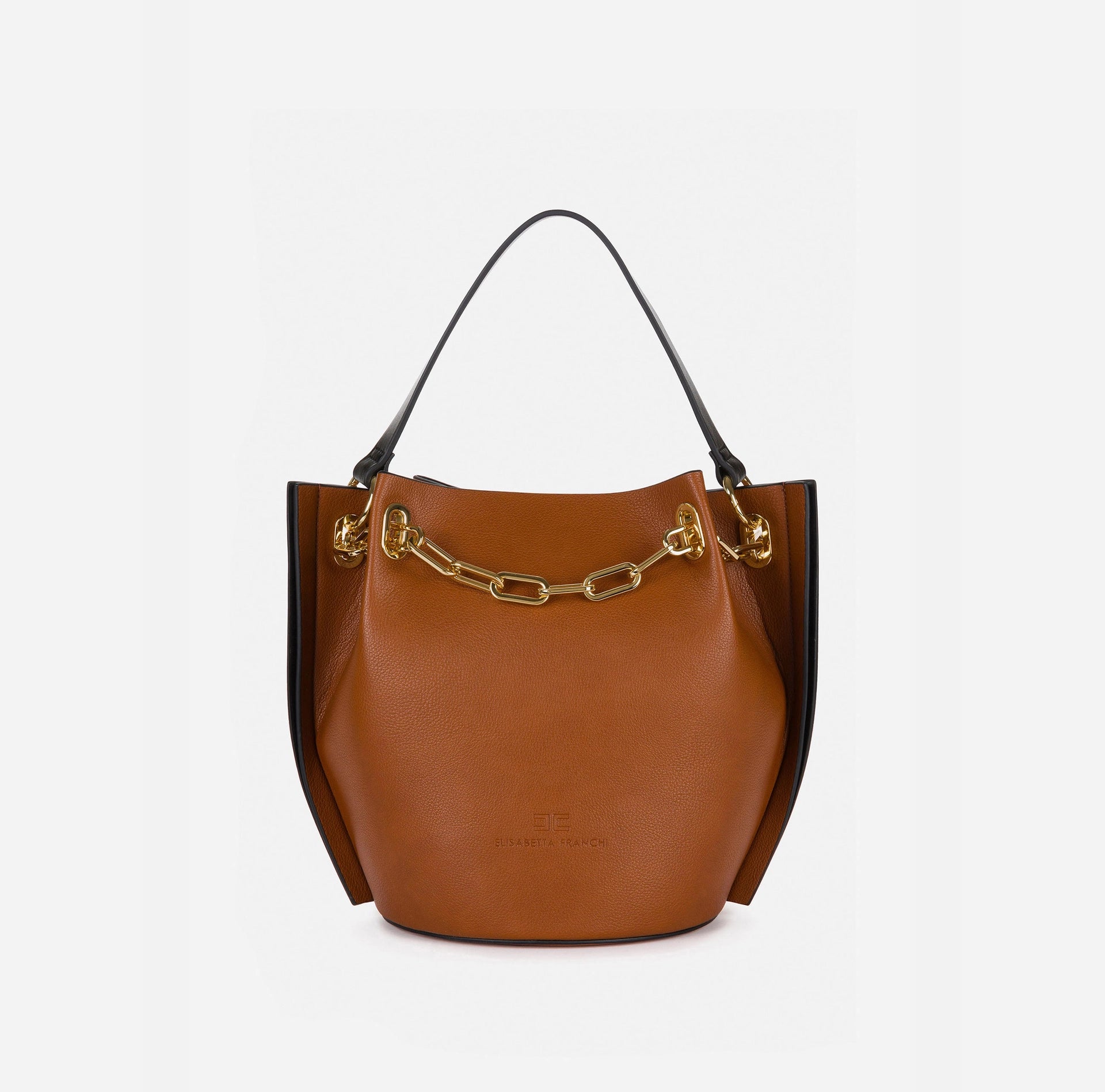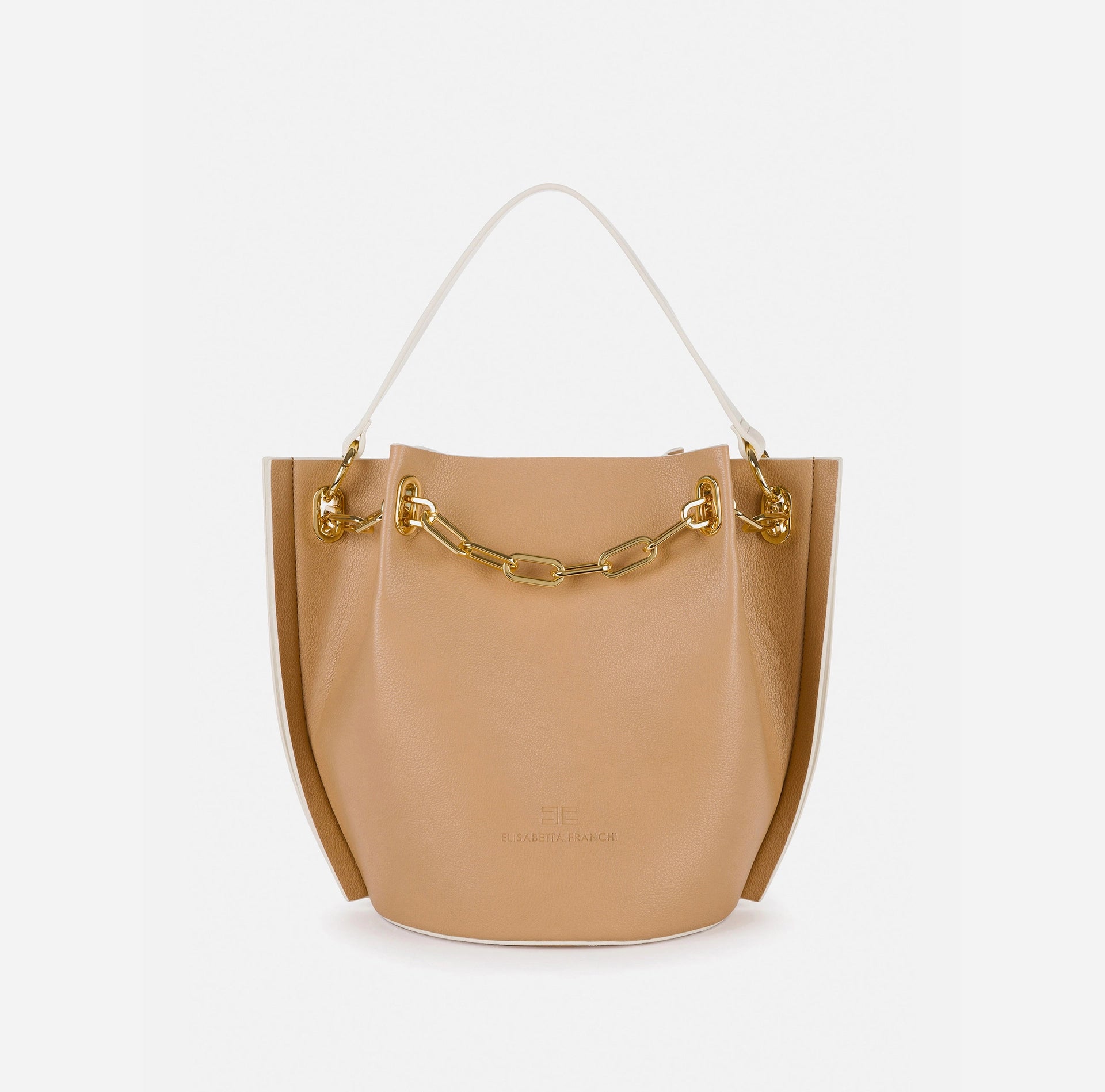 Medium-sized Elisabetta Franchi Dune bucket bag with a strap for carrying it in hand or on your shoulder. An everyday bag that can be used to complete a refined, classy outfit to not go unnoticed. The light gold detail of the chain embellishes this complex handcrafted bag.