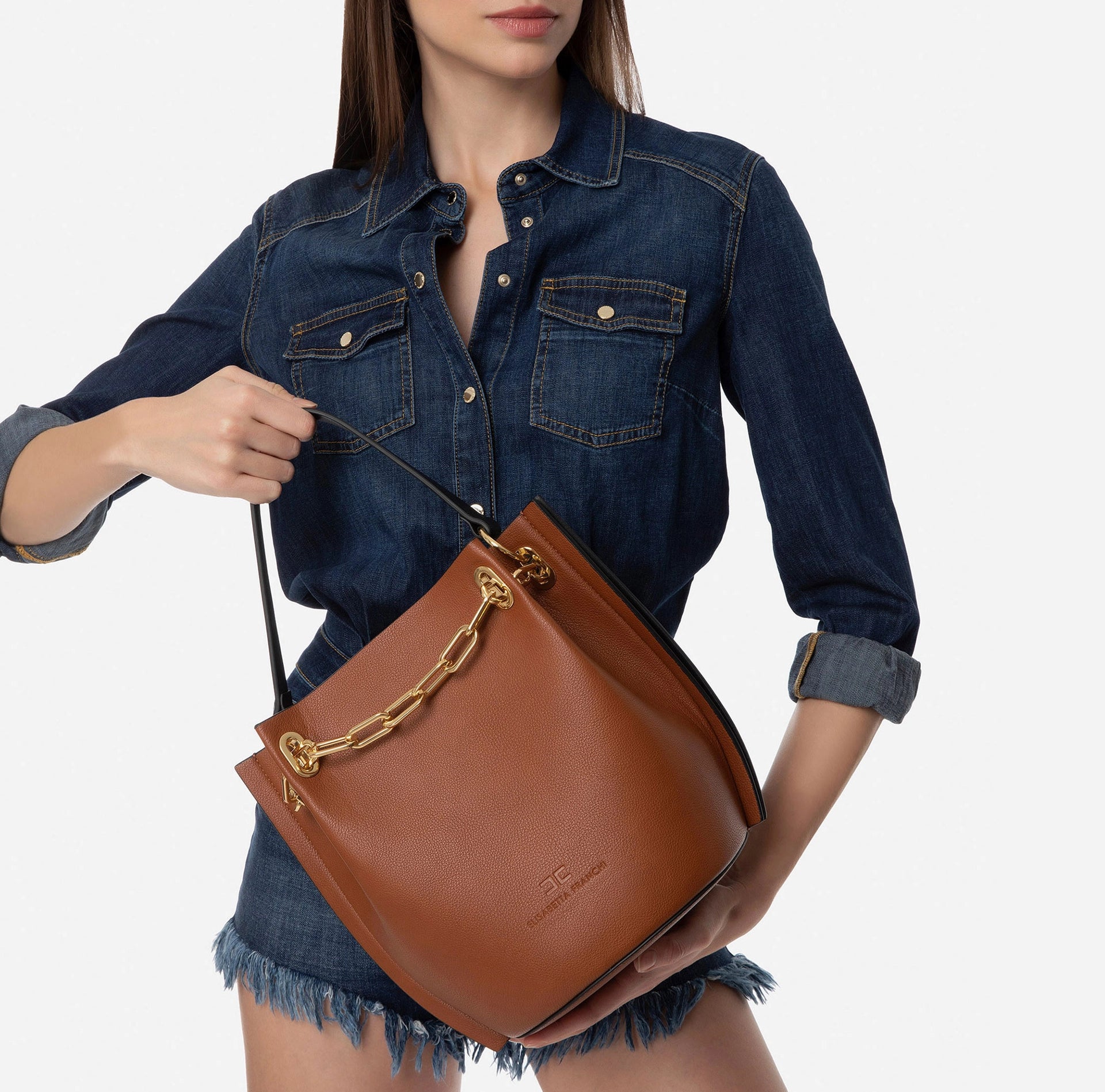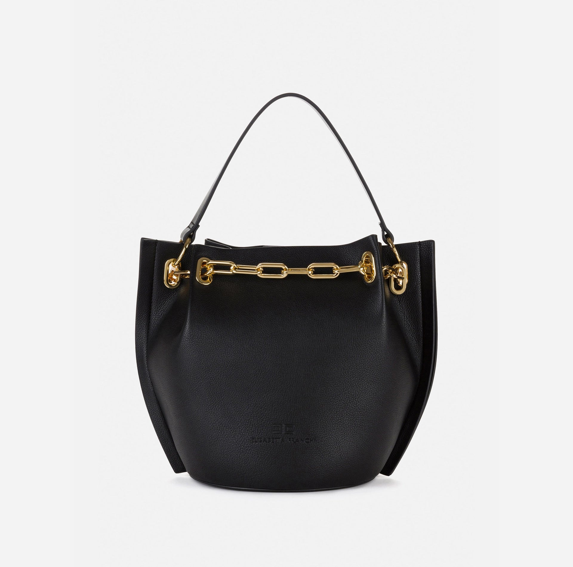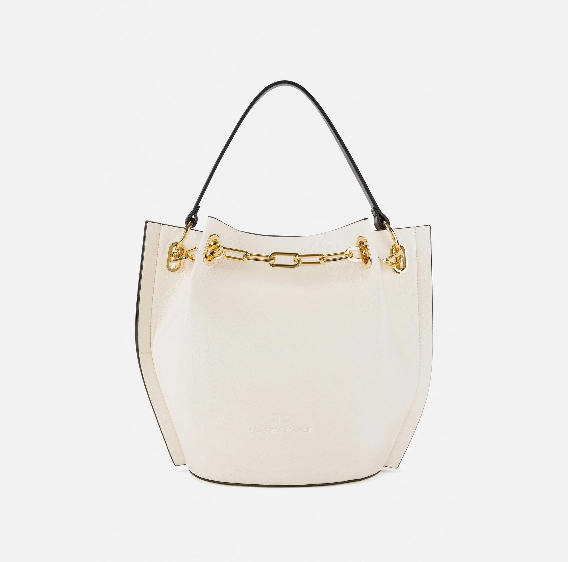 Medium-sized Elisabetta Franchi Dune bucket bag with a strap for carrying it in hand or on your shoulder. An everyday bag that can be used to complete a refined, classy outfit to not go unnoticed. The light gold detail of the chain embellishes this complex handcrafted bag.