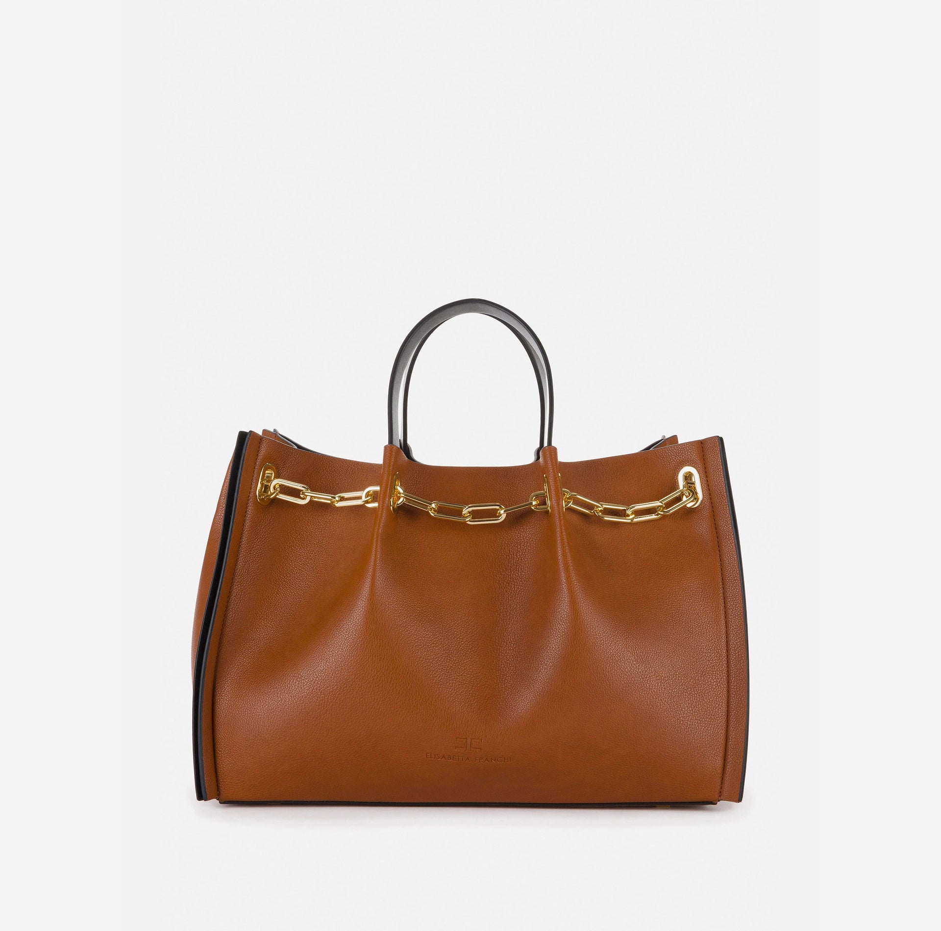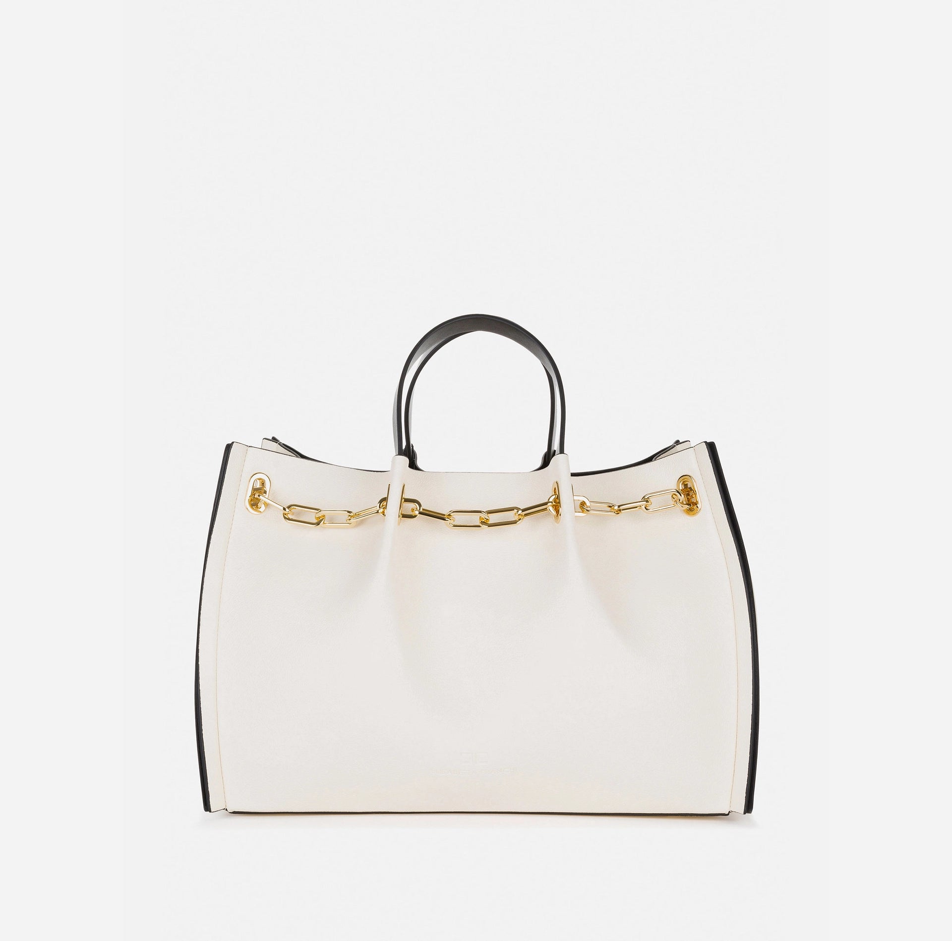 Large Elisabetta Franchi Dune shopper bag. An everyday bag that can be used to complete a refined, classy outfit to not go unnoticed. The light gold detail of the chain embellishes this complex handcrafted bag.