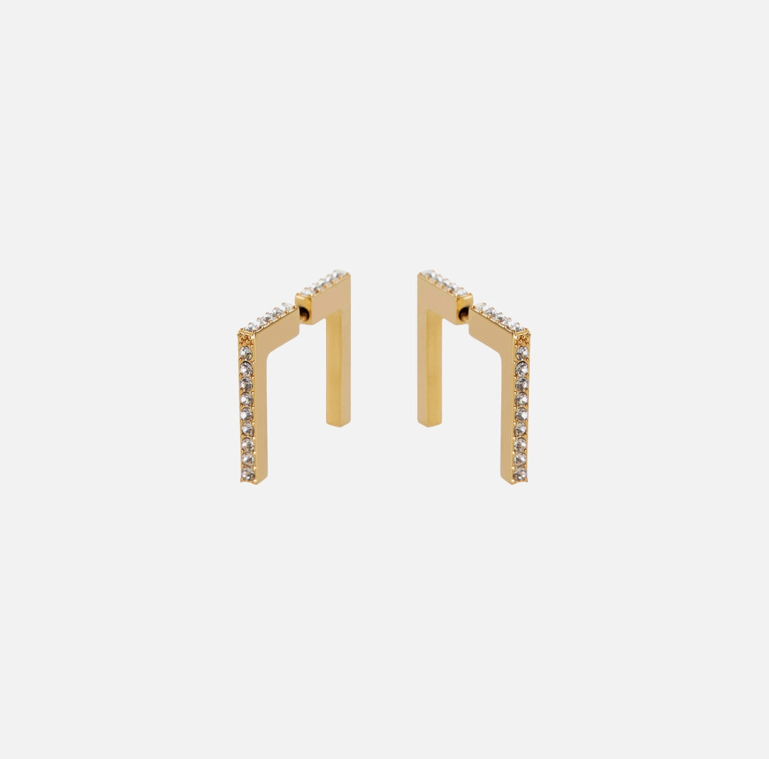 Bar stud earrings made of metal with a golden finish, embellished with diamanté rhinestones. Closure with needle.