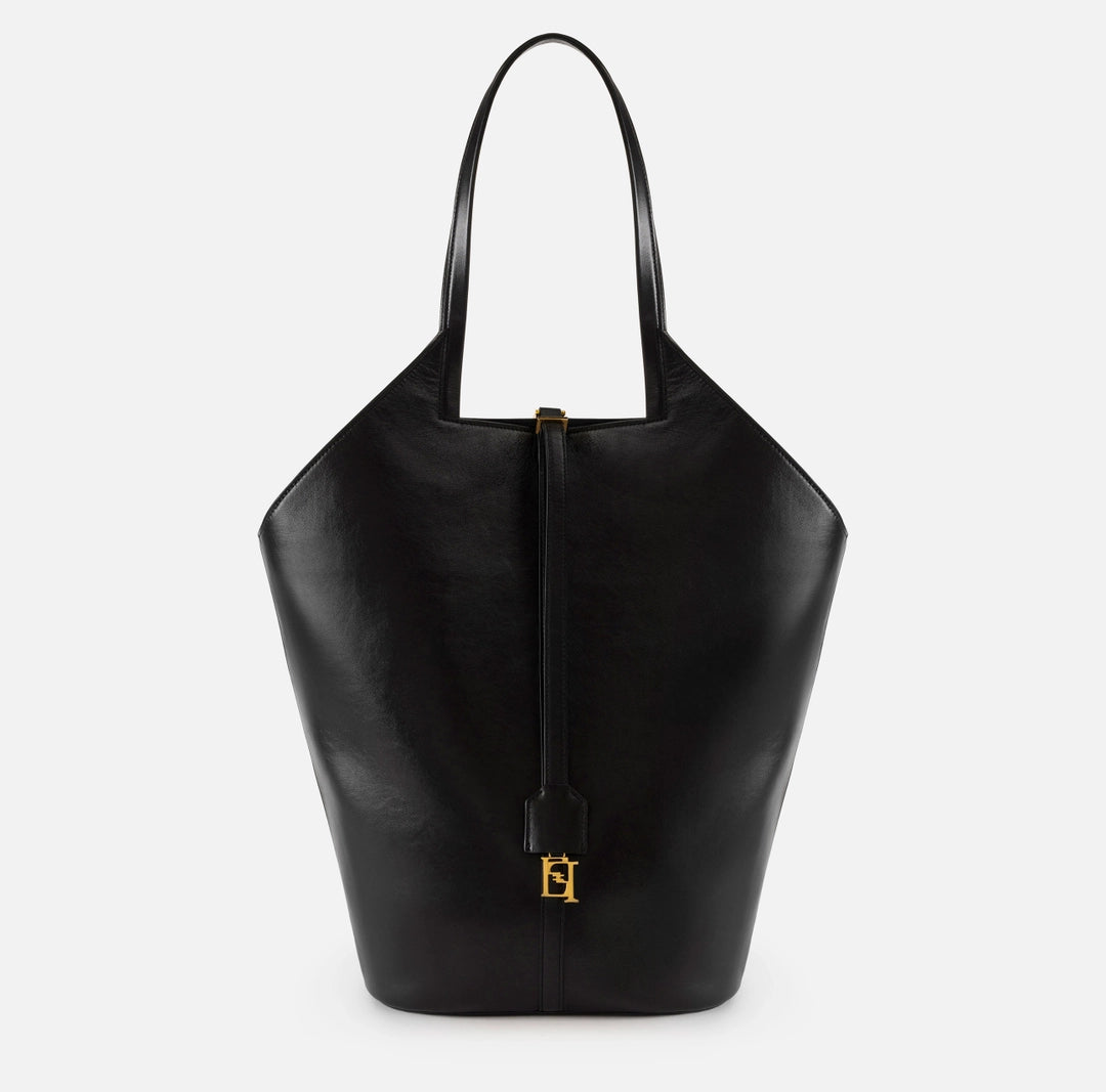 Big hobo bag in leather with geometric lines and to be worn over the shoulder. It features a central strap as a clasp embellished with a golden metal logo travel charm.