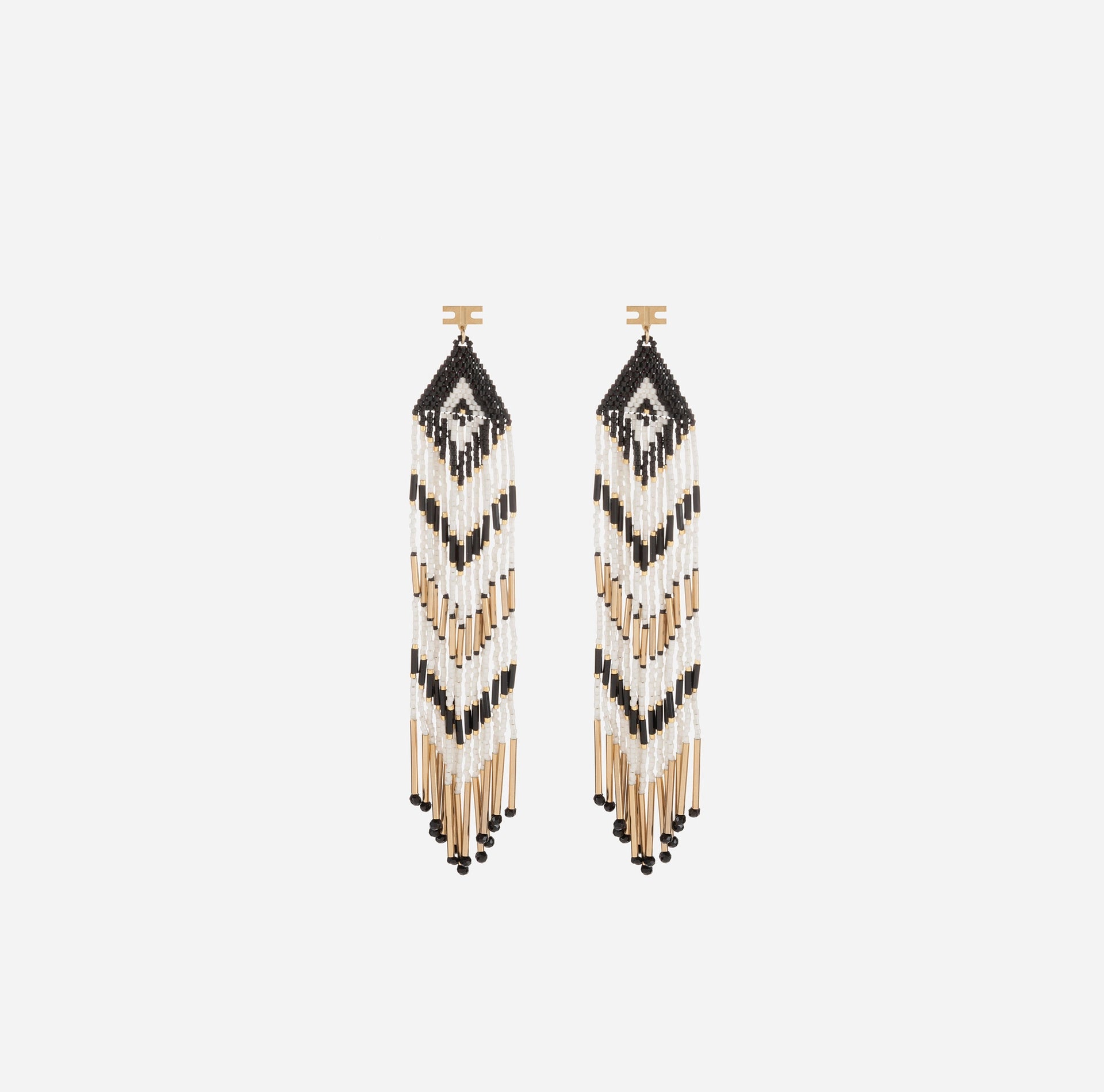 Extra-long frame beaded earring with rhombus pattern. Needle and clasp closure. Gold plating.