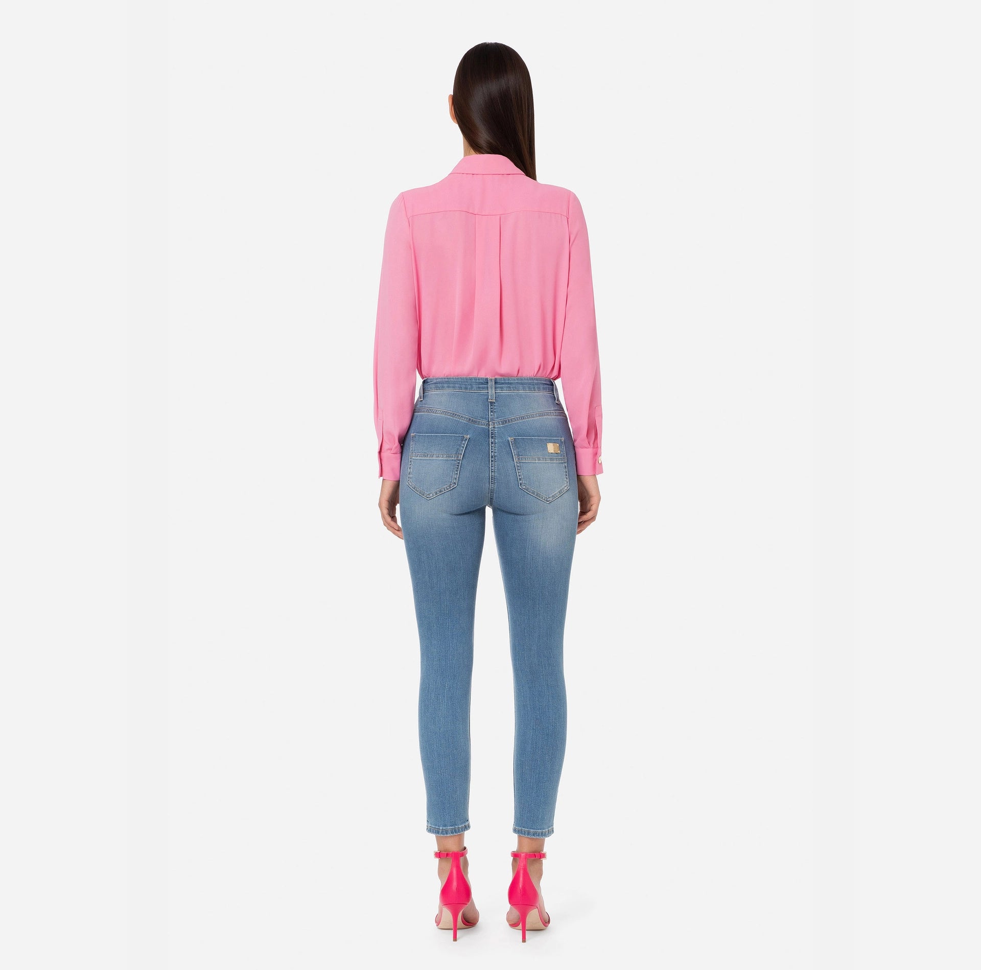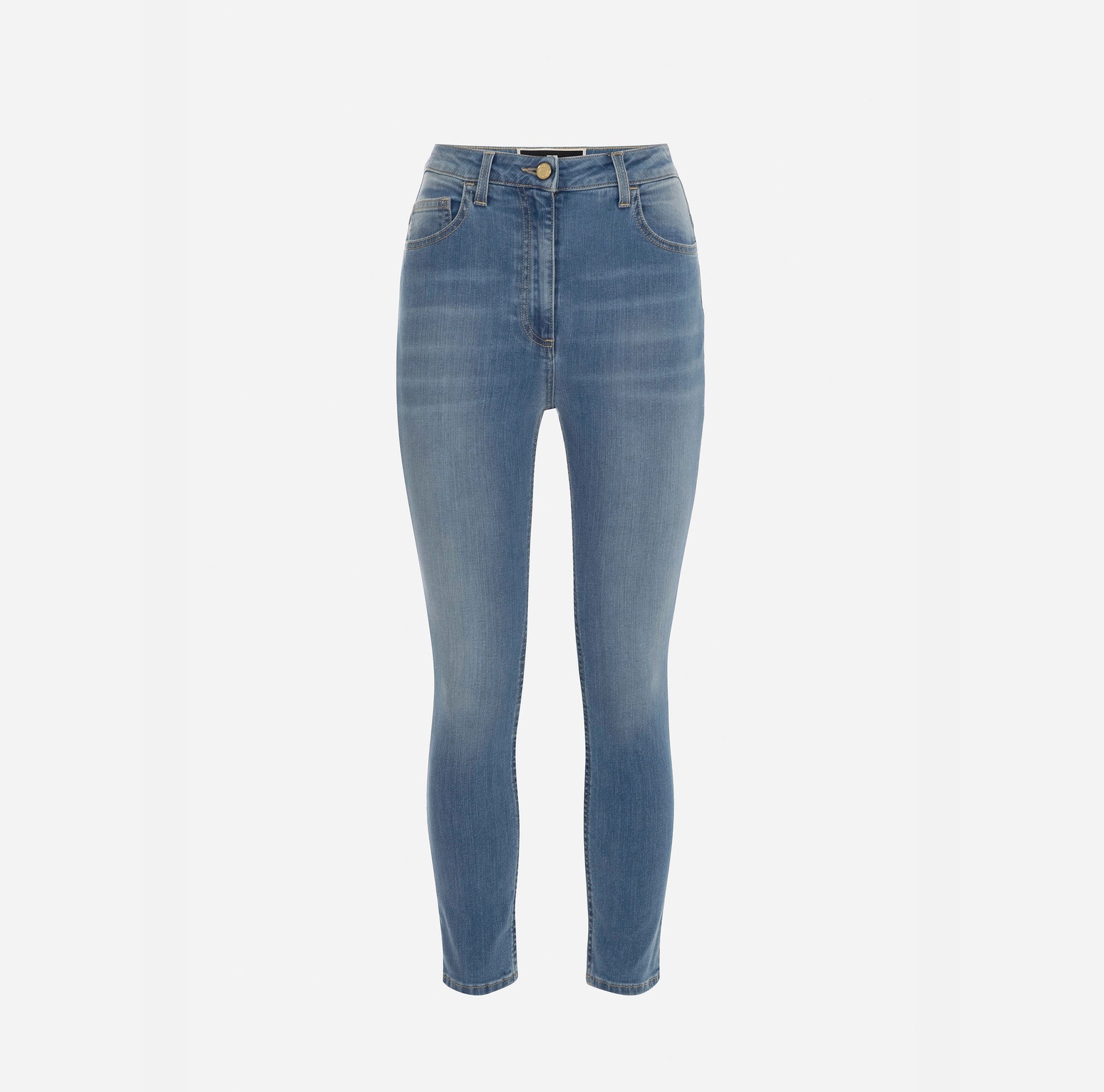 Five-pocket jeans, high waist and skinny leg. Golden metal plaque positioned on the back pocket.