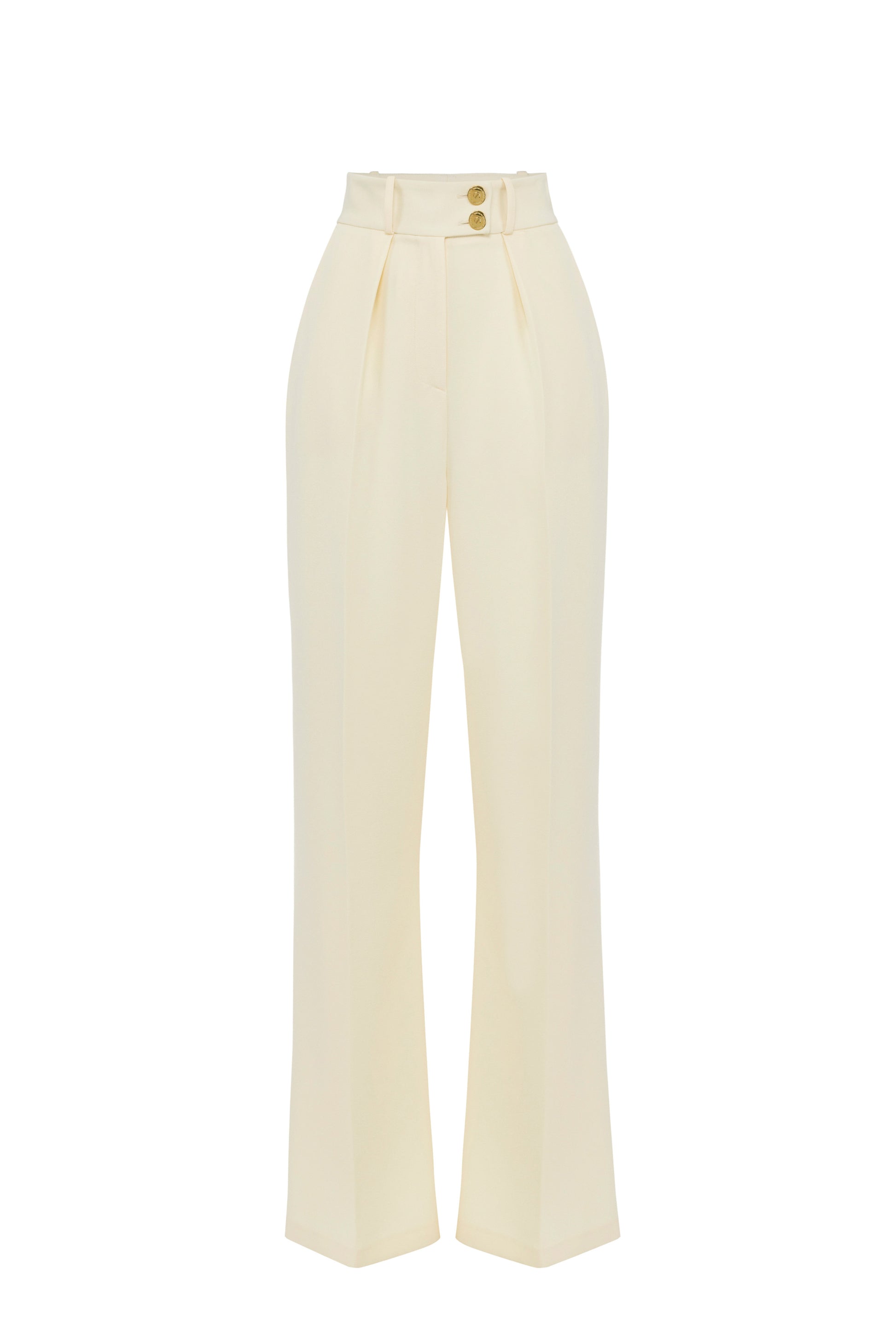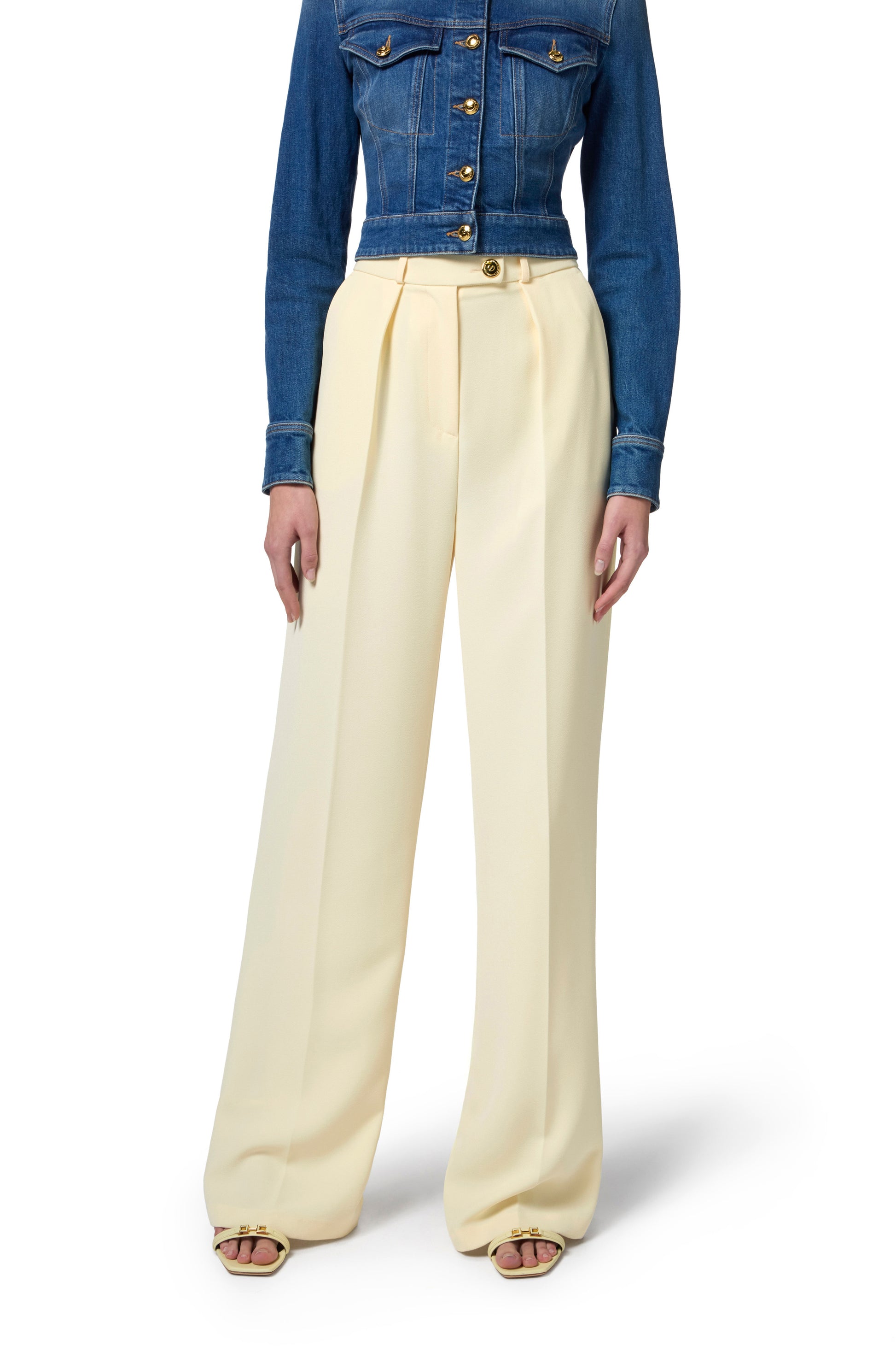 Trousers in flowing crêpe fabric with straight fit. The workmanship with darts provides sophisticated volumes while the golden metal buttons with logo decorate the waist and the back flaps.