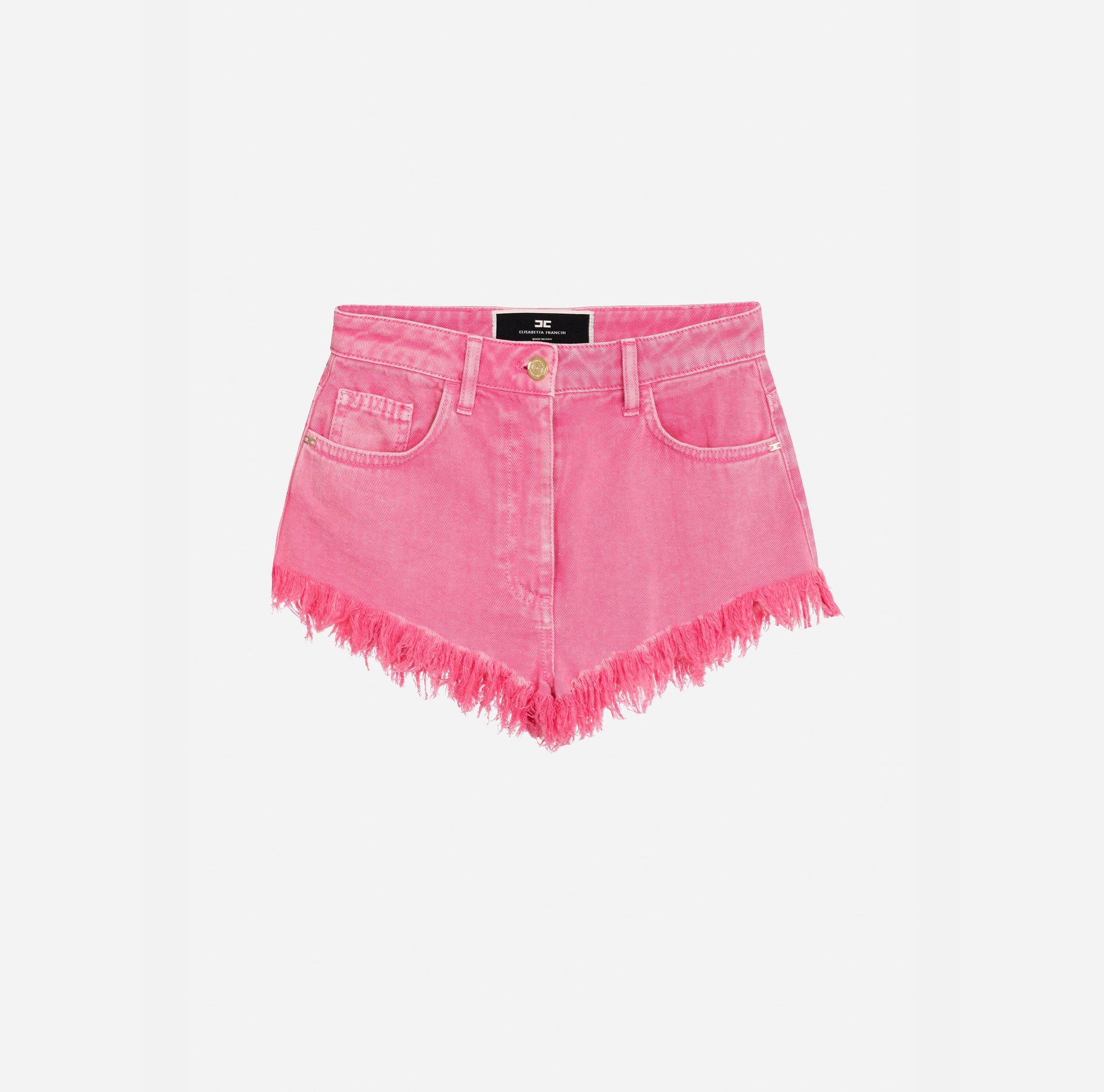 Garment-dyed cotton shorts, waistline, and fringing at the bottom. On the garment, back with a diamond pattern with leather.