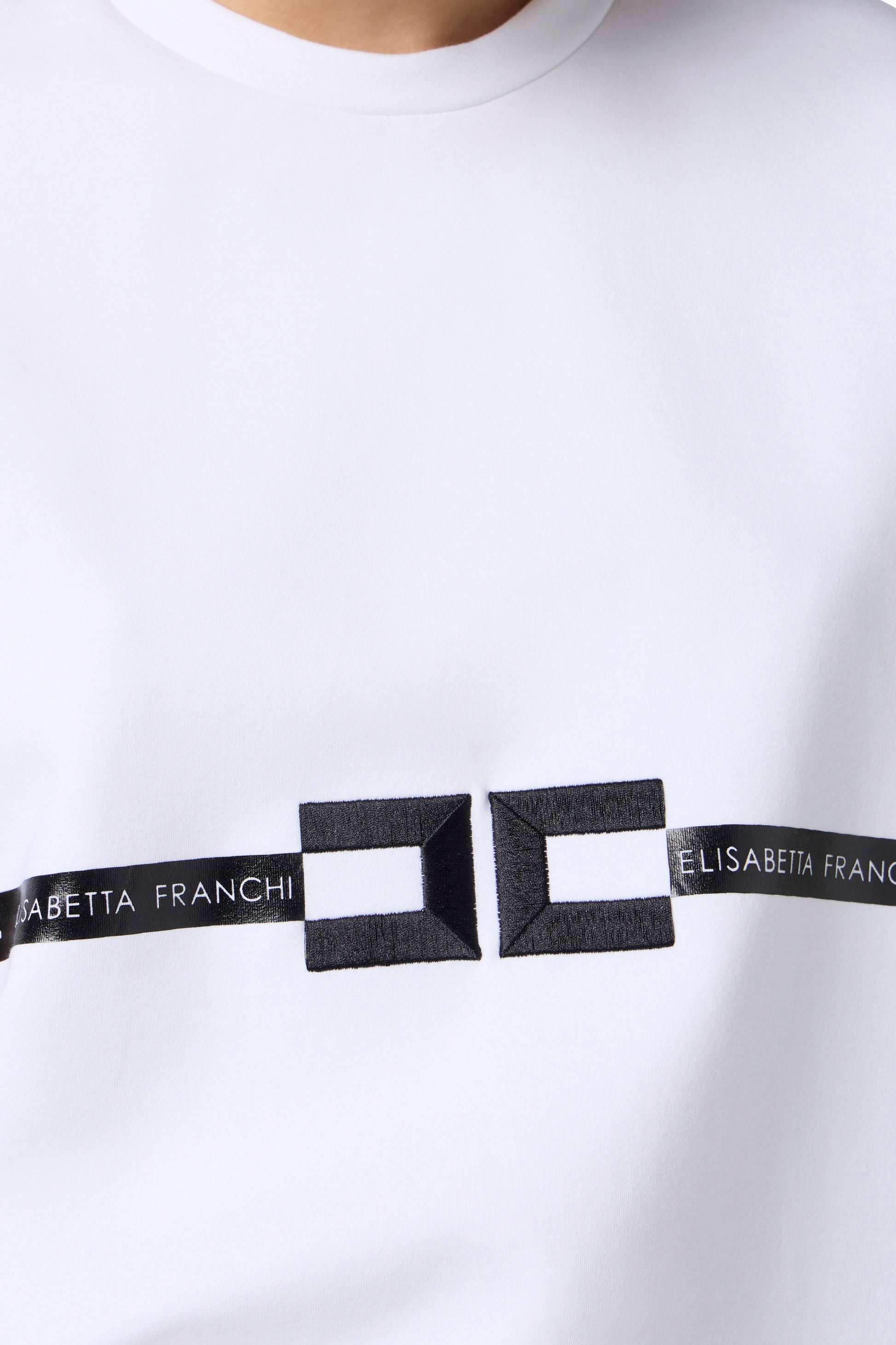 Short-sleeved heavy cotton jersey T-shirt. It is characterised by contrasting details such as the central embroidered logo on the front, enhanced by the printed band with patent leather effect. Oversized fit.