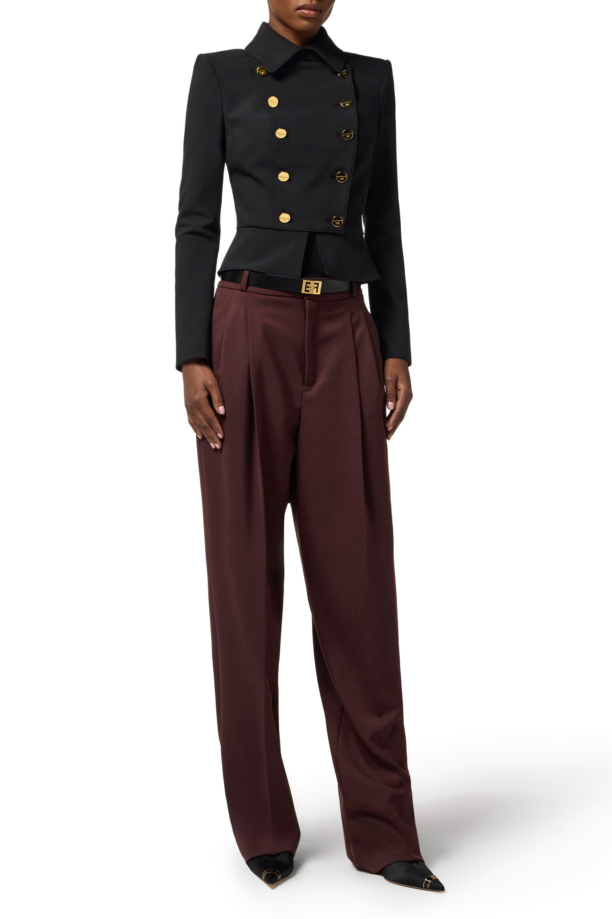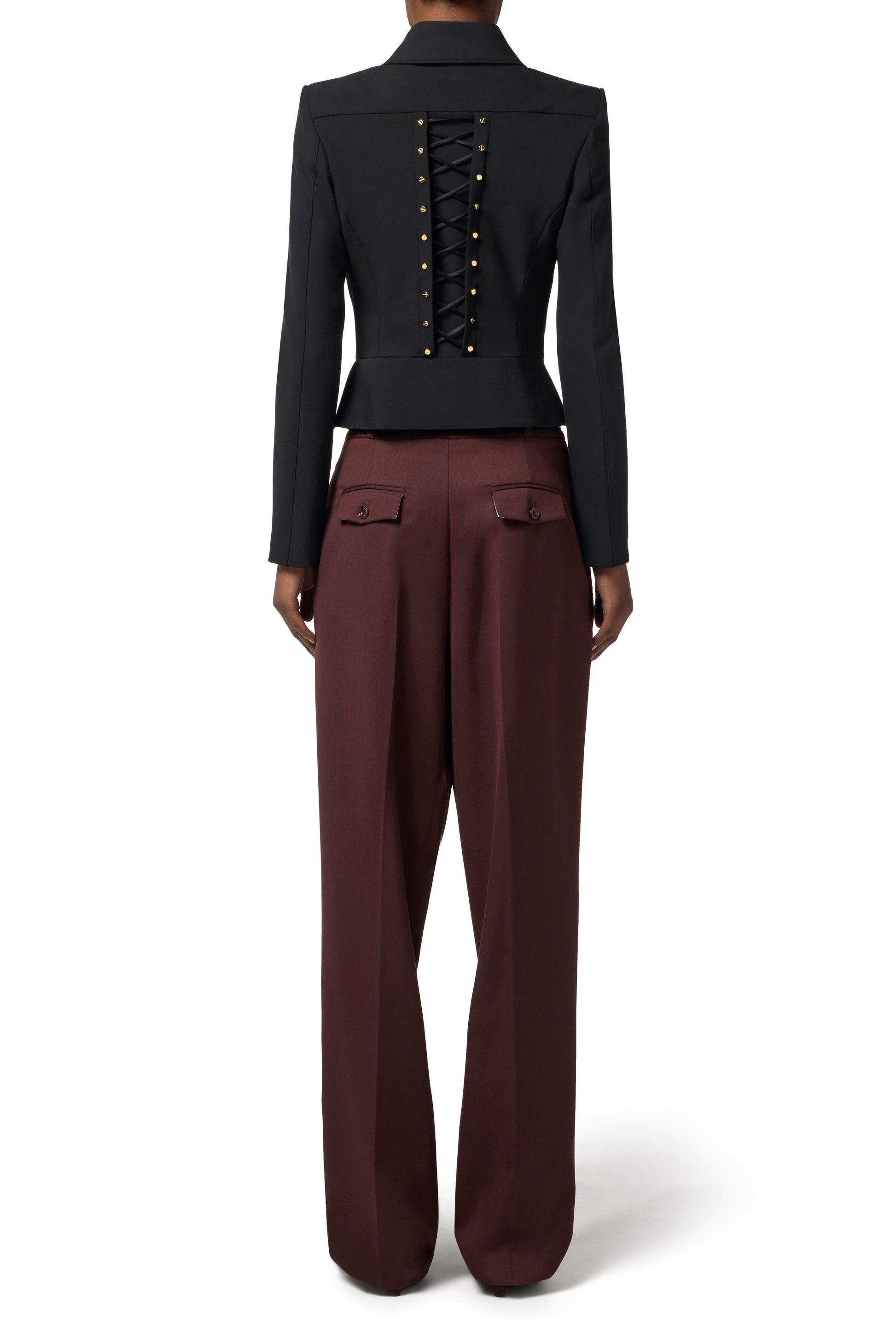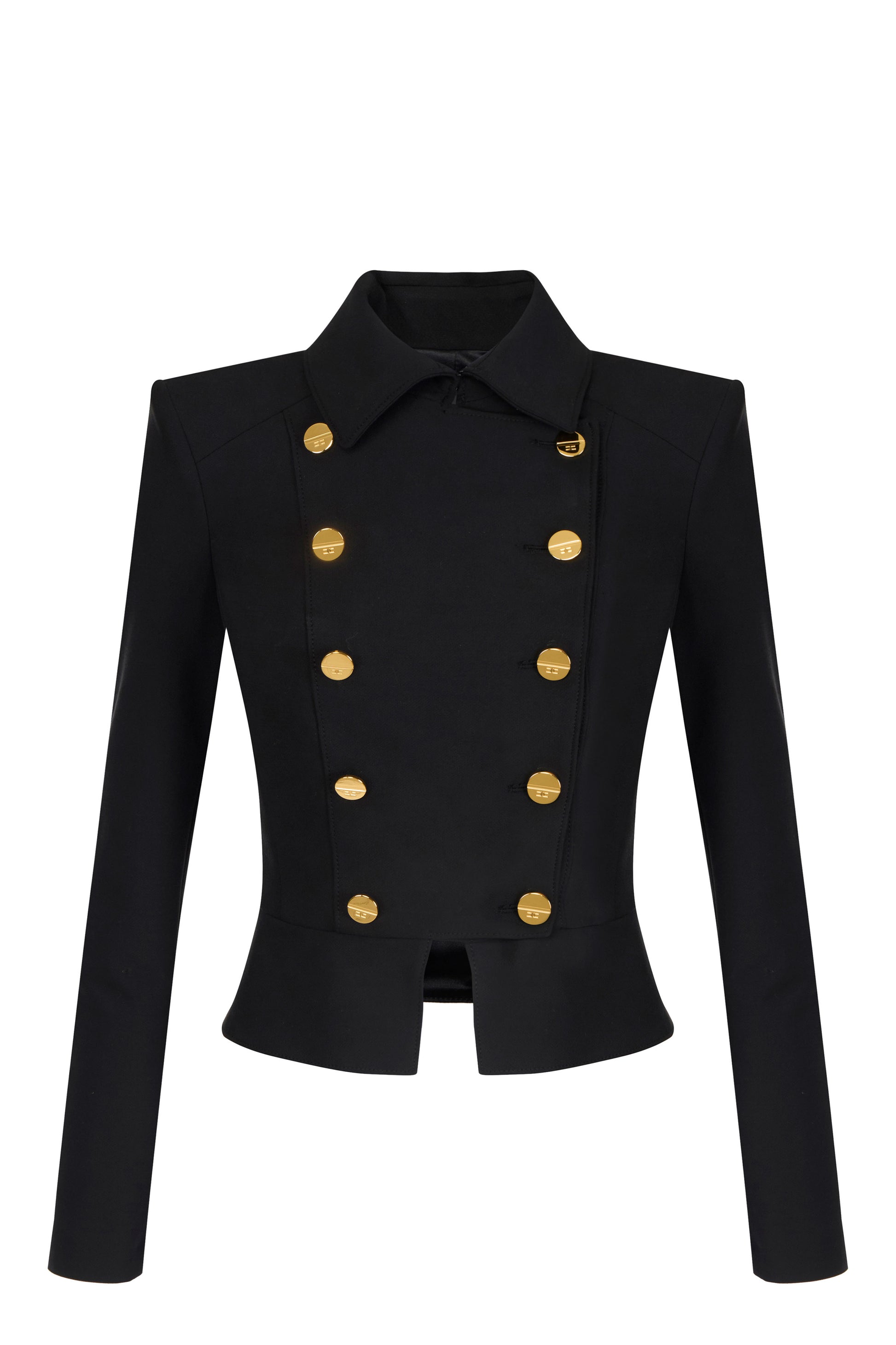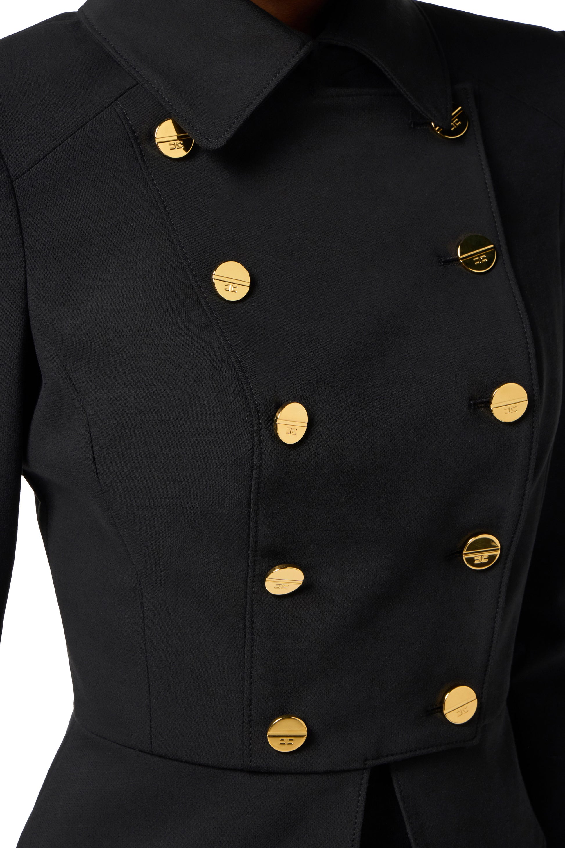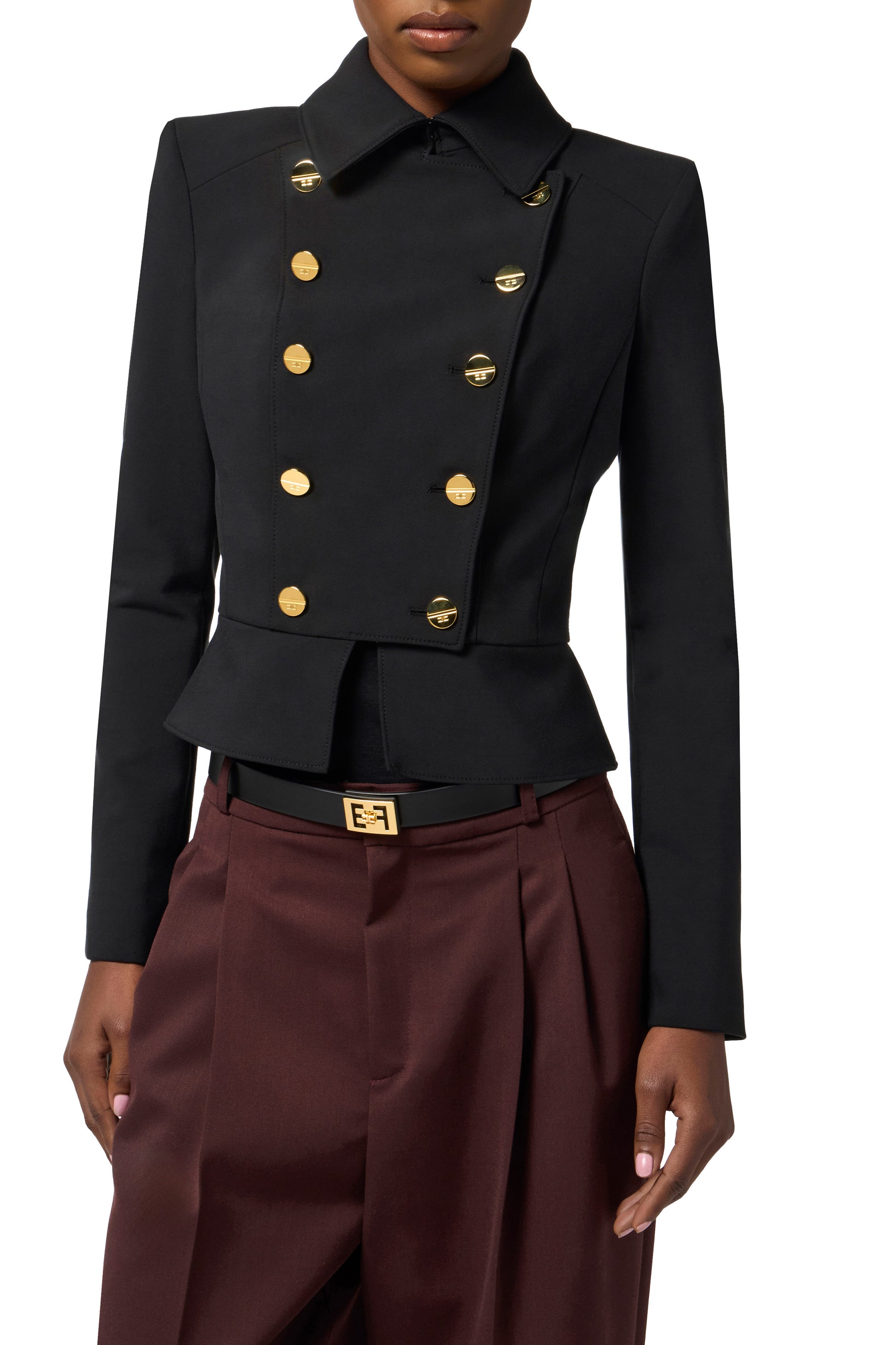 Jacket in bi-elastic fabric with slim fit. It has structured shoulders, shirt collar and long sleeves. The double-breasted fastening is highlighted by the peplum at the waist. Golden metal buttons provide luminous details to the garment. The back with criss-cross lacing creates a striking effect.