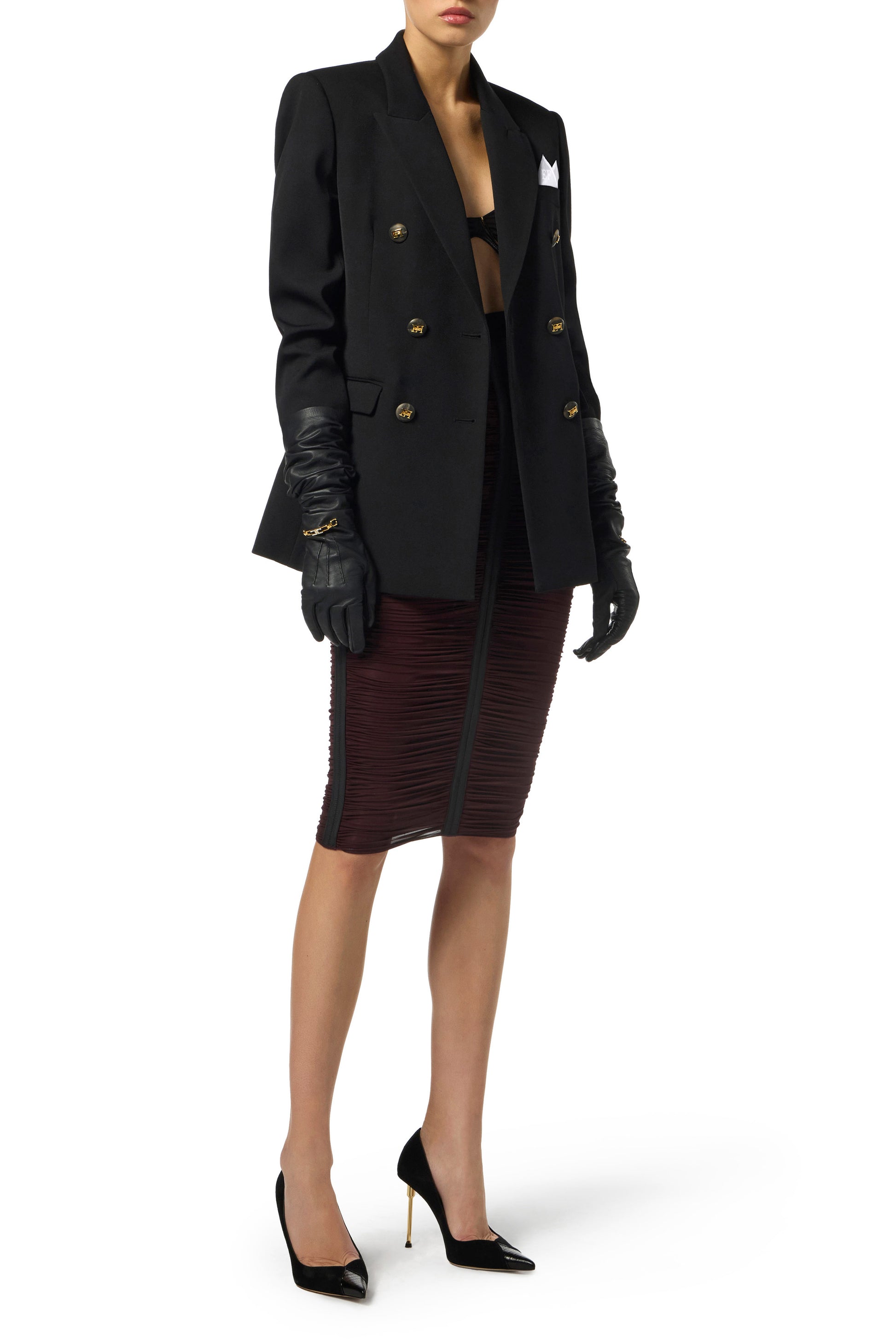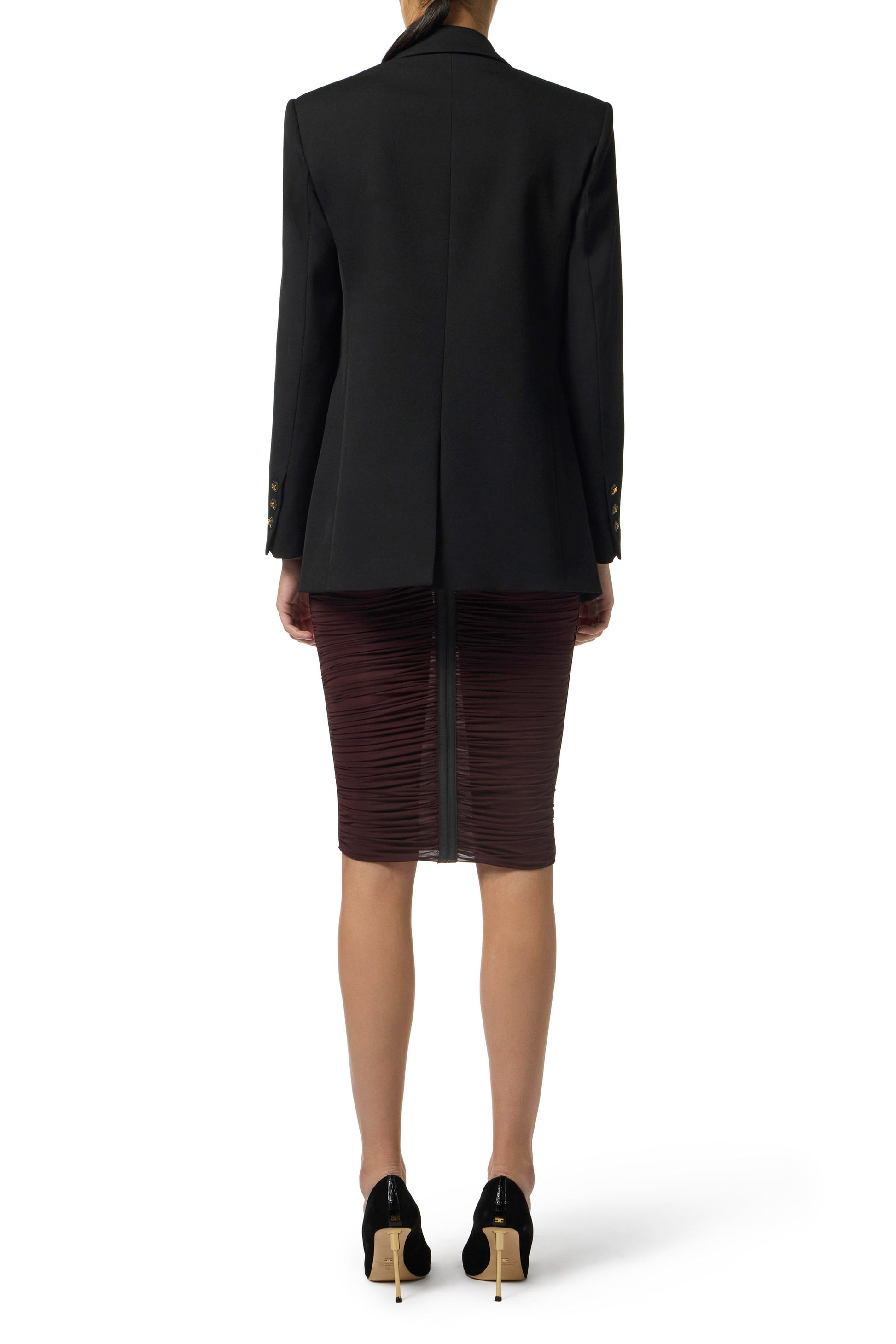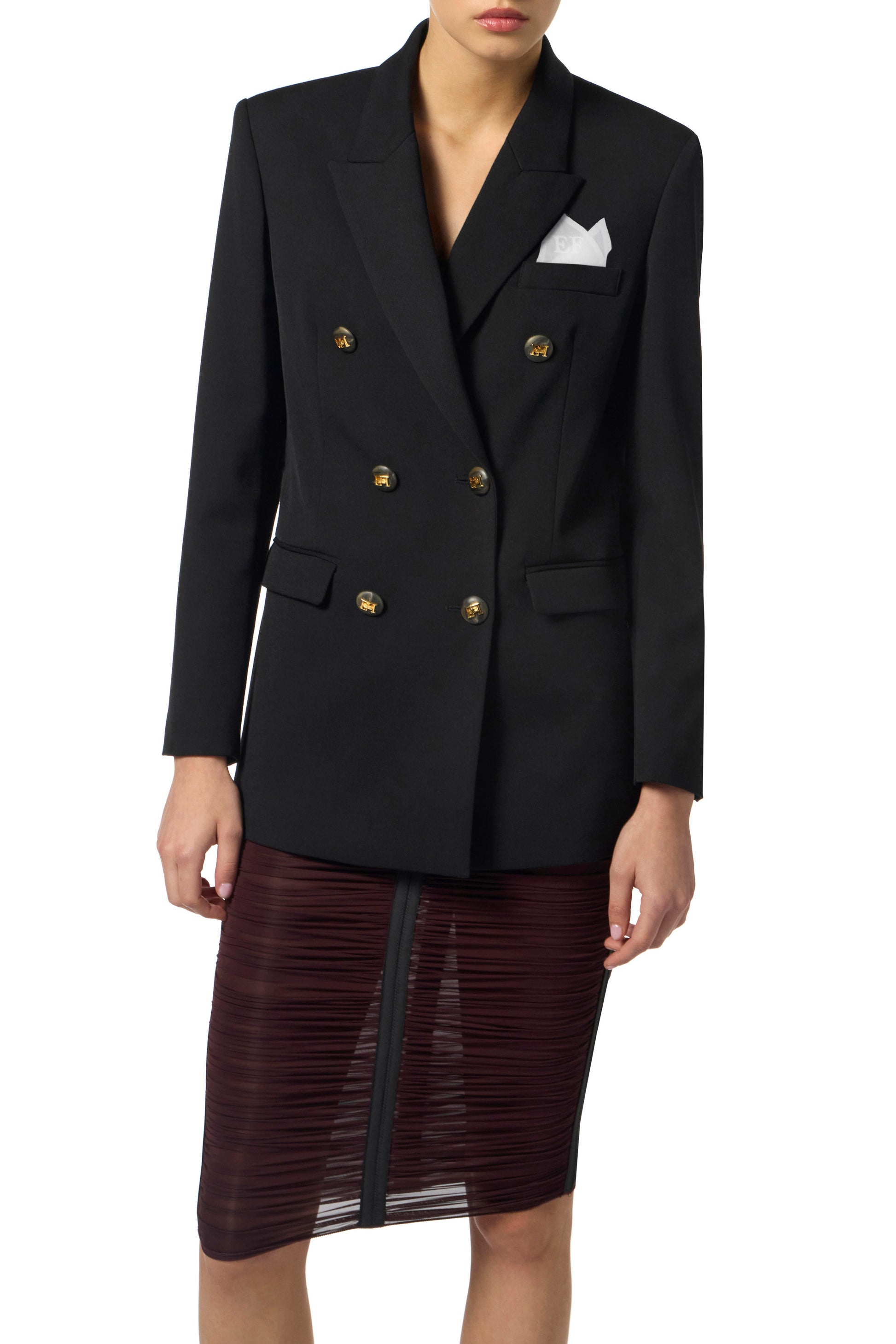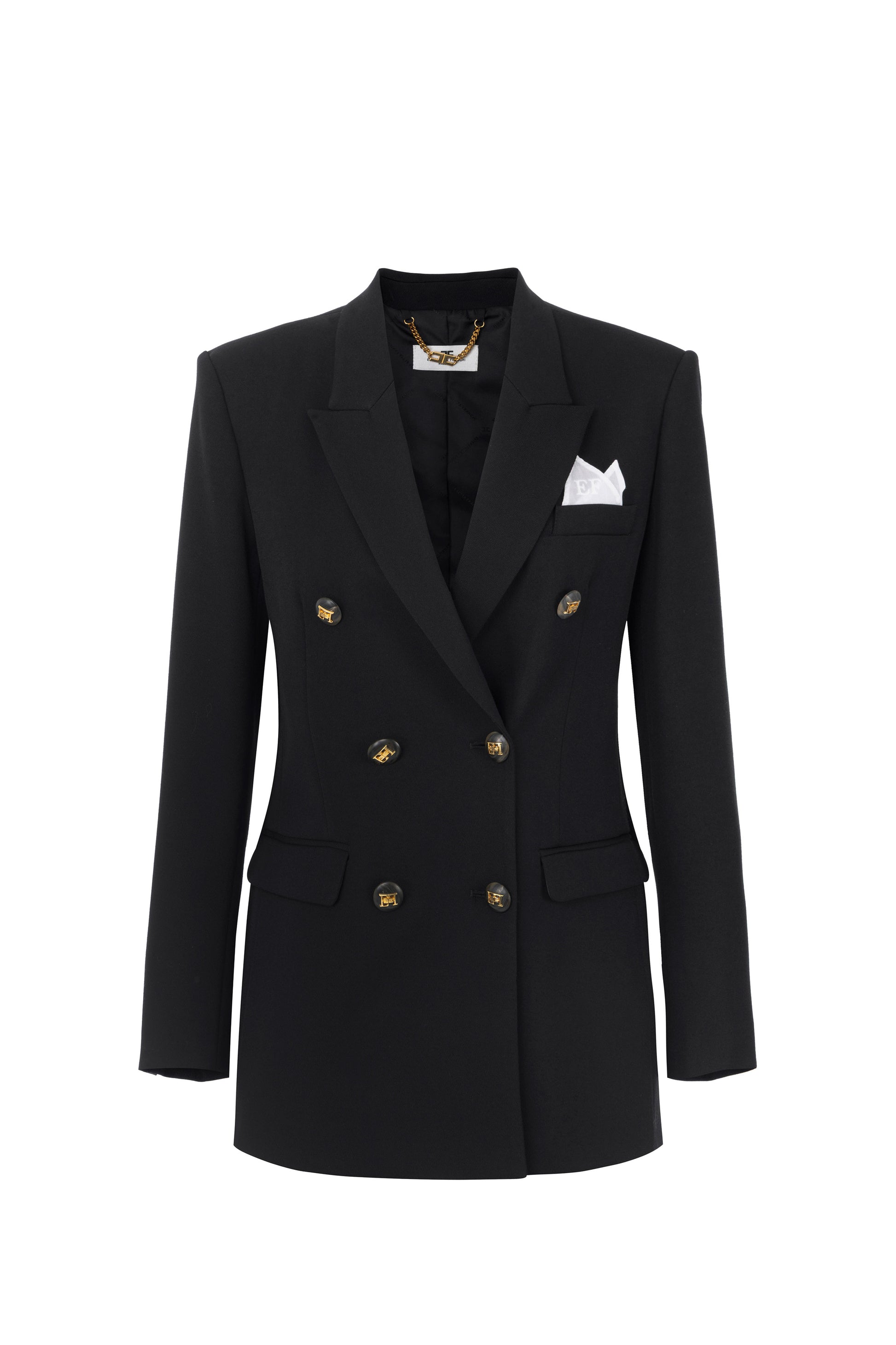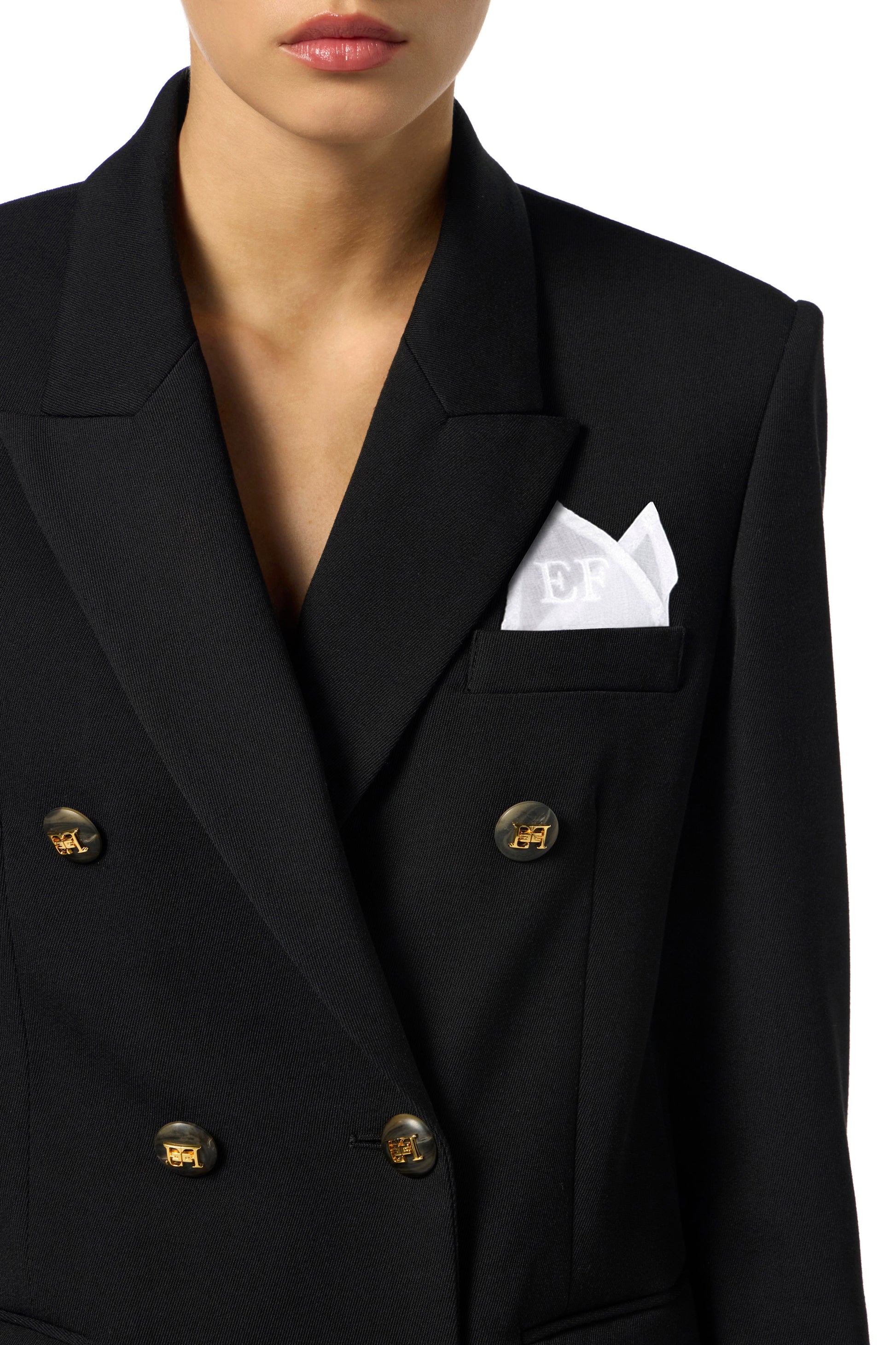 Double-breasted cotton gabardine jacket with regular fit. Menswear-inspired, the blazer has structured shoulders, peak lapels and a breast pocket with logo-embroidered cotton muslin pocket square. Statement details with twill weave and embossed logo buttons.