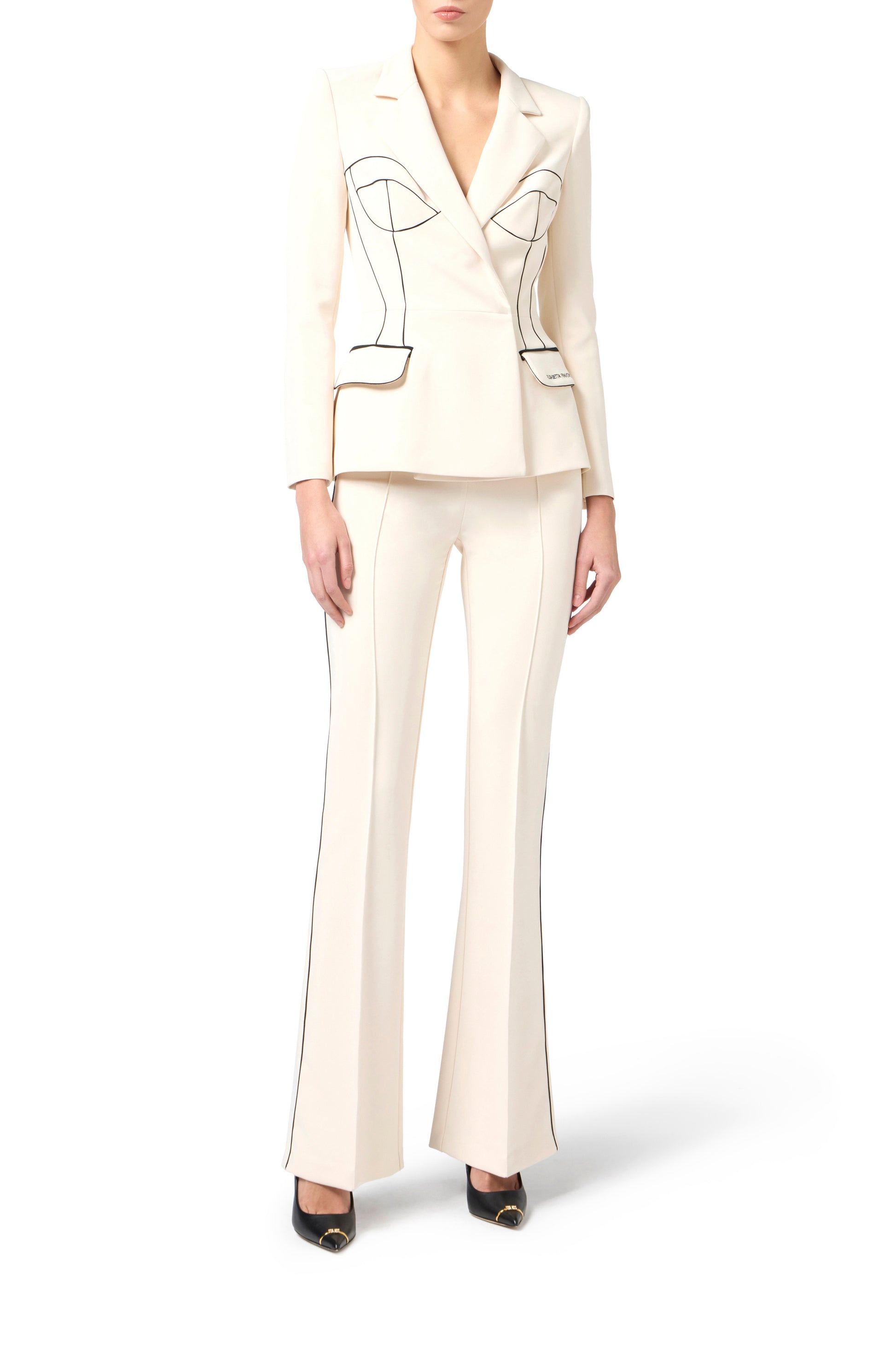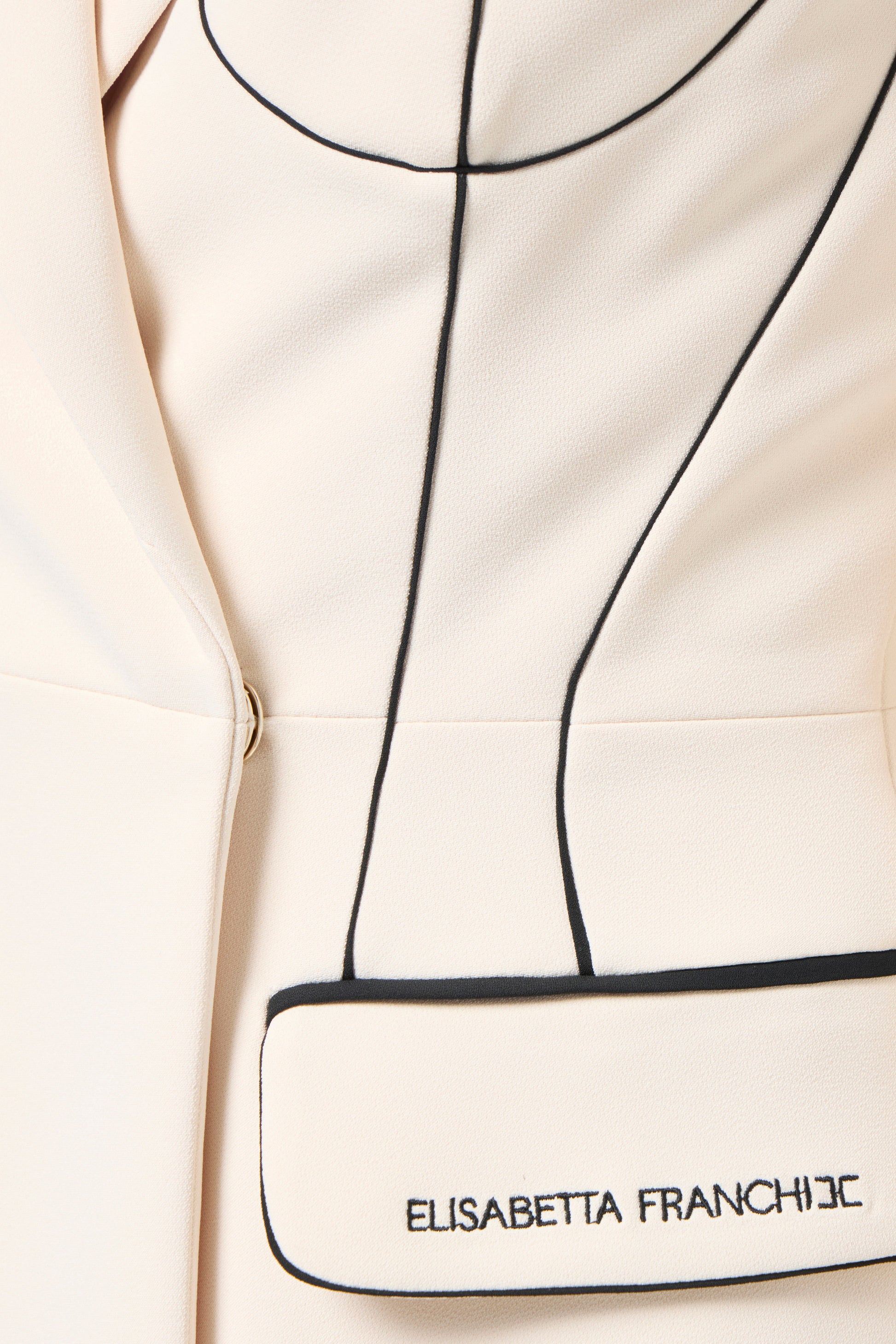 Jacket in lightweight stretch crêpe fabric with slim fit. The blazer has structured shoulders and a collar with lapels, waisted cut and flaps at the hips. It is characterised by its graphic style: contrasting piping details recreate a bustier with a trompe-l’oeil effect. Logo embroidered on one flap.