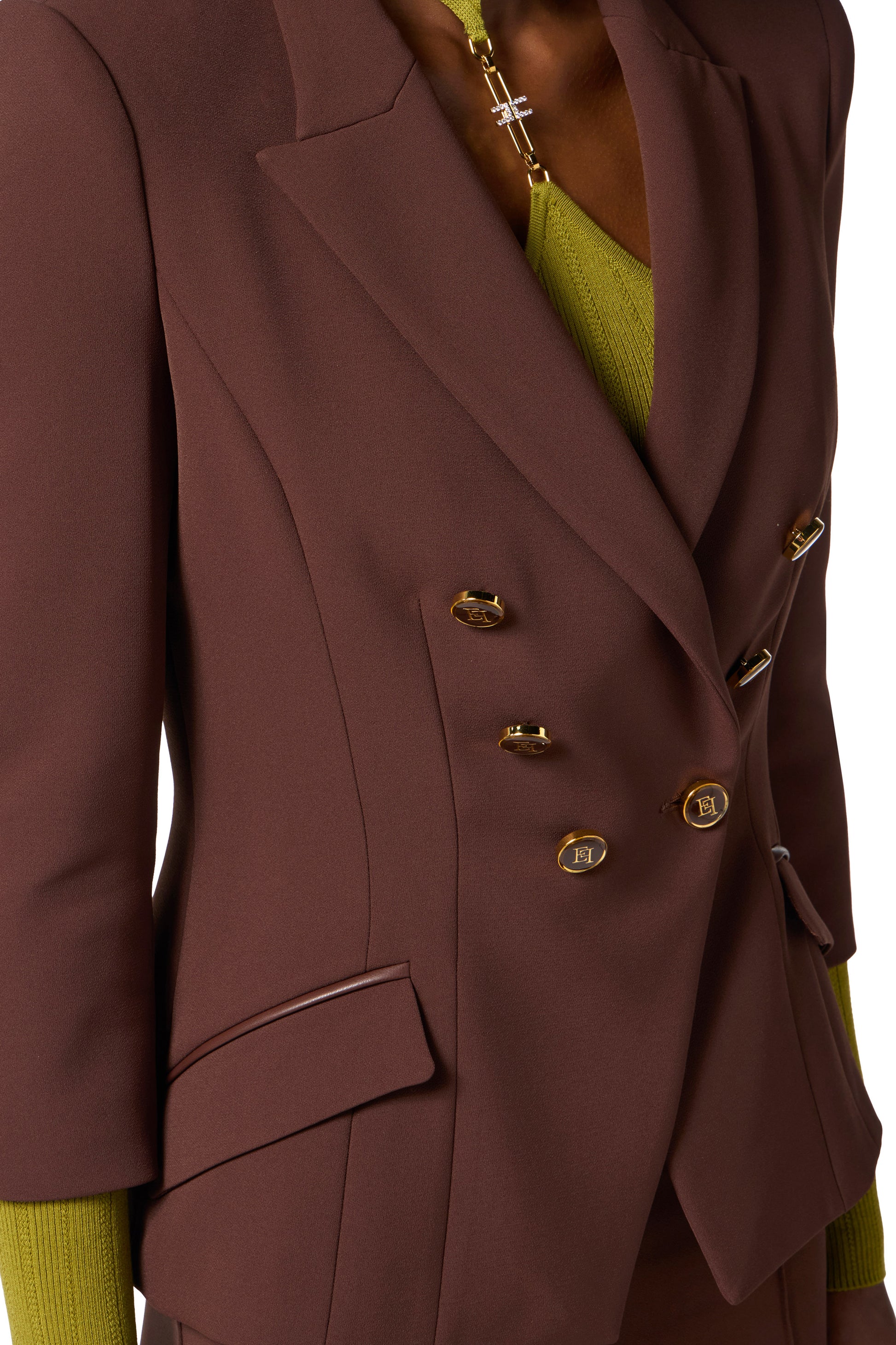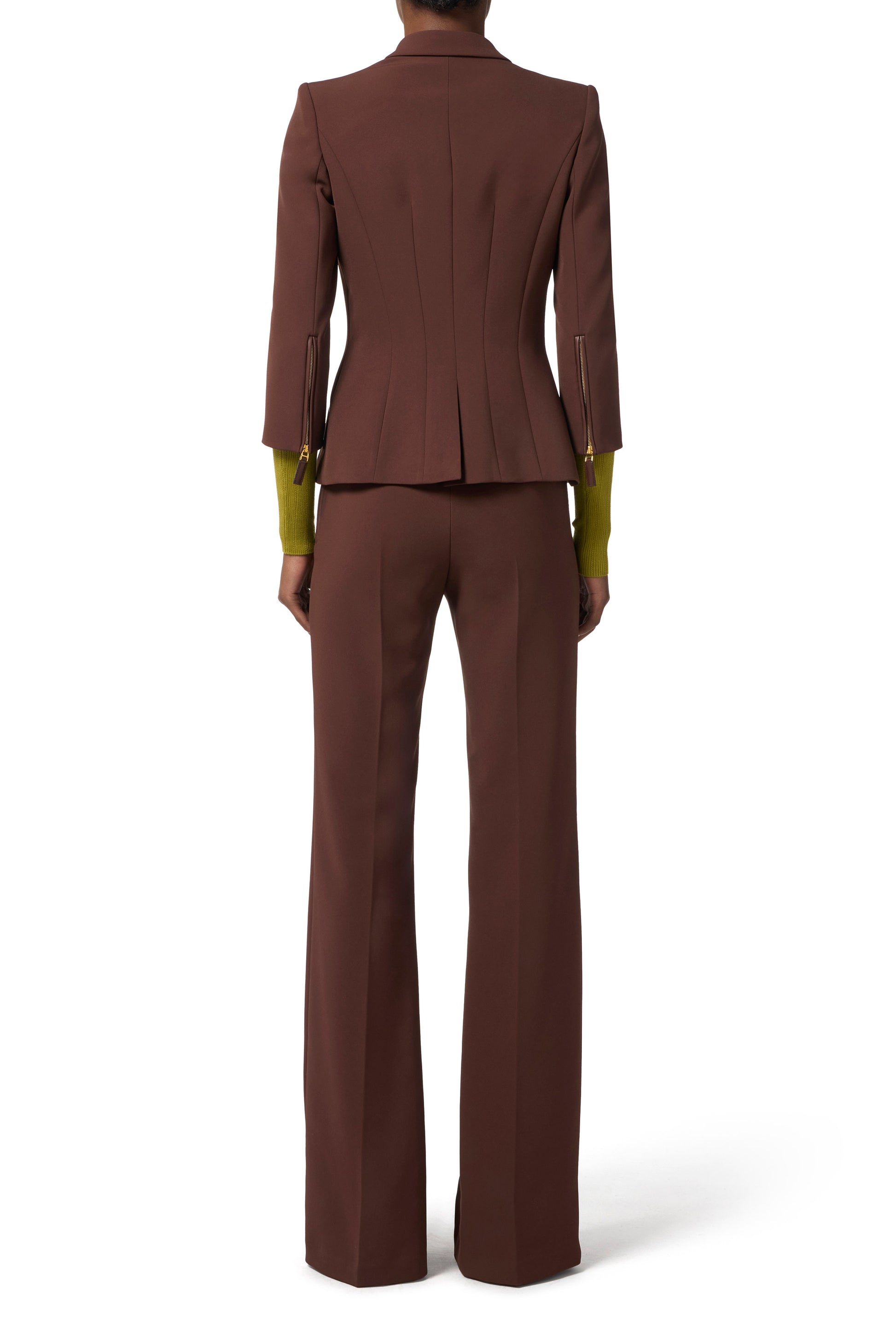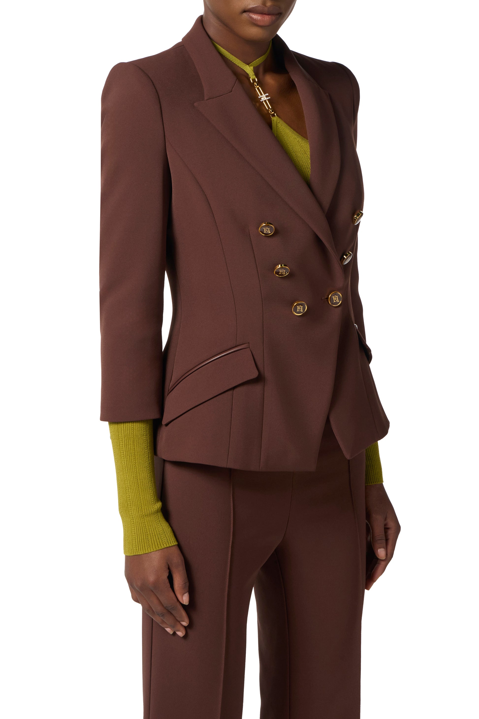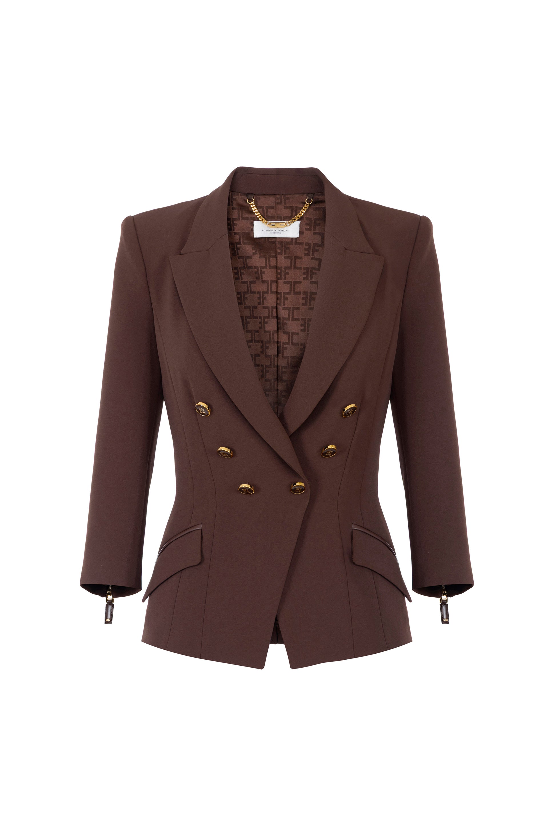 Jacket in double layer crêpe fabric with slim fit. The blazer has structured shoulders, peak lapels, ¾ sleeves, flaps with matching welts. Zips at the bottom of the sleeve provide unique details, while enamelled buttons embellish the garment. Part of the Essential collection, to create the perfect wardrobe.