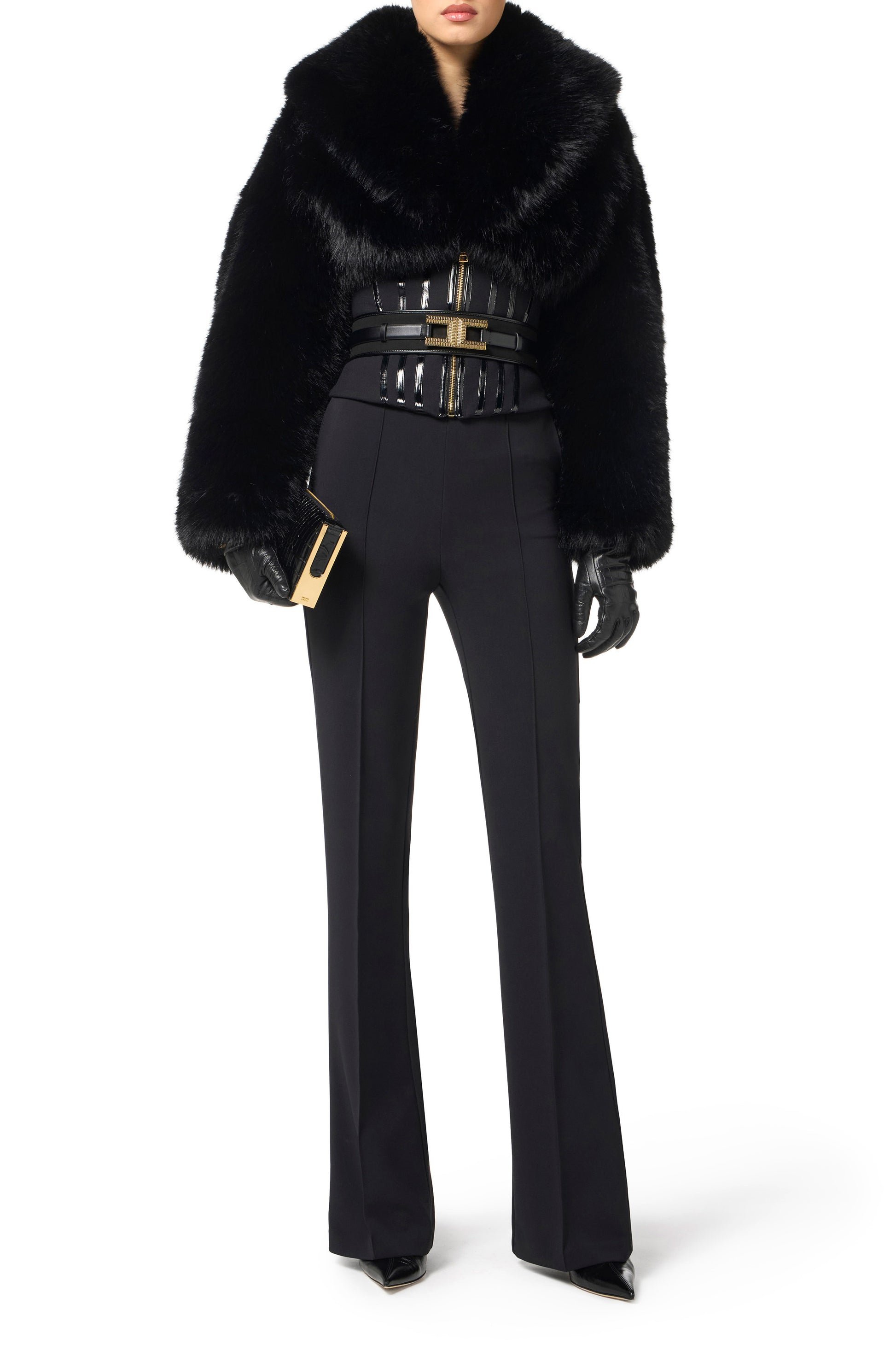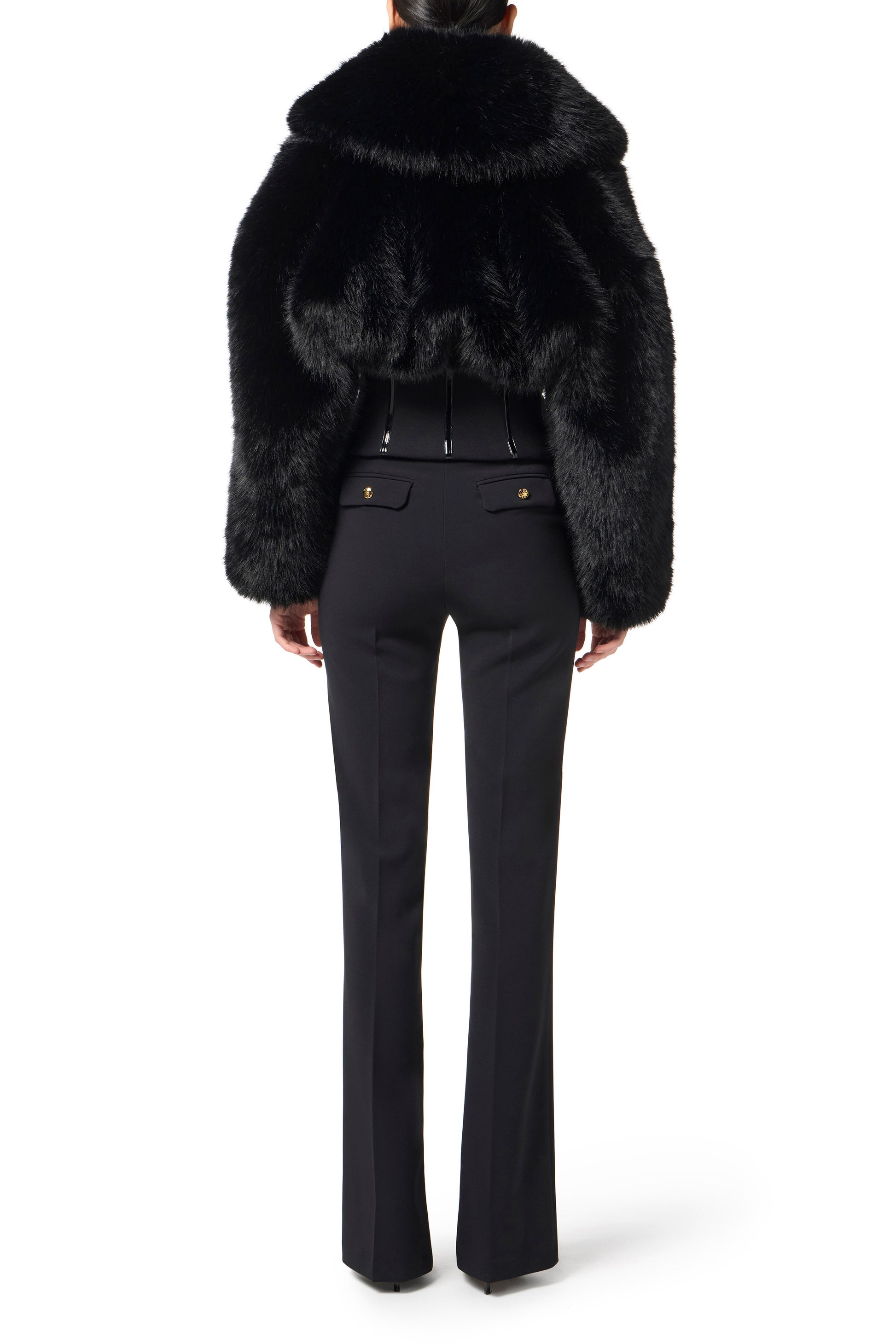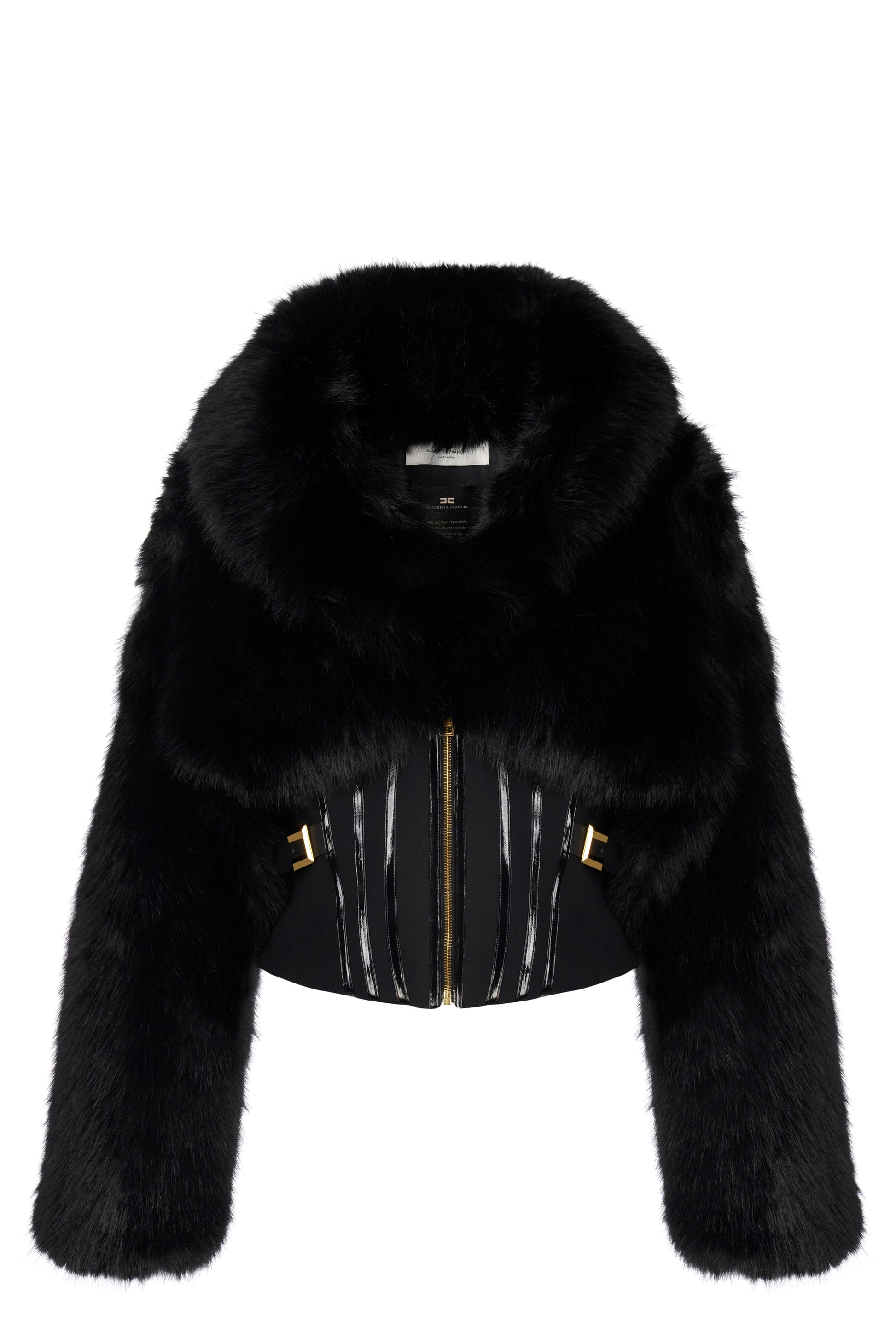Fur-effect textured jacket with an oversized fit. It stands out for its wrap-around collar and sleeves. The waist is defined by the double-layer crêpe bustier construction, embellished with vinyl details and decorative frogs on the hips.