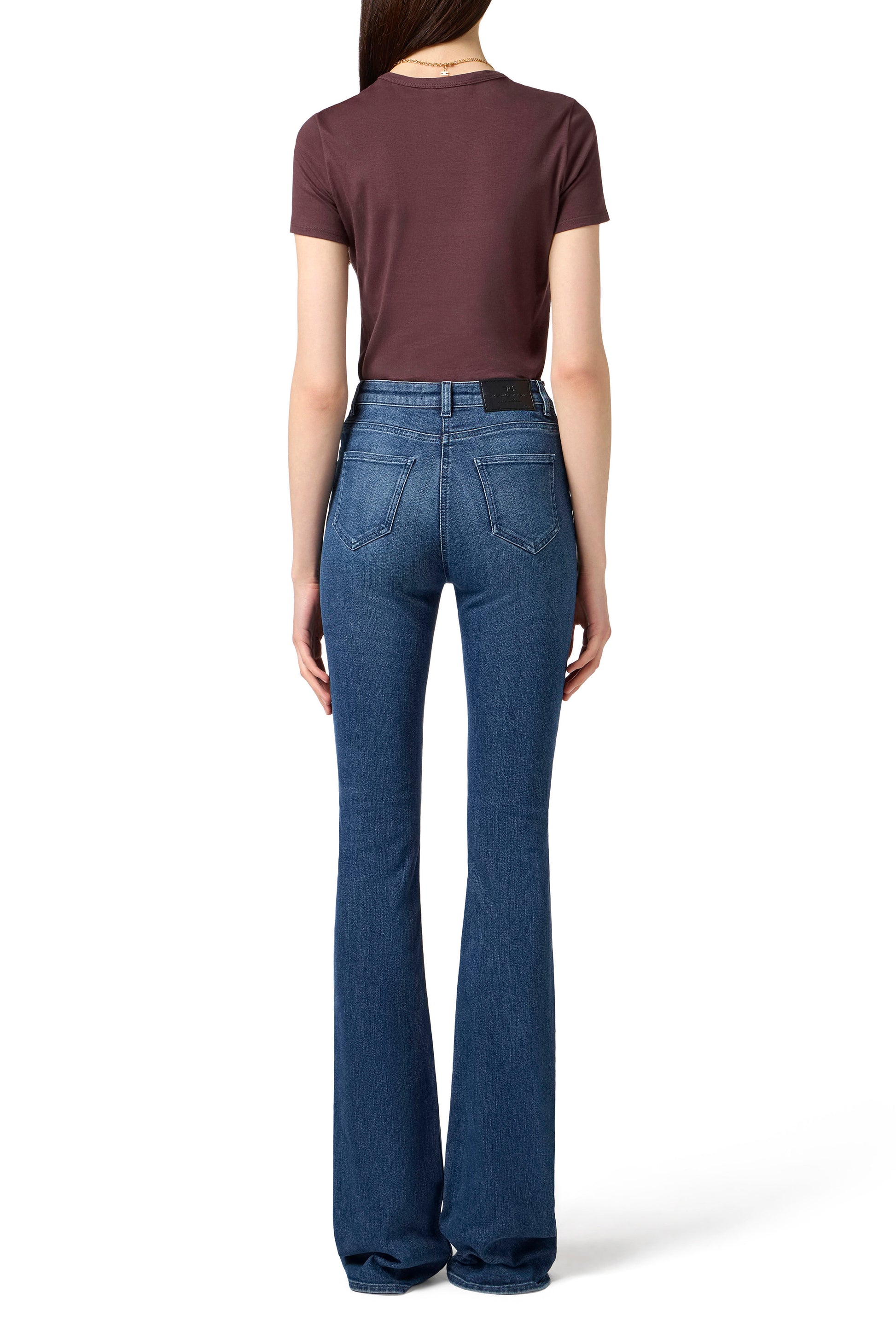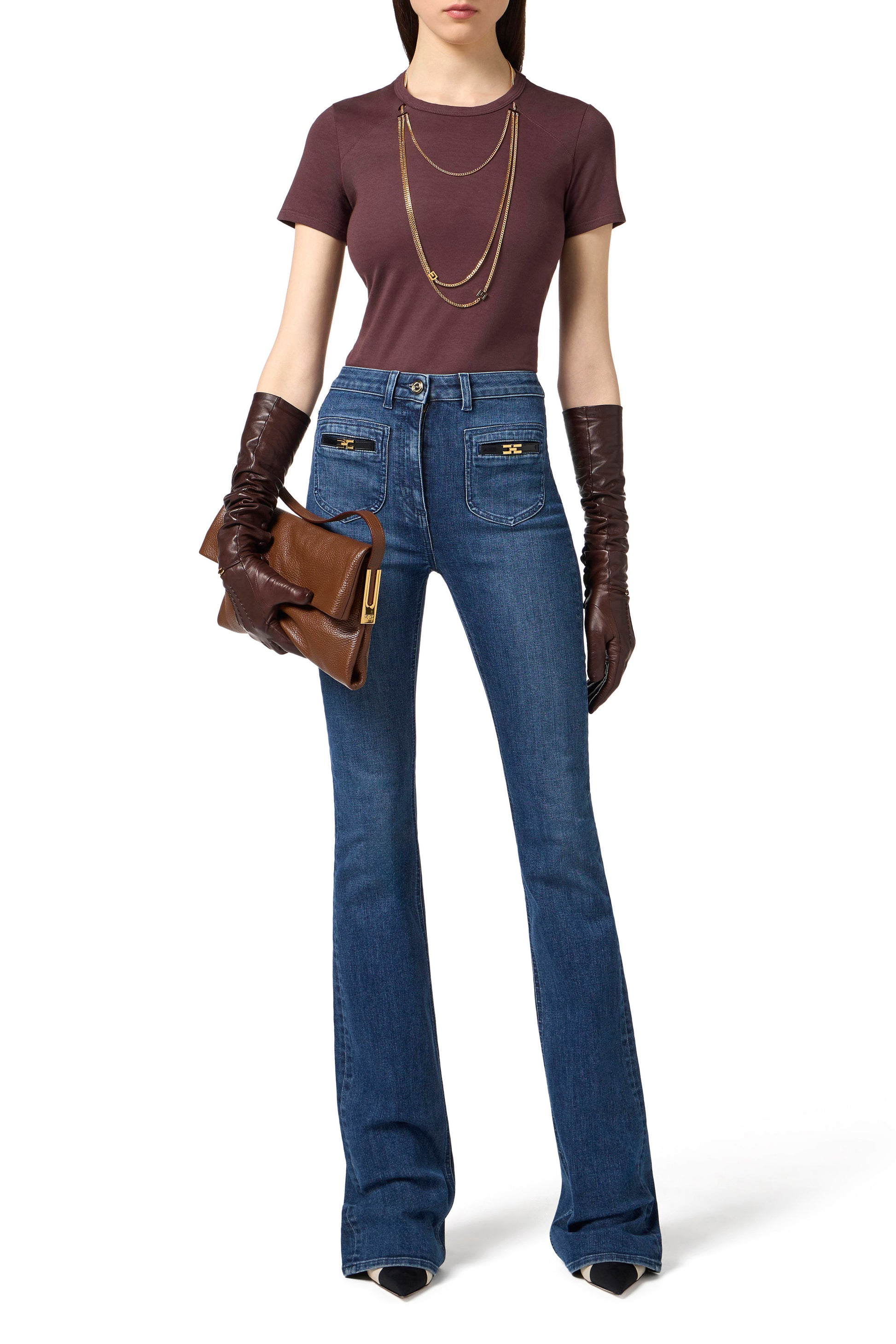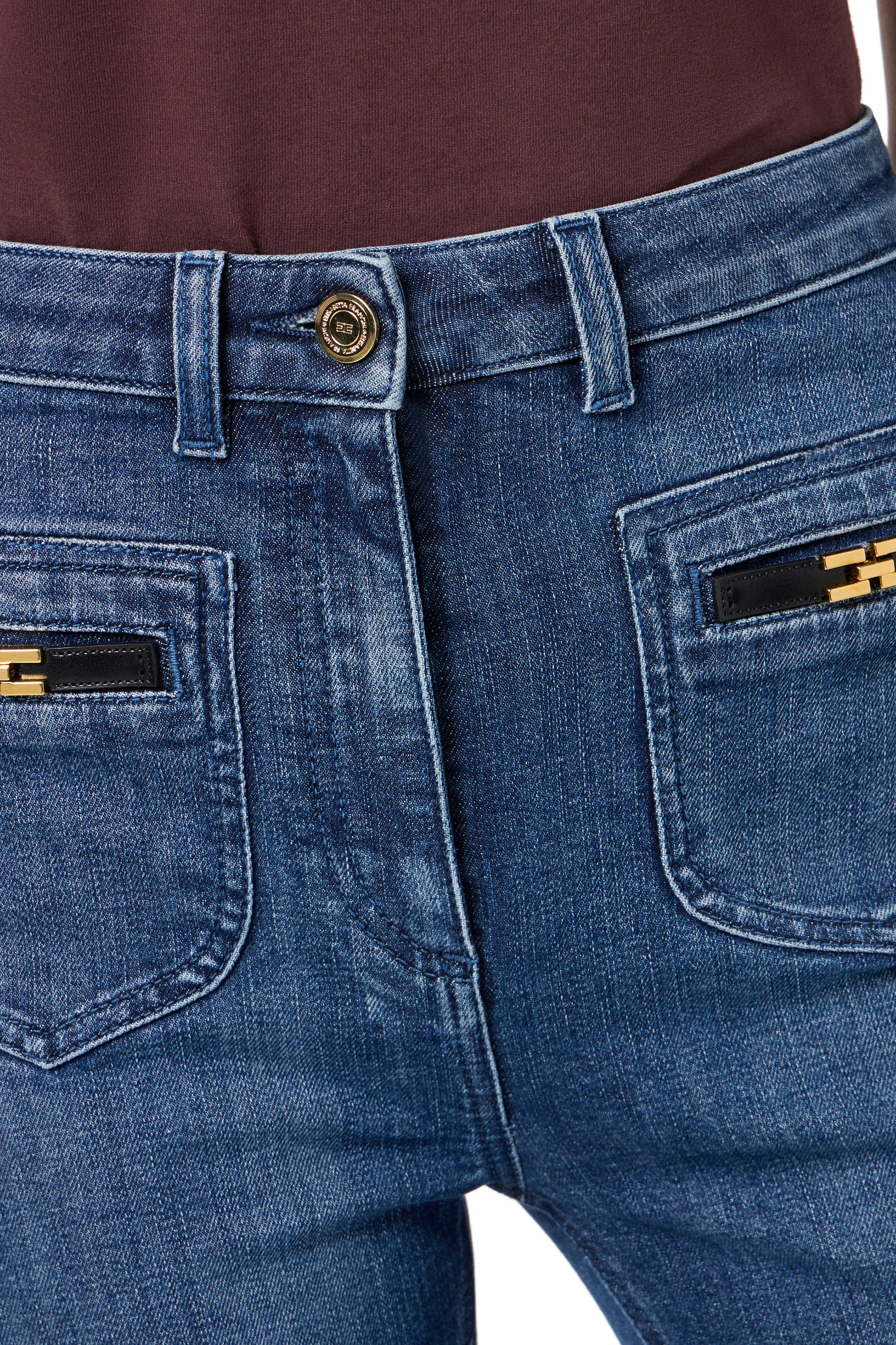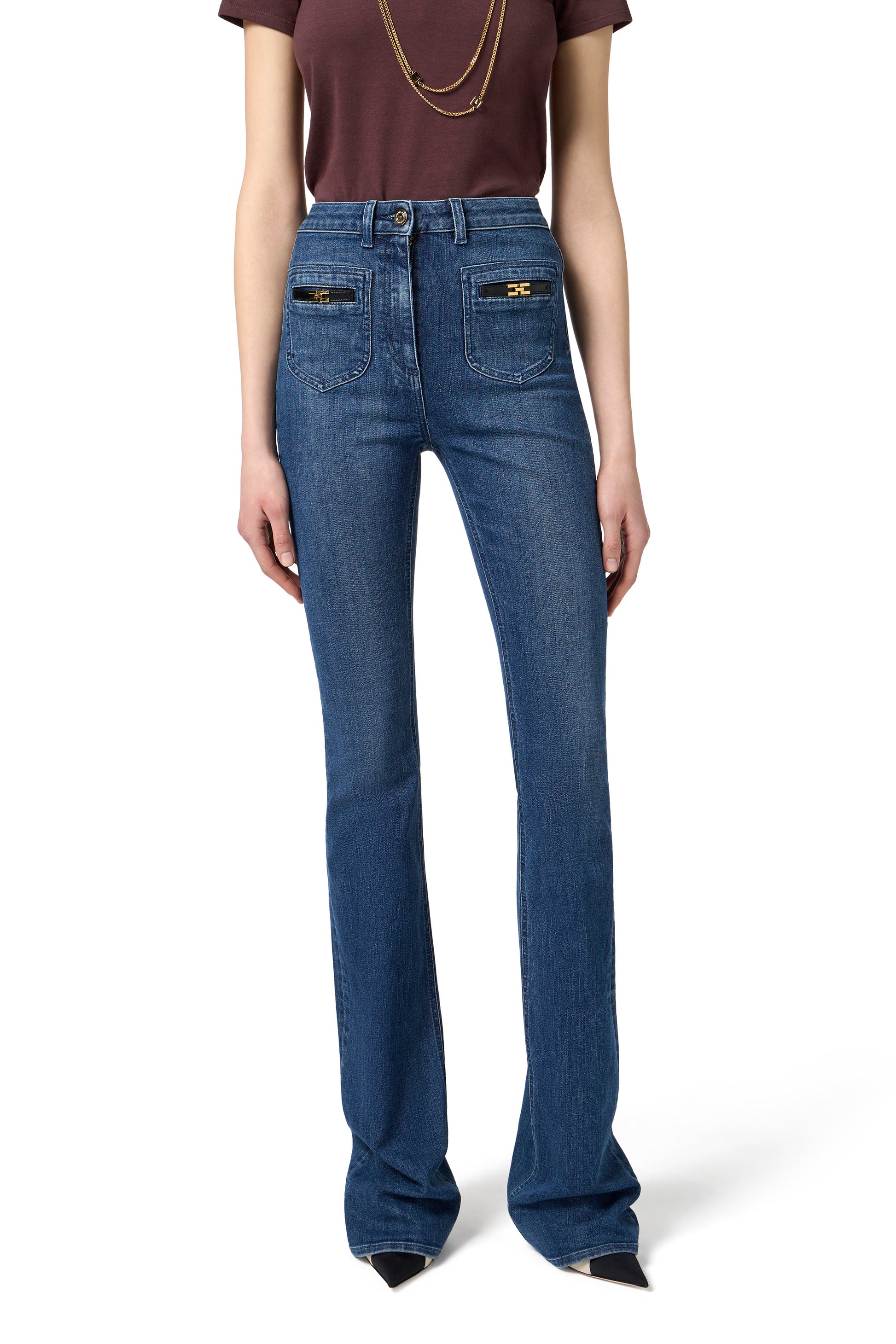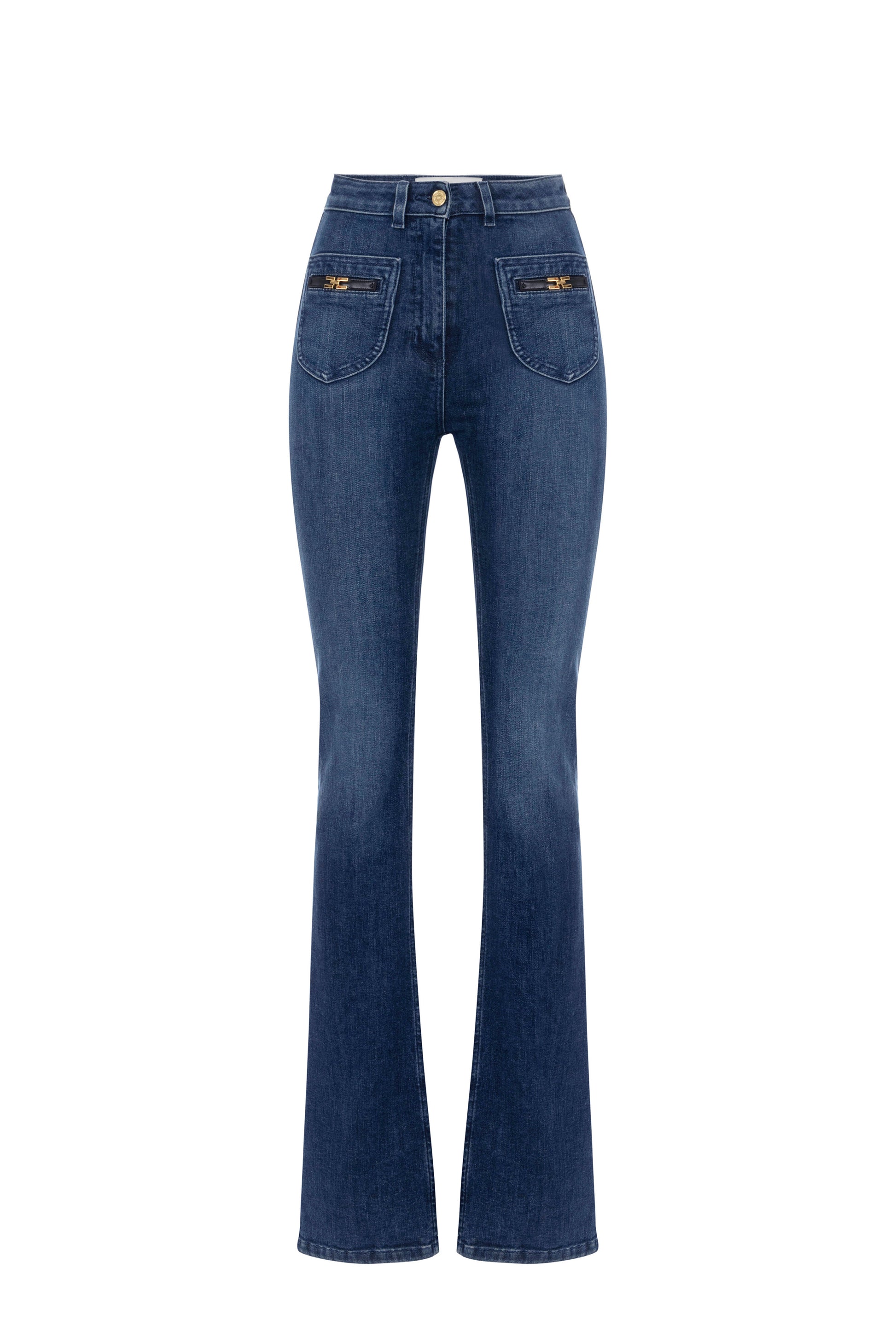 Denim boot cut trousers with medium waist and leg slightly flared at the bottom. They are characterised by contrasting texture welts with golden metal logo decorating the front pockets. Patch pockets and label on the back. Slim fit.