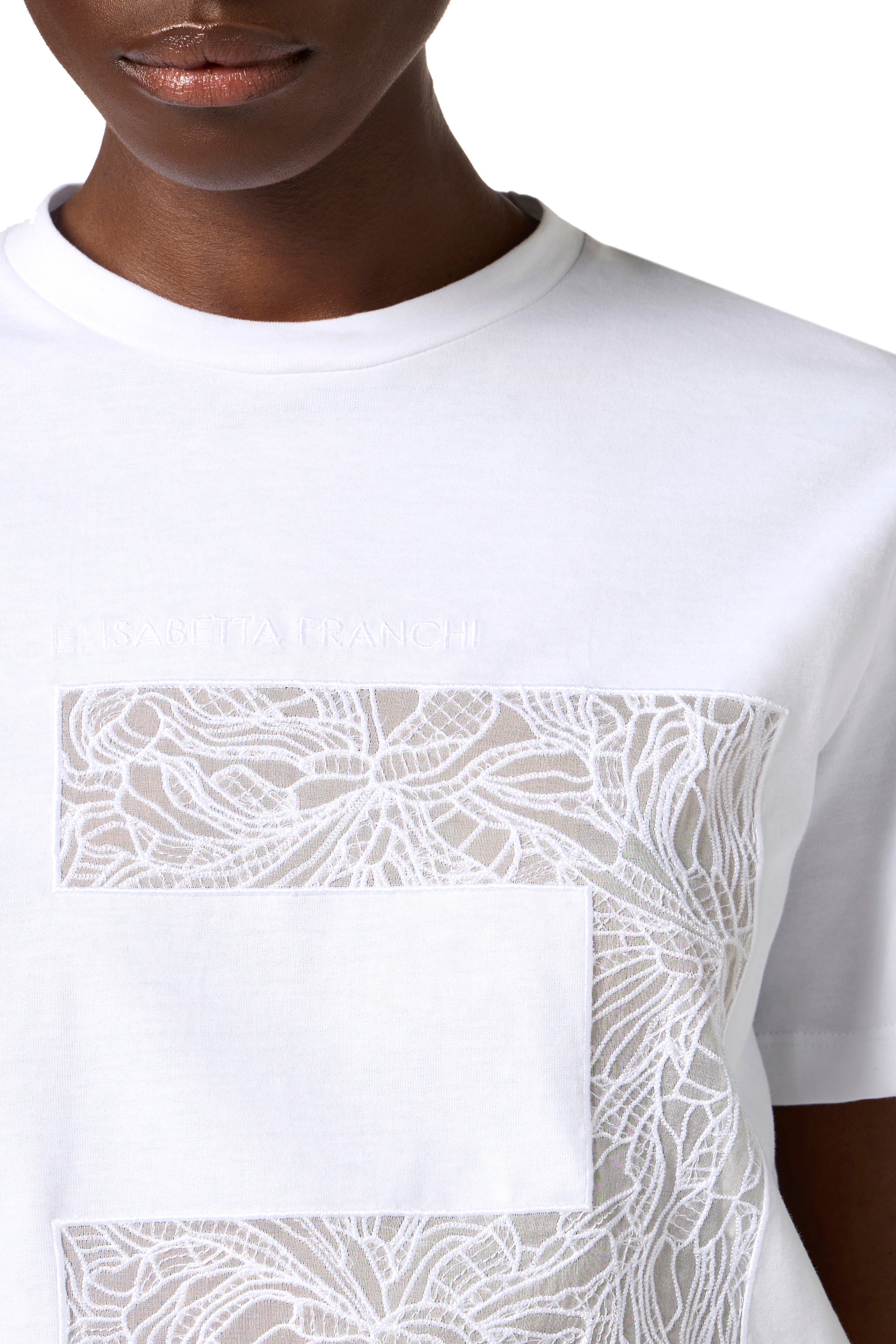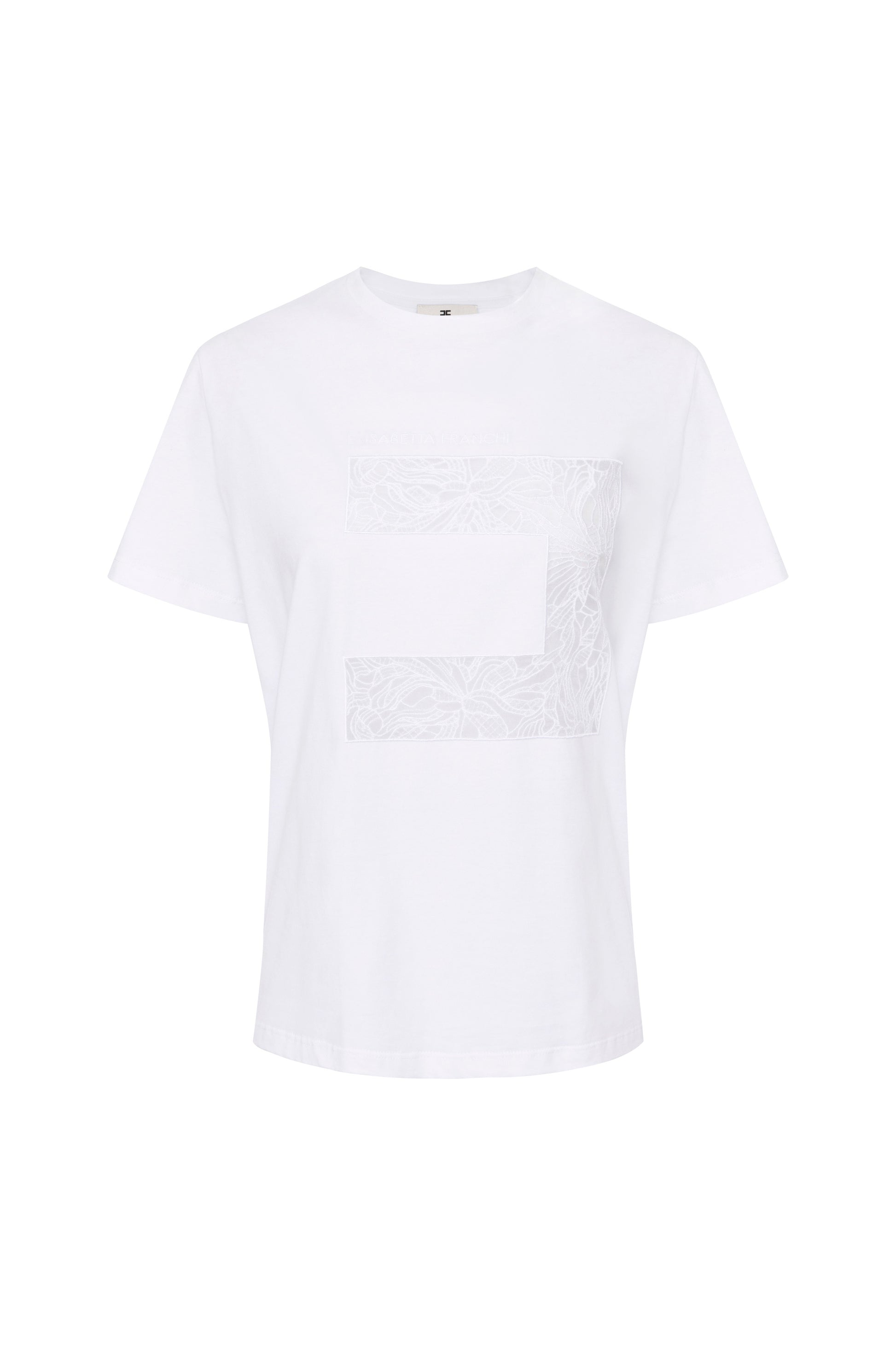 Short-sleeved jersey T-shirt with regular fit. The embroidered voile macro logo decorates the front and back of the garment with a floral design.