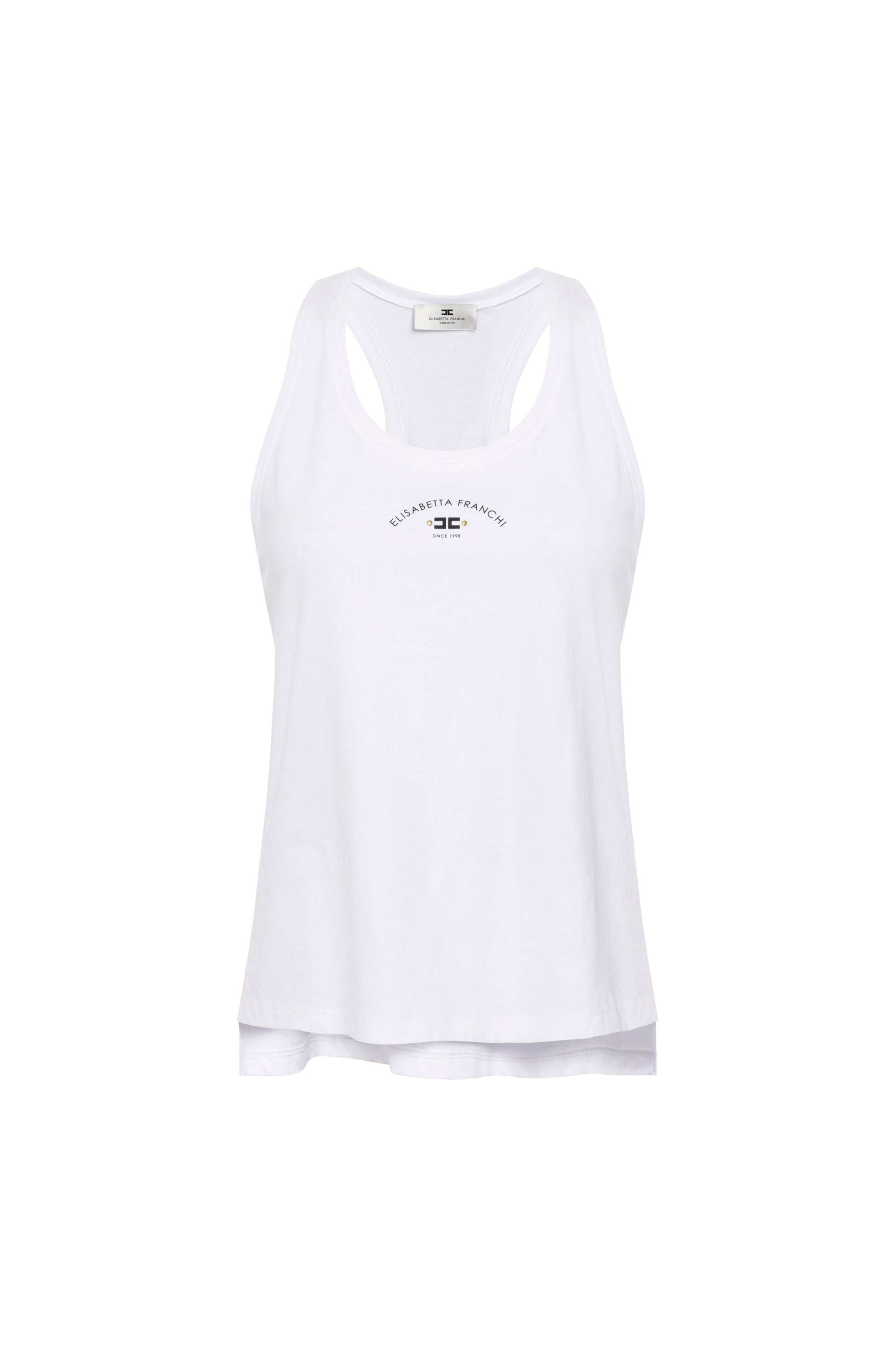 Cotton jersey top with regular fit. The garment features a raceback neckline and asymmetrical bottom. Characterised by the front logo print, it is embellished with small stud appliqués.