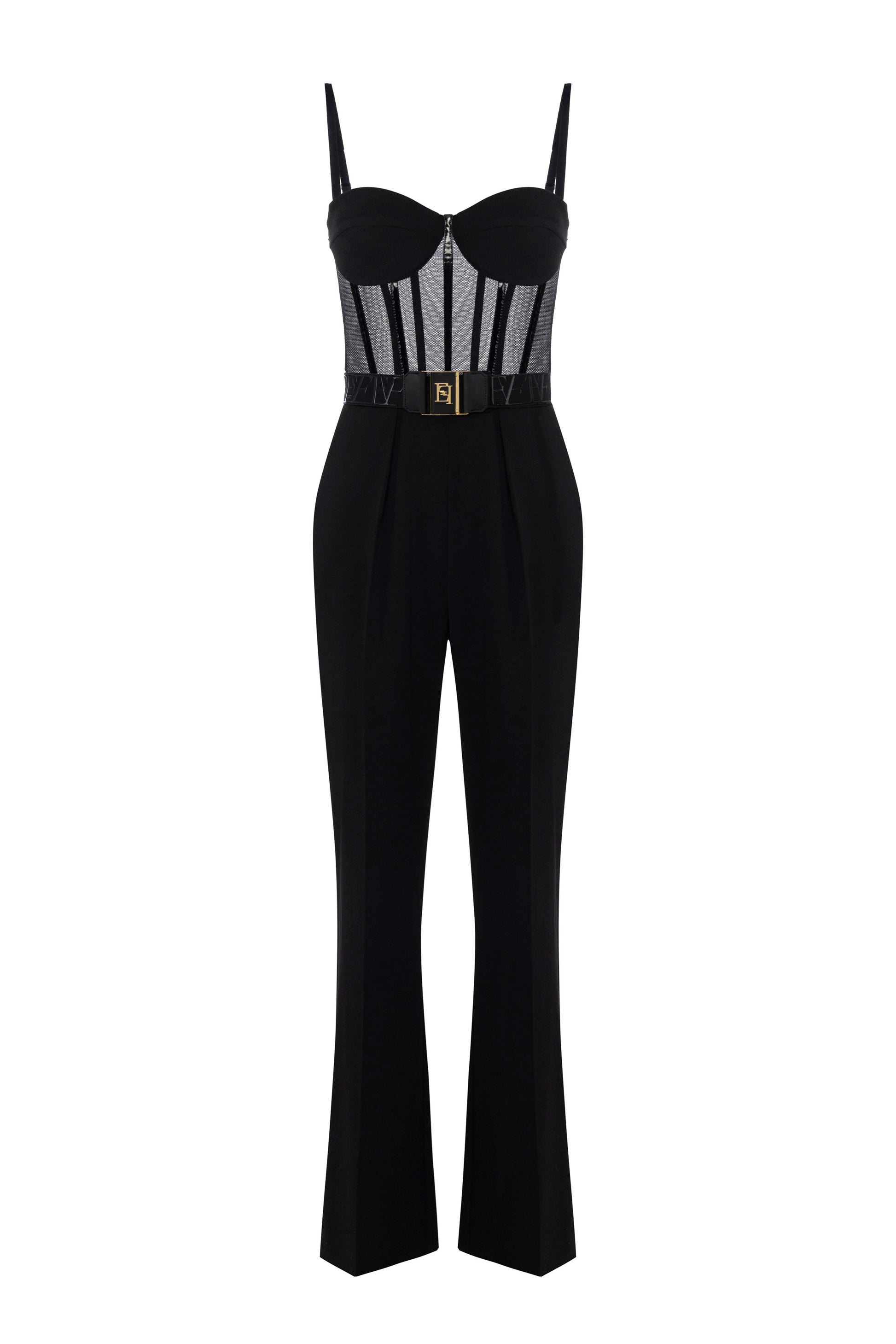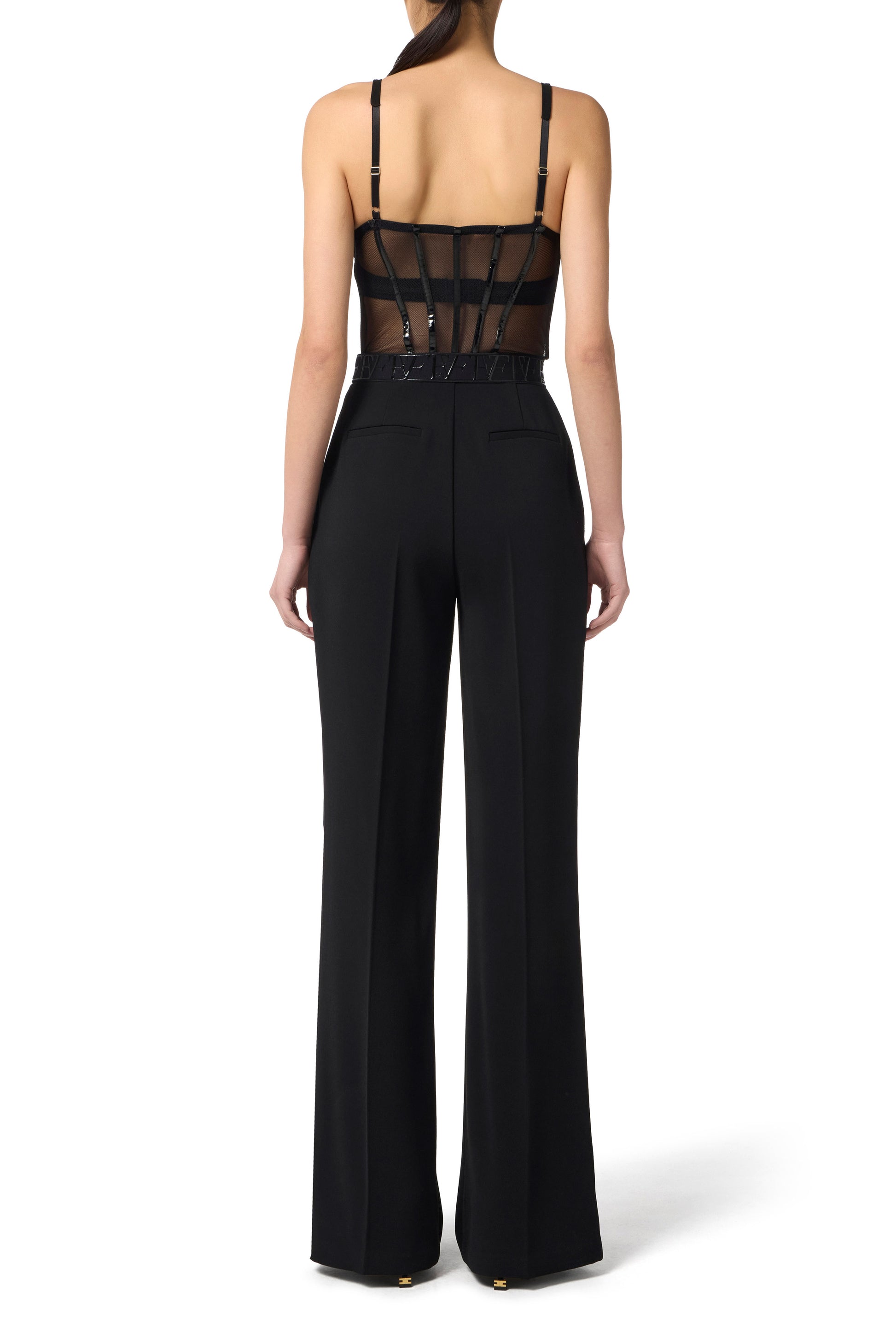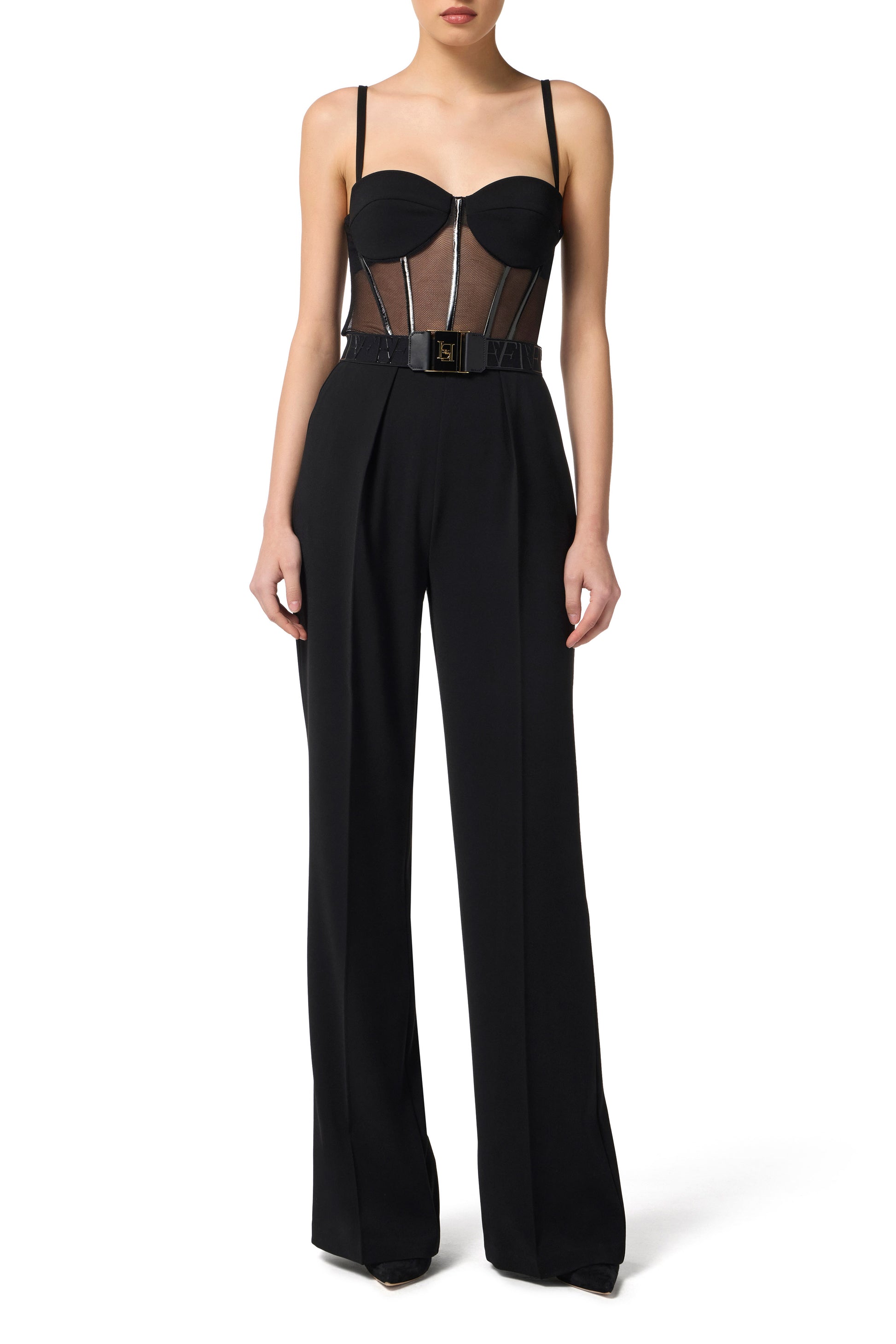 Jumpsuit in lightweight crêpe and tulle fabrics with regular fit. With straps and rigid cups with opaque texture, it features a top with a bustier construction defined by bright vinyl details. The trousers have darts at the front for a defined contrast of textures and volumes. Belt with logo at the waist.