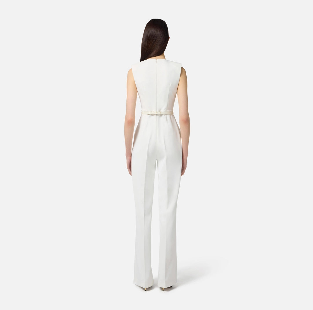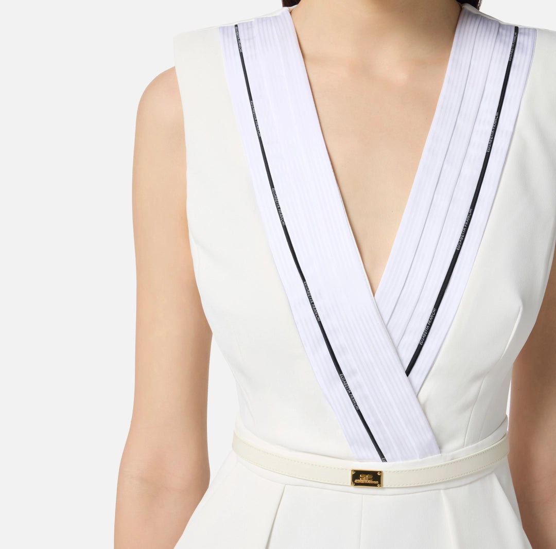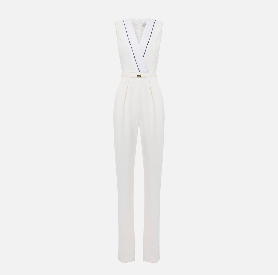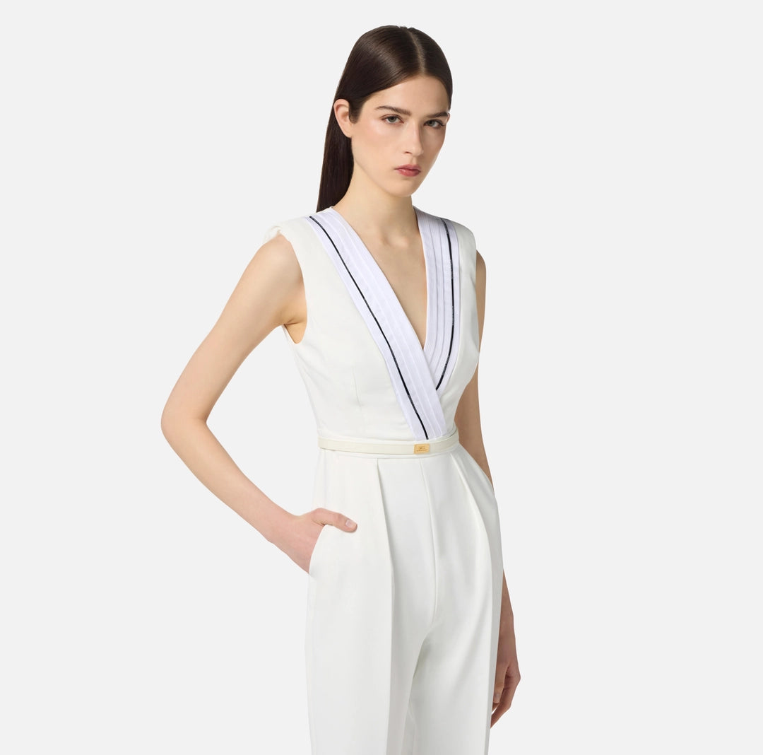Jumpsuit in lightweight crêpe fabric with slim fit. It is characterised by the pleating on the neckline that recalls the dickey of tuxedo models, defined by the contrasting logo piping. The belt with golden metal logo highlights the waistline and adds a touch of light.