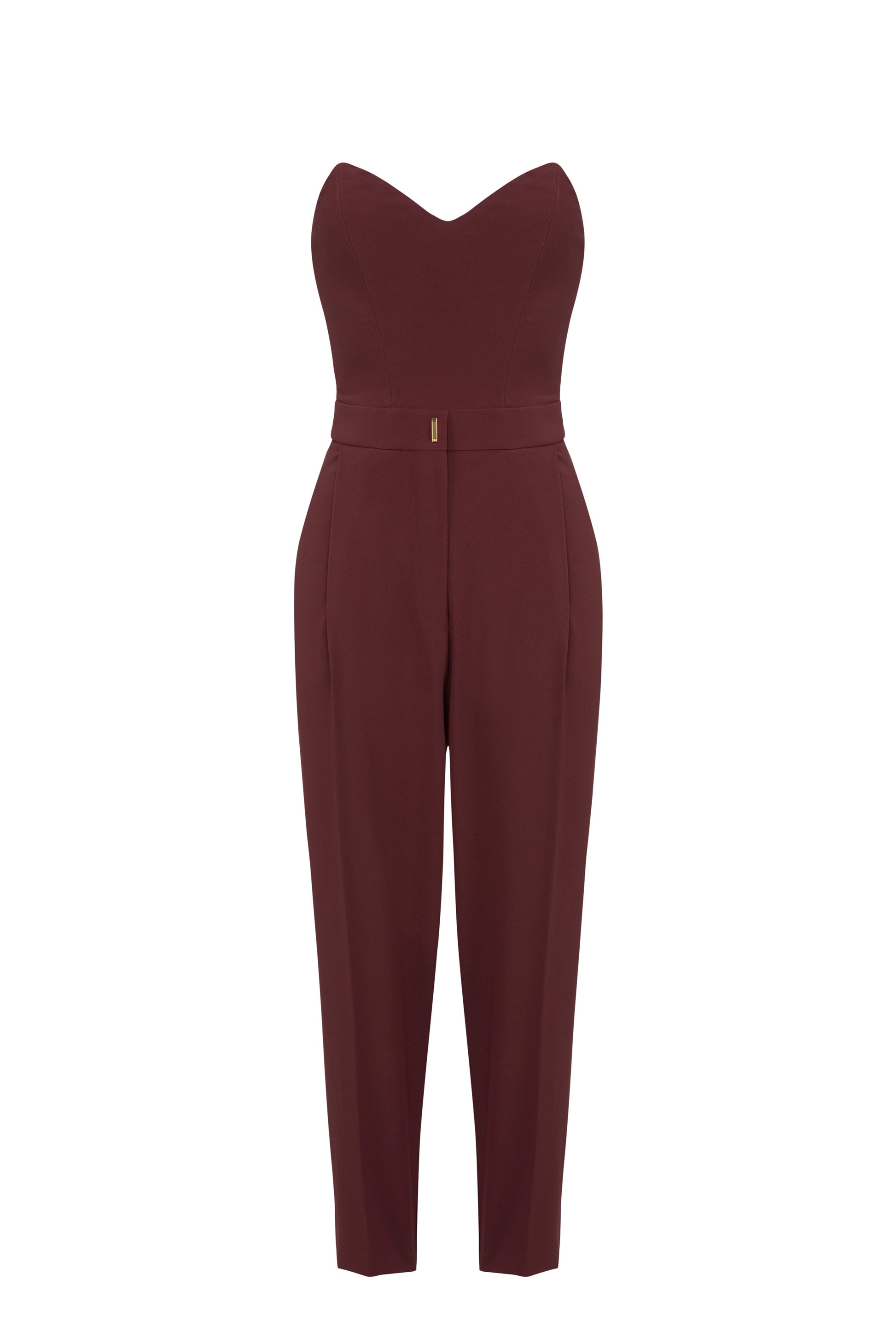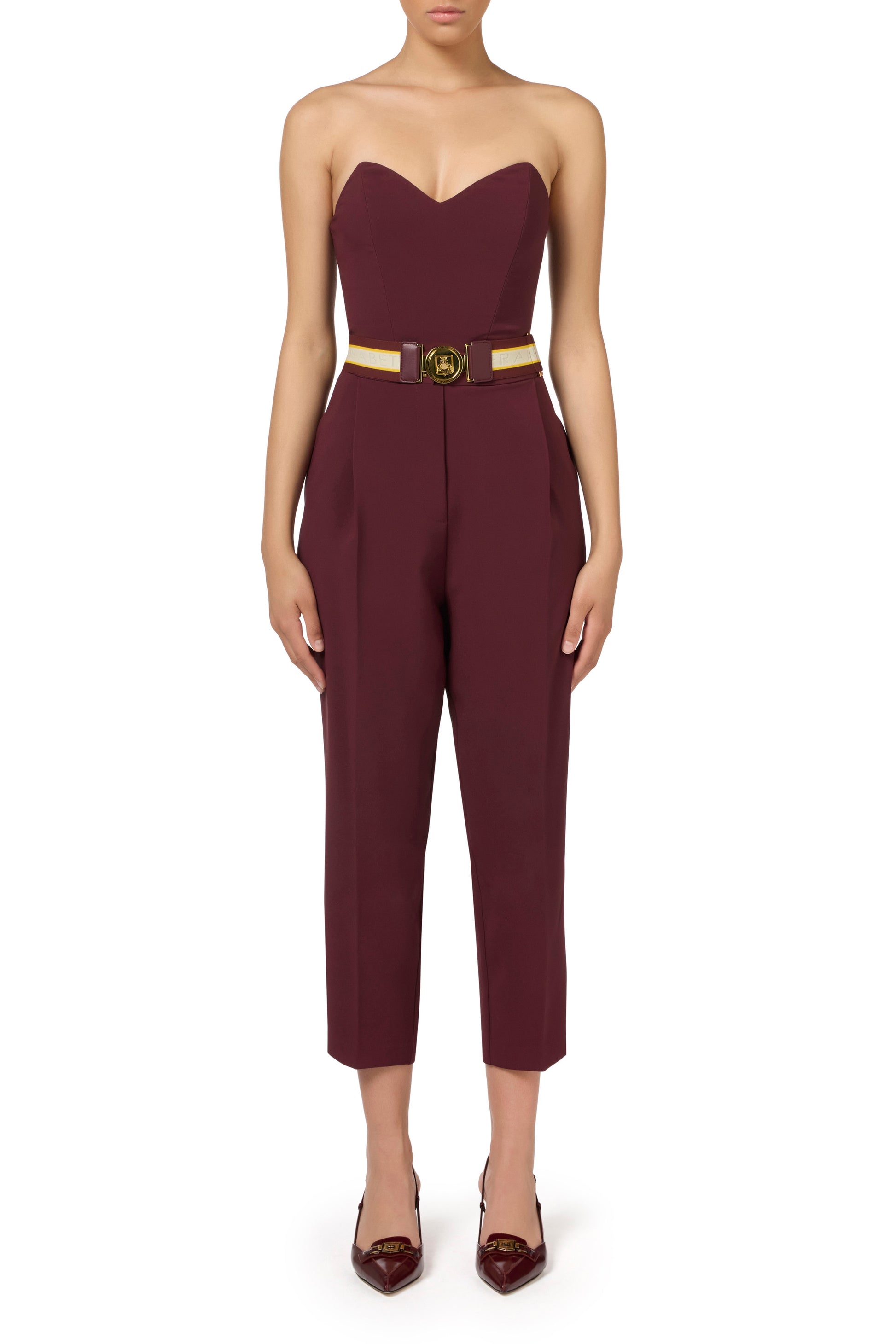 Jumpsuit in stretch crêpe fabric with pointed bustier top featuring a sweetheart neckline and cropped trousers with darts. The waistline is emphasised by a waistband with a golden metal vertical plaque.