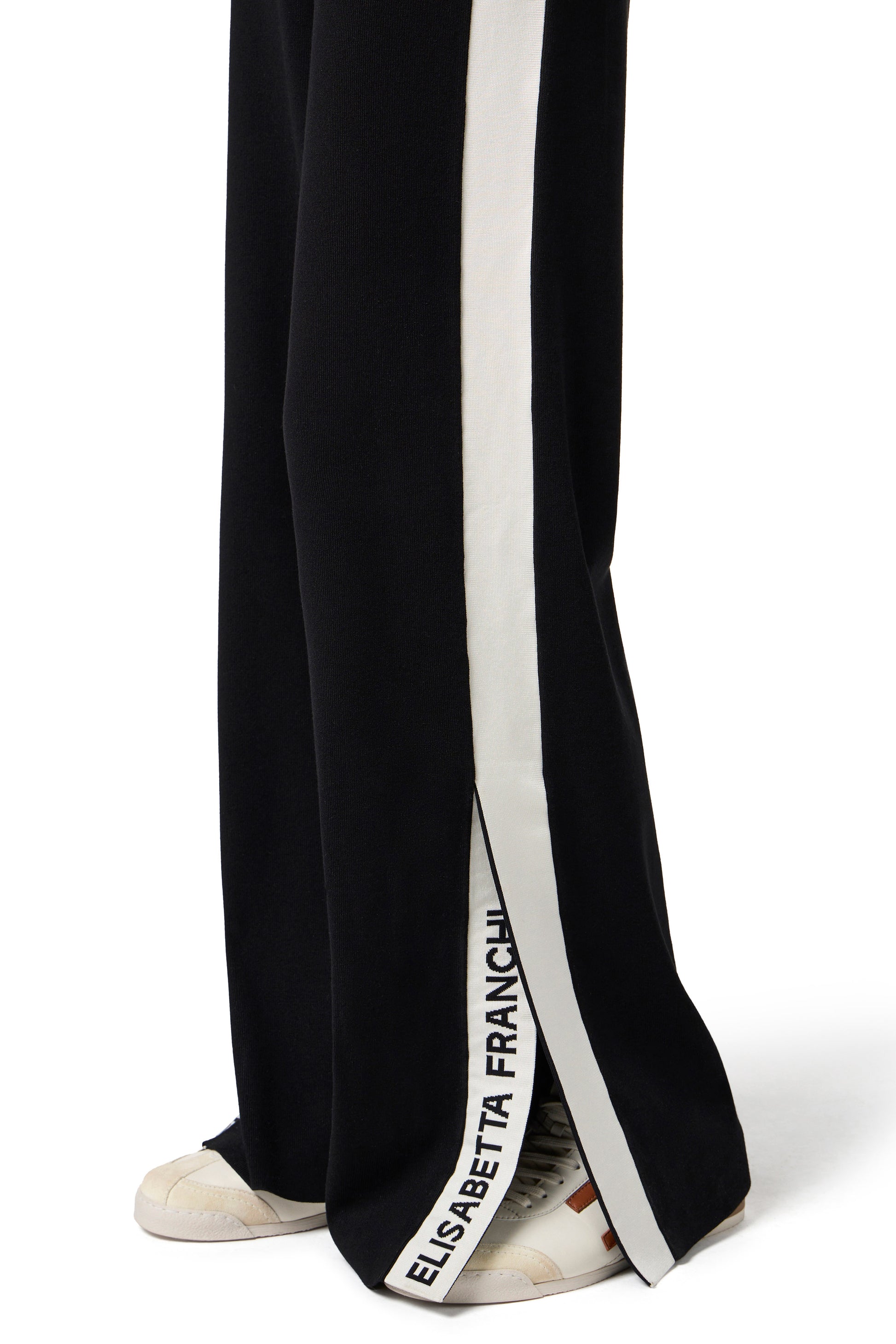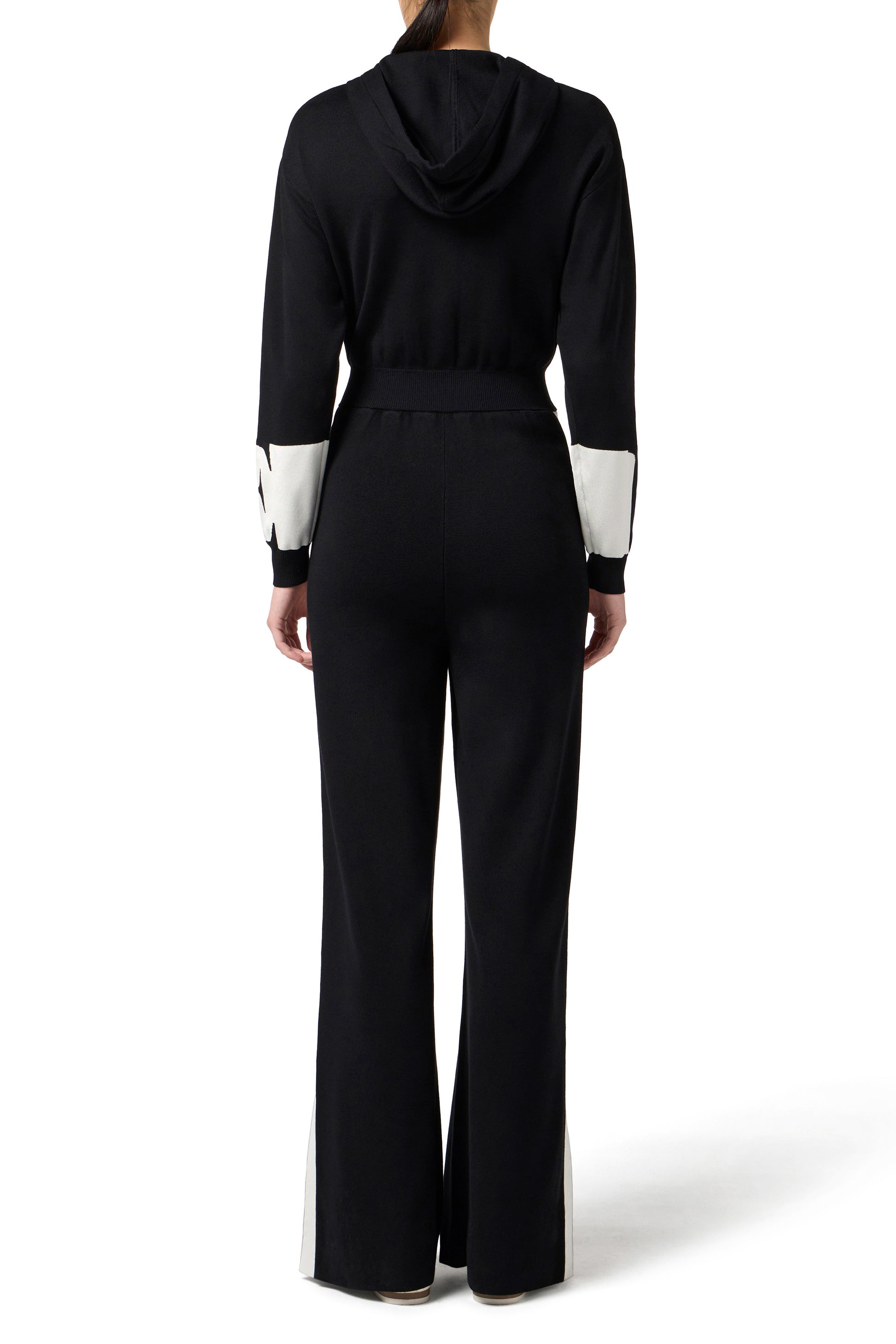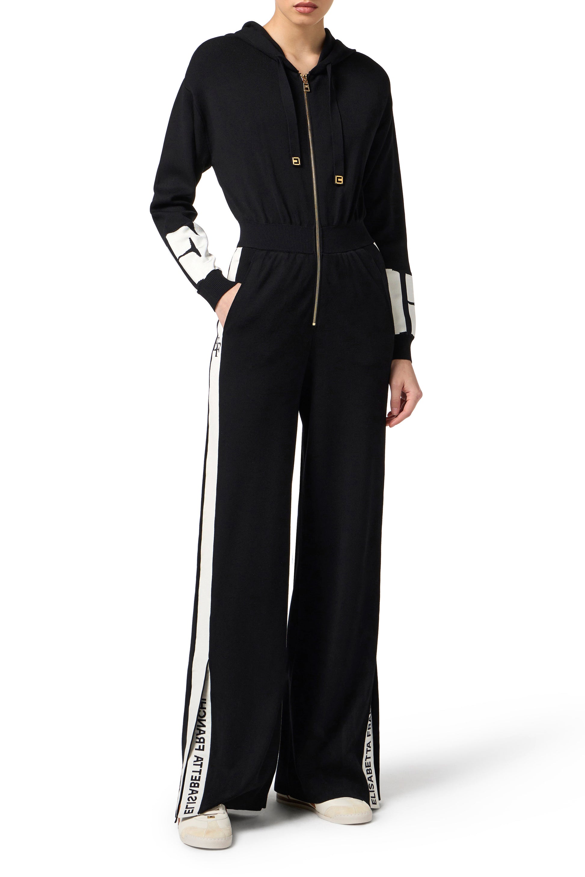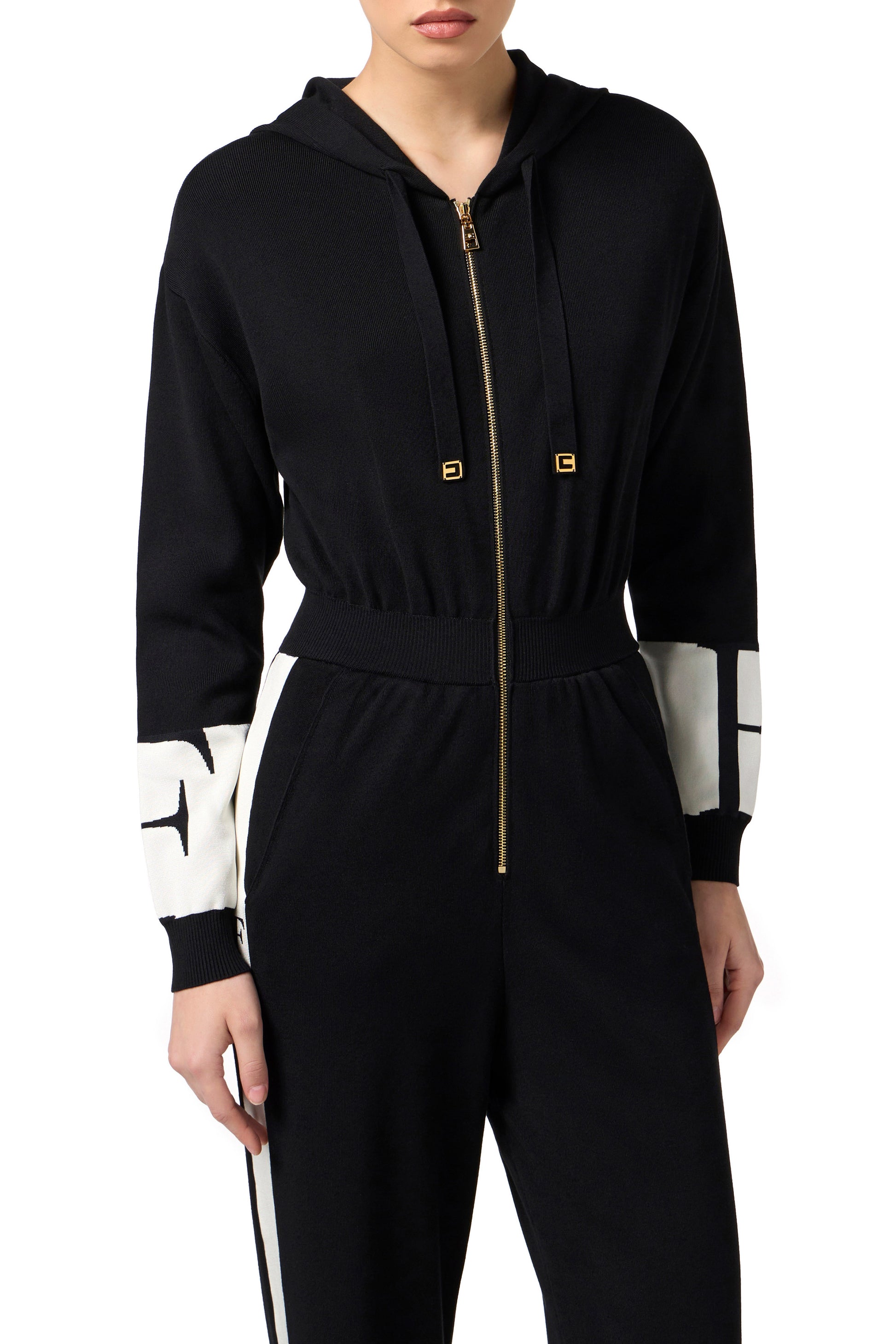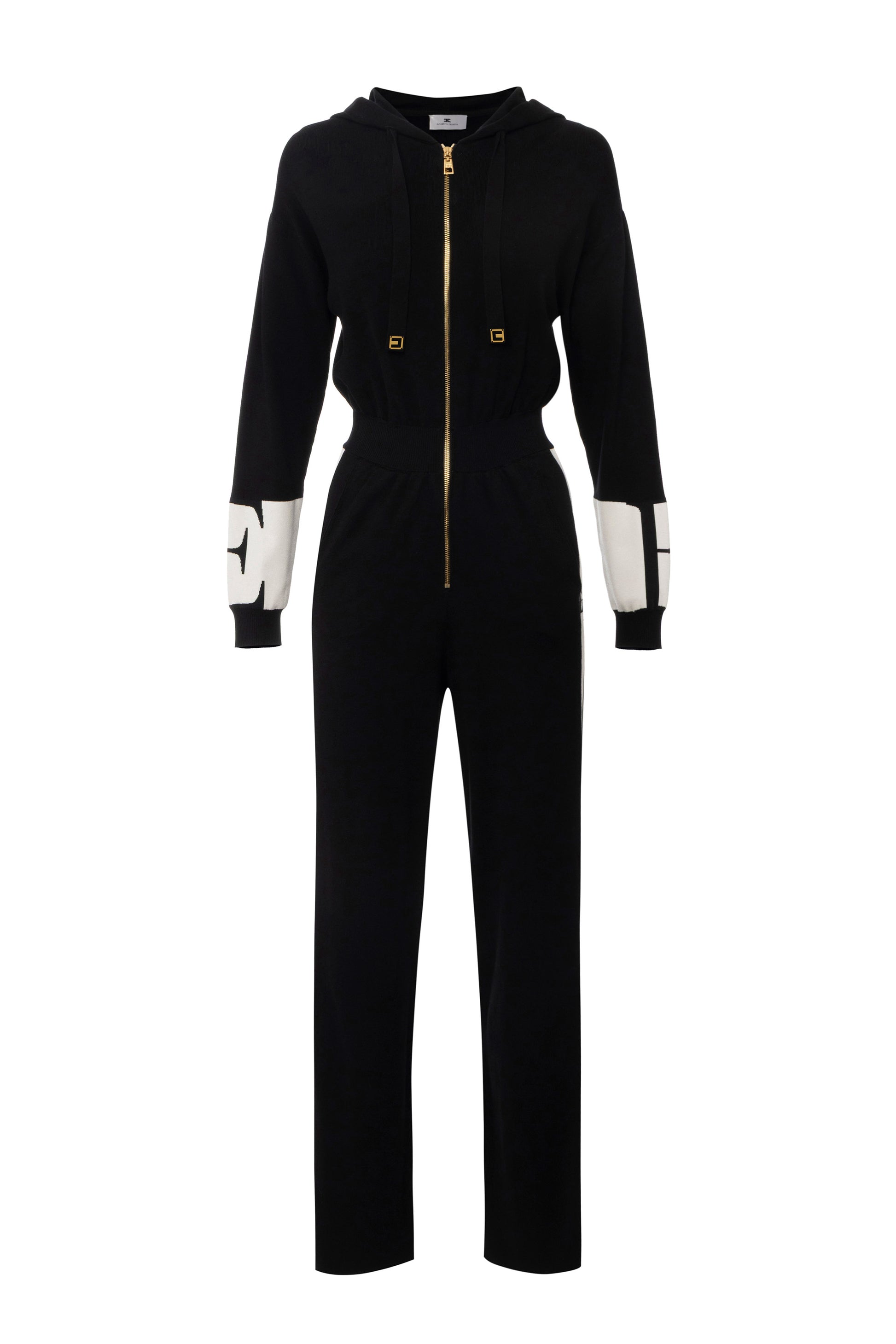 Jumpsuit in viscose fabric with regular fit. Complete with drawstring hood, it has inlaid logos on the sleeves and side bands finished in shiny viscose that create elegant texture contrasts. The trousers have slits at the hemline that reveal a final logo detail. Pockets on the sides.
