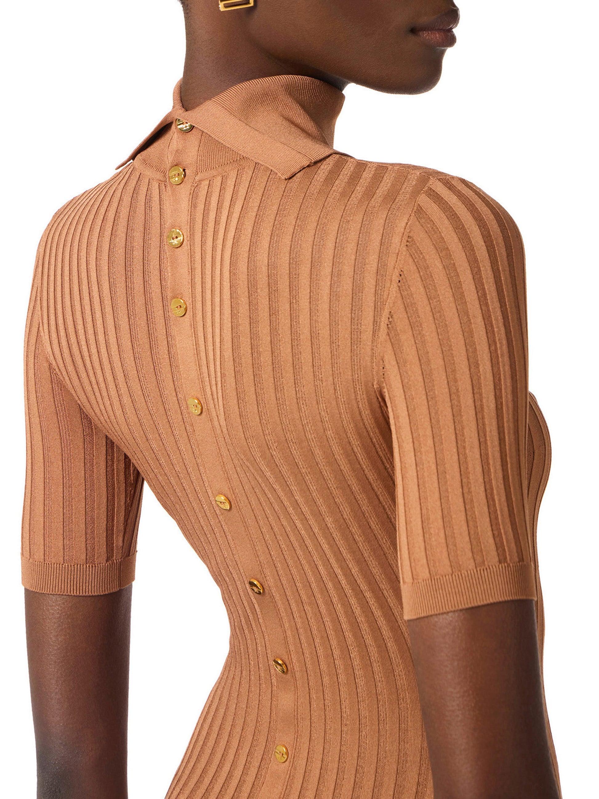 Knit dress with turtleneck collar and above-the-elbow sleeves. It stands out for the subtle sheer design. The open back is embellished with golden metal logo buttons. Slim fit.
