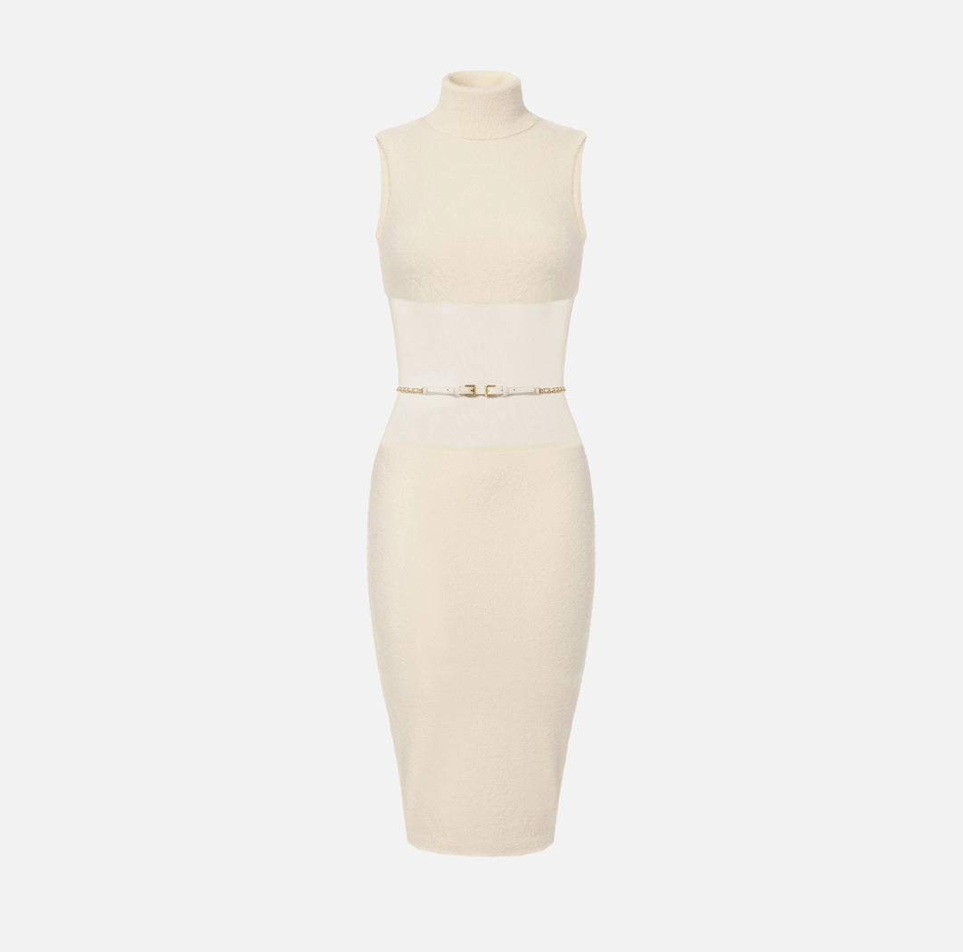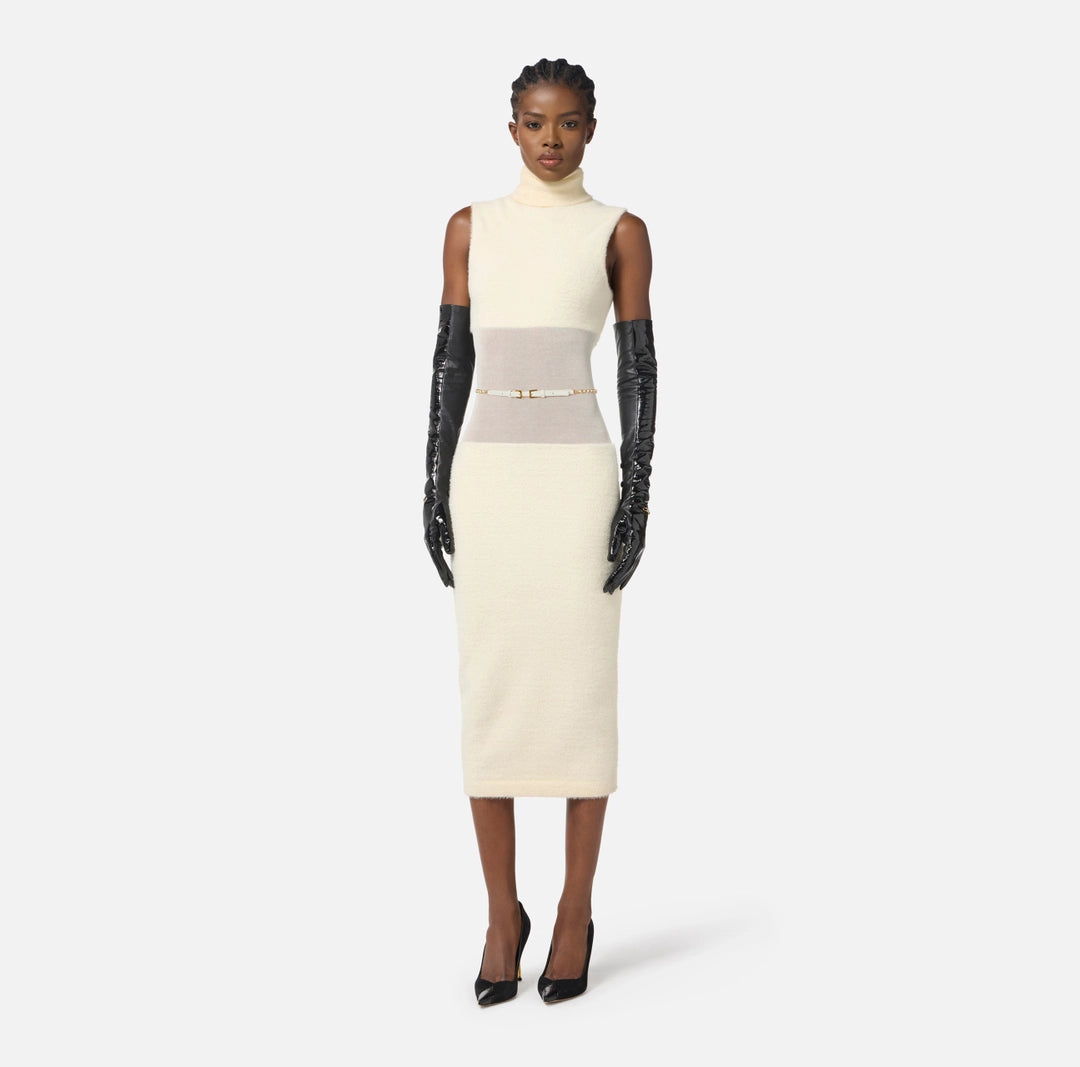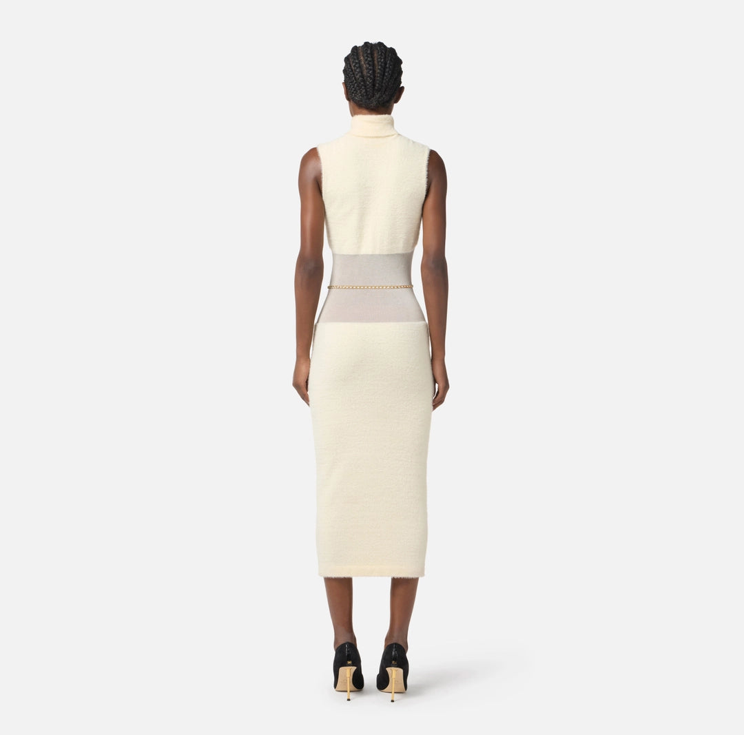 Knit dress with a slim fit. The sleeveless turtleneck dress has a calf-length skirt. It stands out for the special workmanship that gives a soft fur-effect texture and by the play of transparencies with the gauze weave at the waist. The belt with chain and logo illuminates the garment.