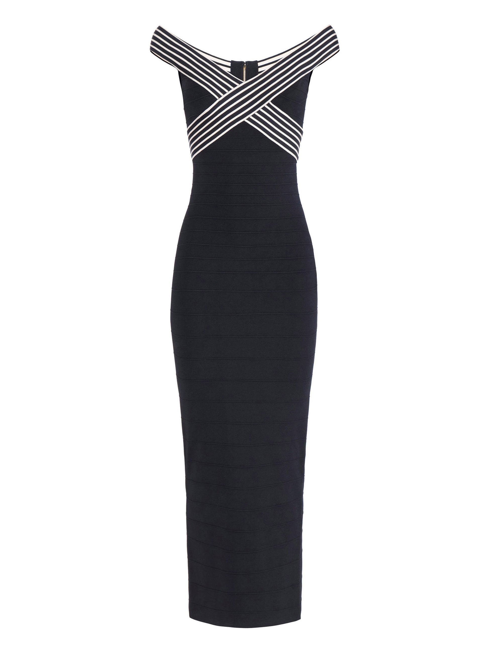 Knit long dress with a slim fit. The dress is characterised by decorative bands with contrast stripes that frame the bust. The ribbed knit and horizontal ribbing create a vibrant pattern. The back slit enhances the geometric silhouette of the garment.