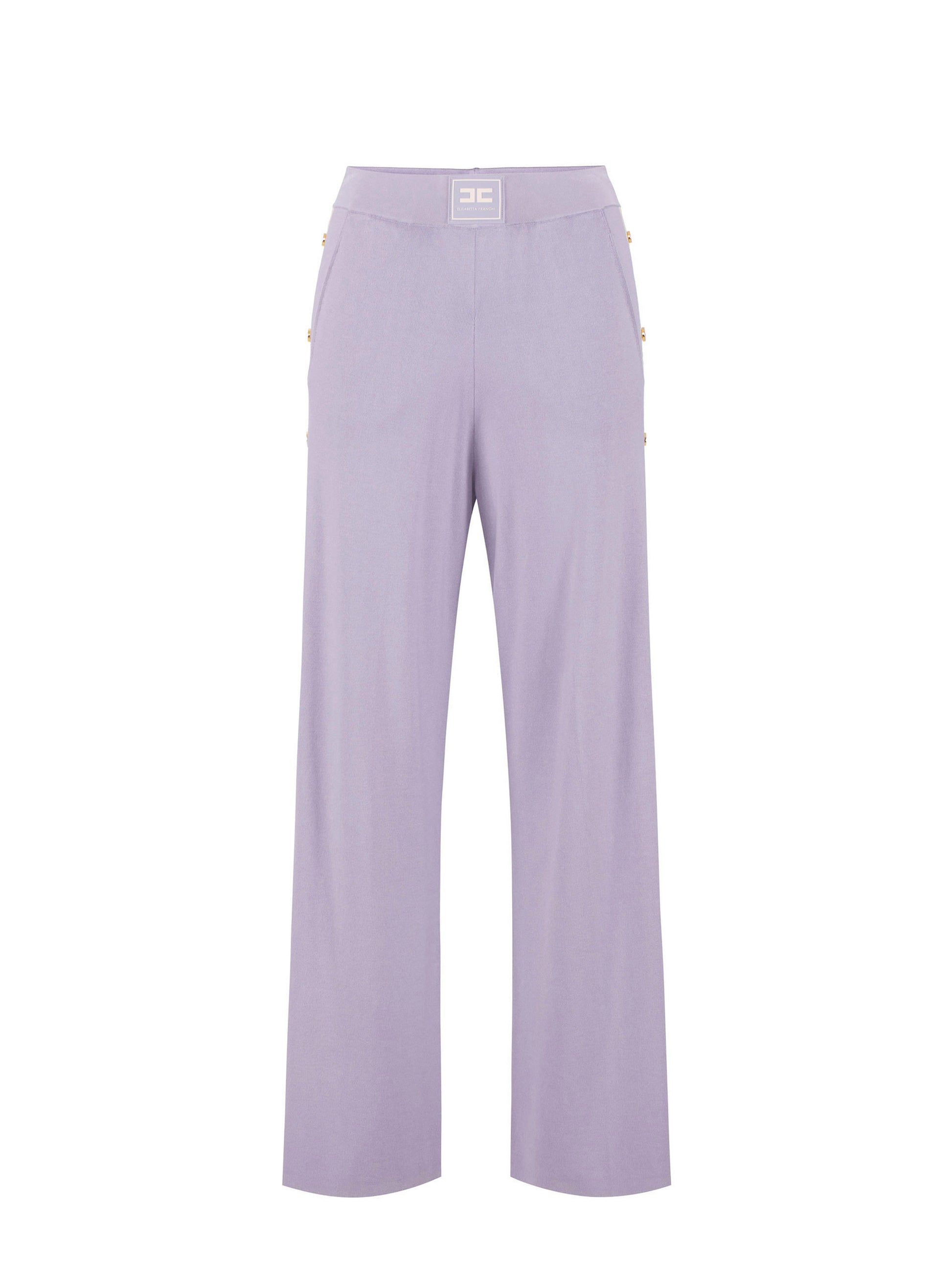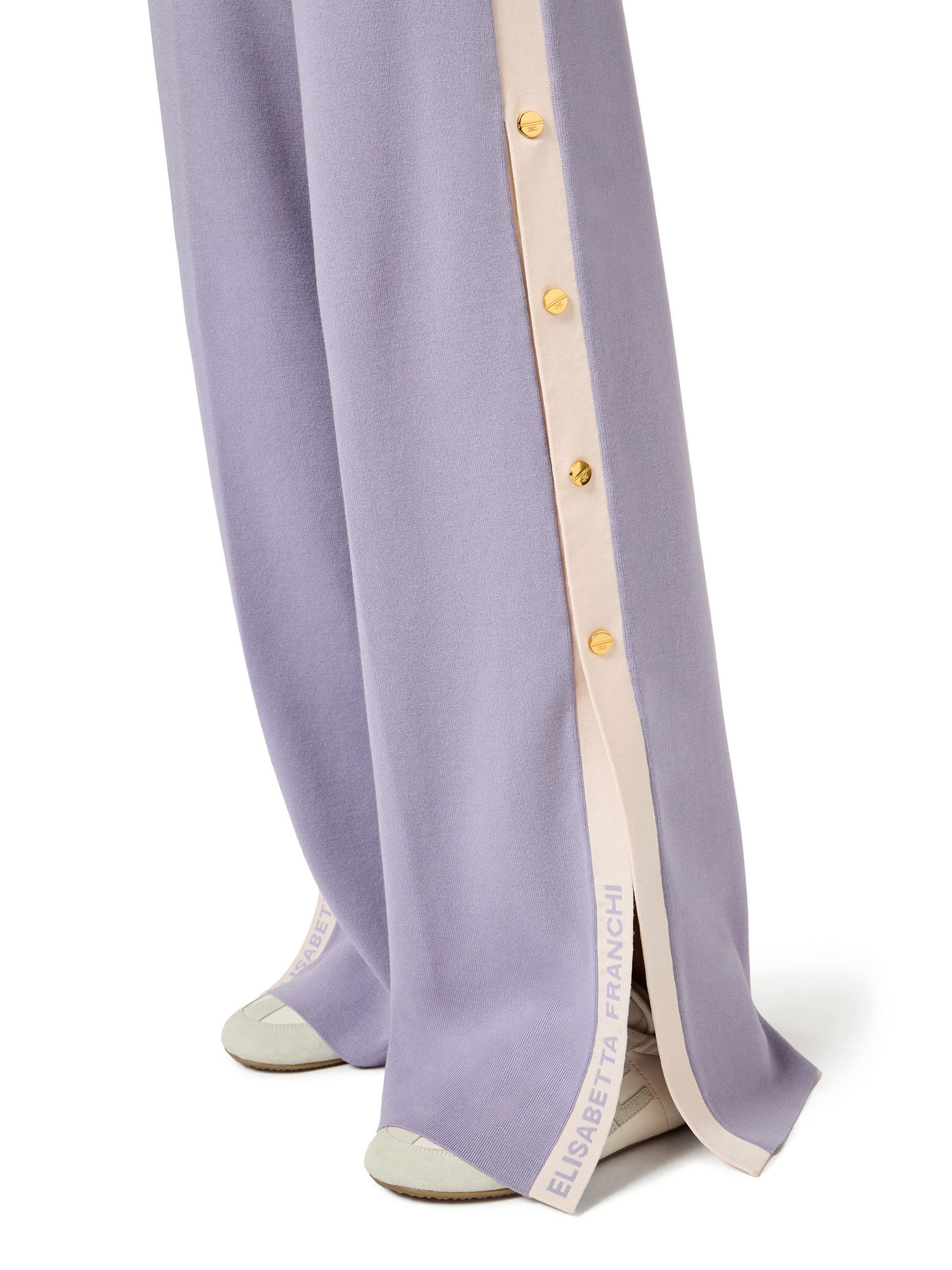 Knit trousers. They are characterised by shiny viscose bands and jacquard fabric applied to the logos and to the side slits. The contrasting colours emphasise the garment graphic design. Golden metal buttons add luminous touches to the garment. Logo label on the waistband.