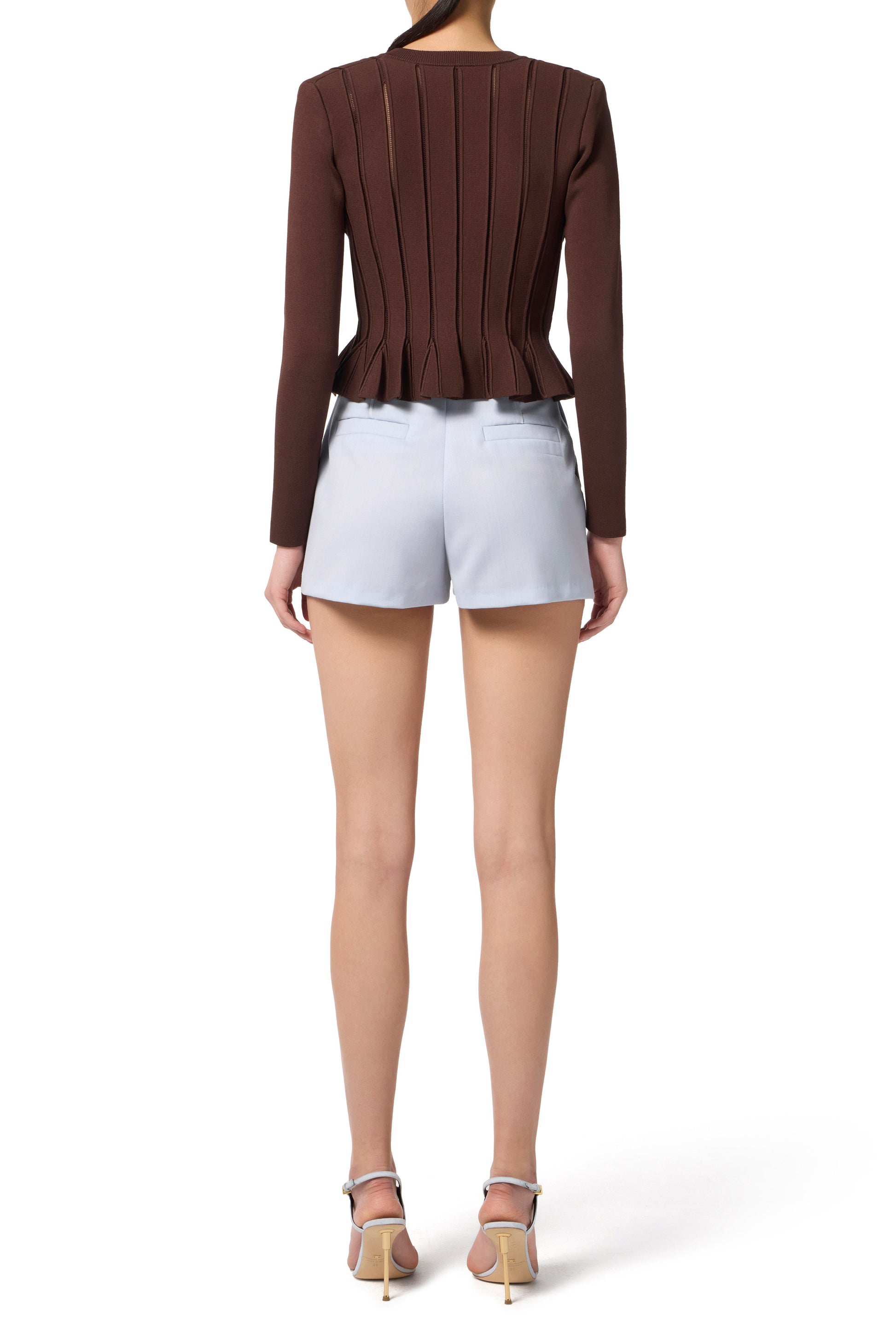 Knit jacket with a slim fit. With crew neck and long sleeves, it stands out for its openwork embroideries that open harmoniously into a peplum, giving delicate bustier inspirations. Golden metal buttons add luminous touches to the garment.