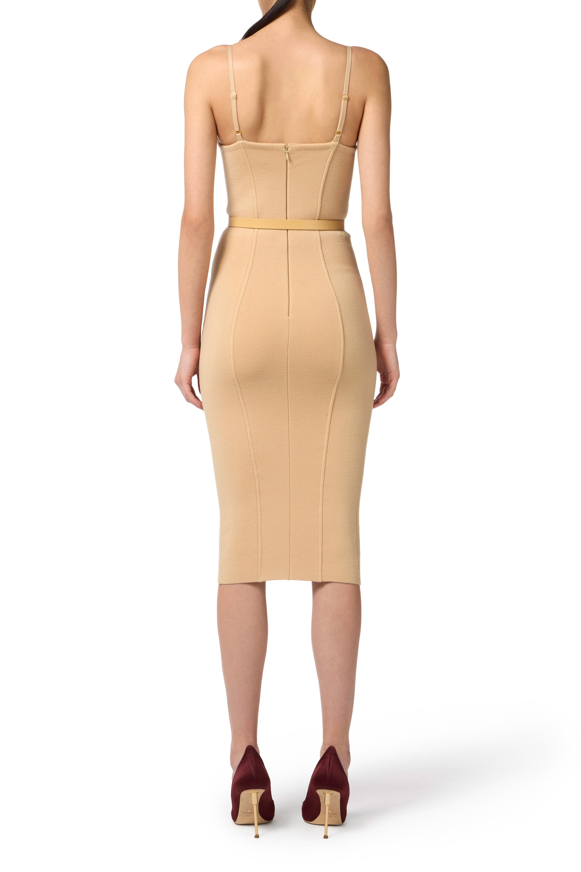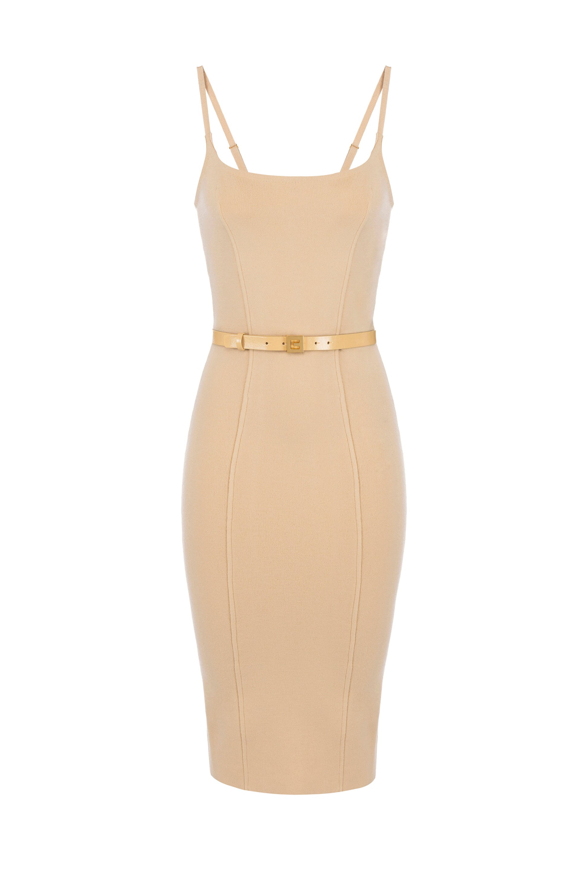 Slim fit knitted sheath dress. The dress features thin straps with a shaped neckline and calf-length skirt. It stands out for its details such as matching ribbing that outlines the silhouette and a logo belt that emphasises the waist.