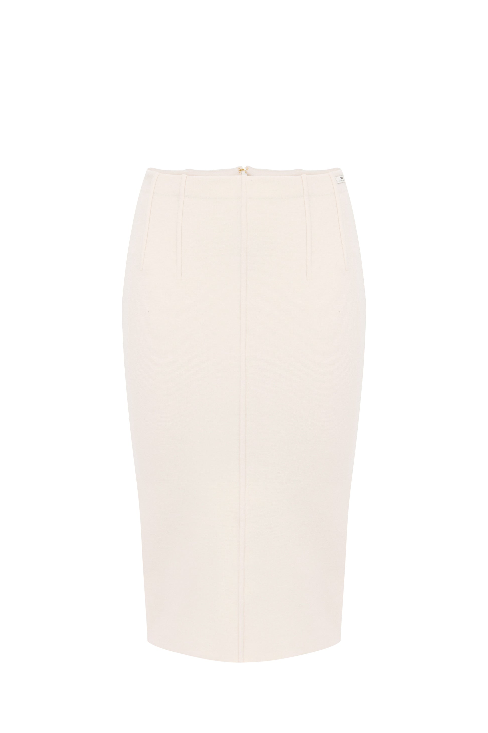 Slim fit knitted wool pencil skirt. With high waist, it is characterised by matching details that give definition, such as corsetry-inspired ribbing, darts and back slit with buttons covered in satin.