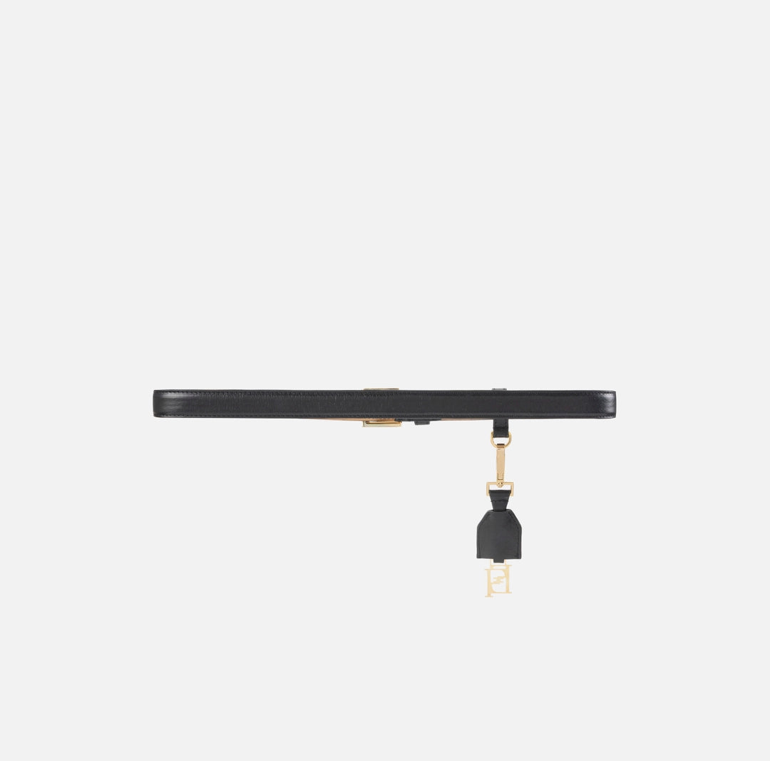 Leather belt with buckle and loop. It features a logoed pendant accessory.
