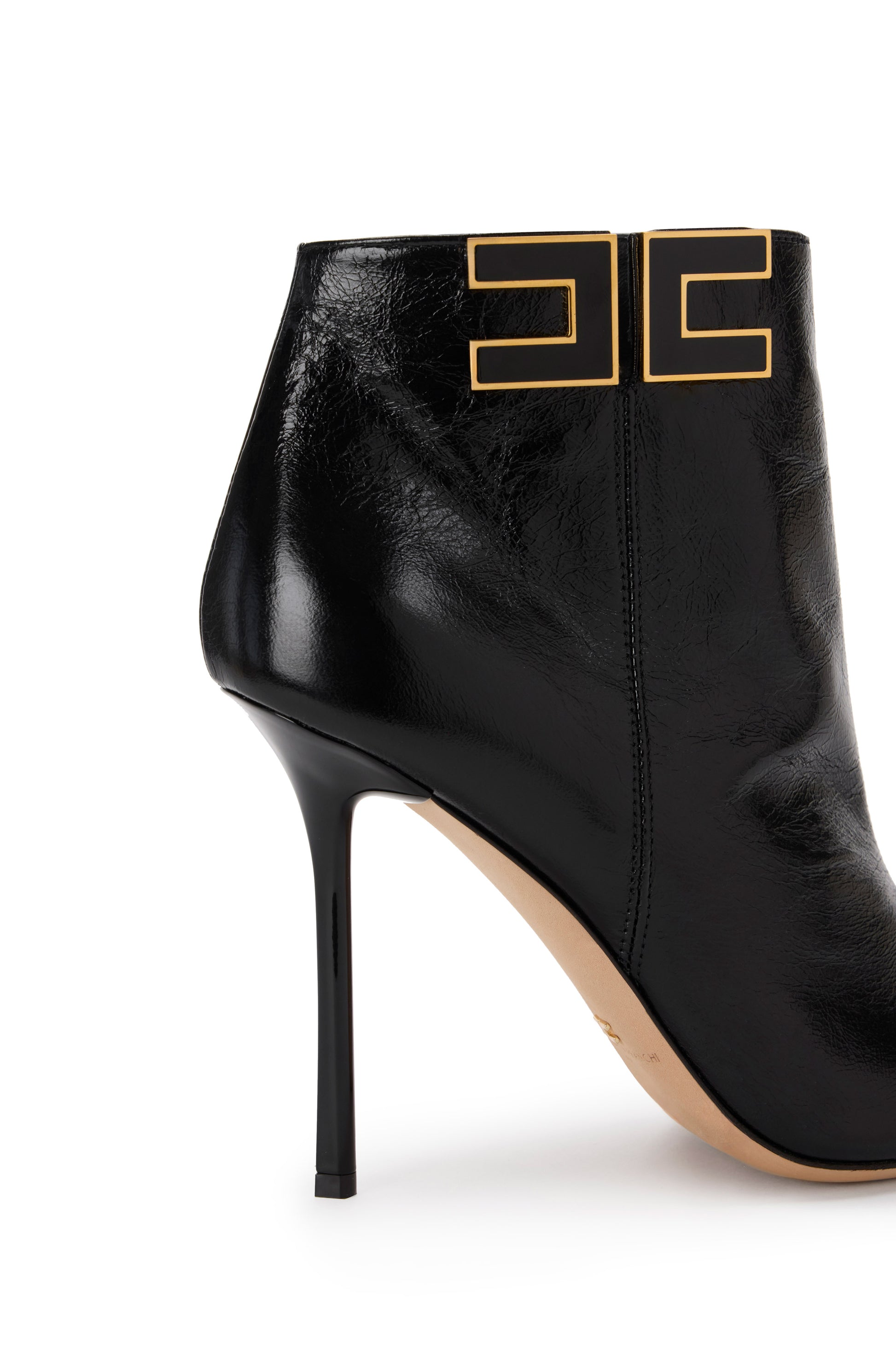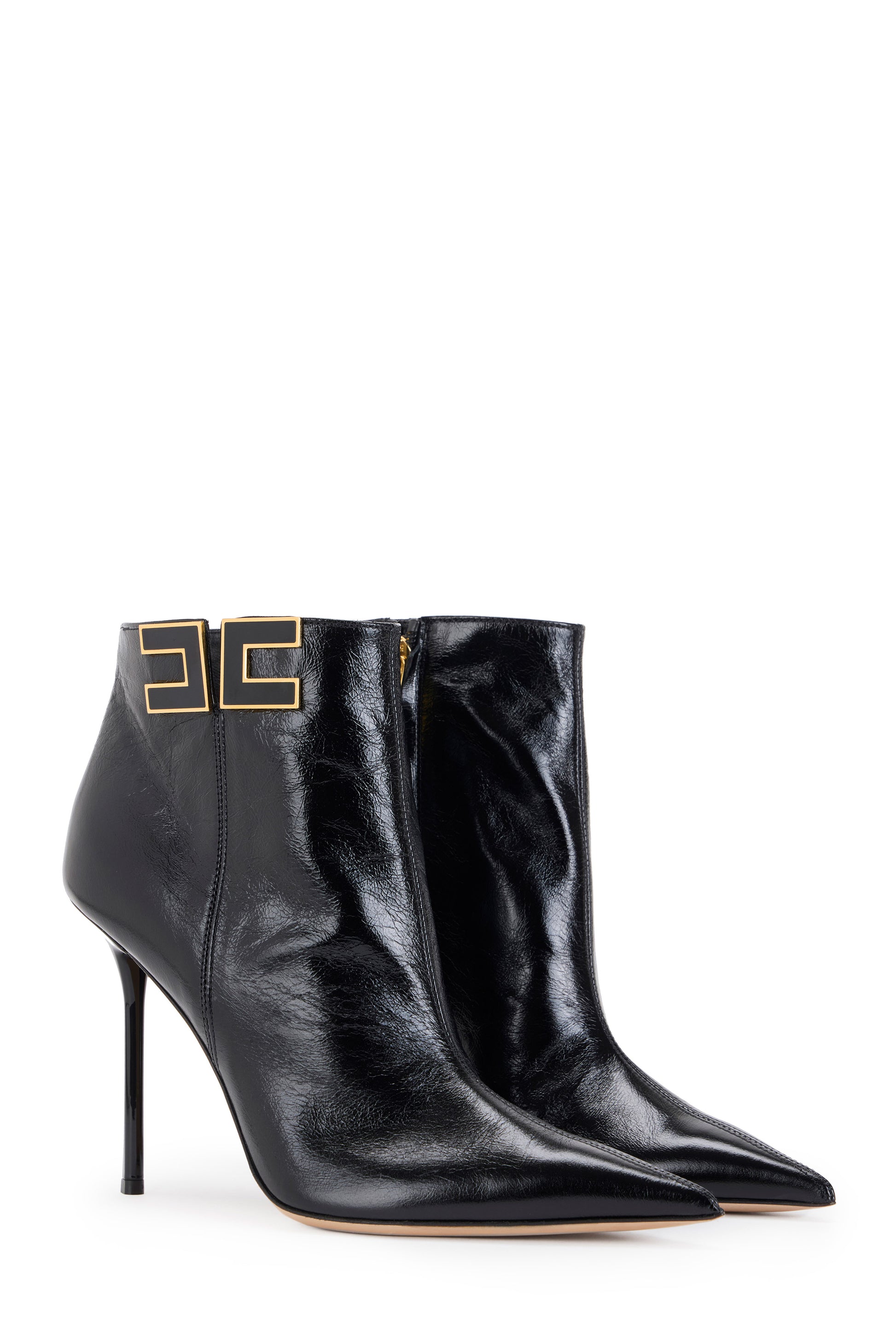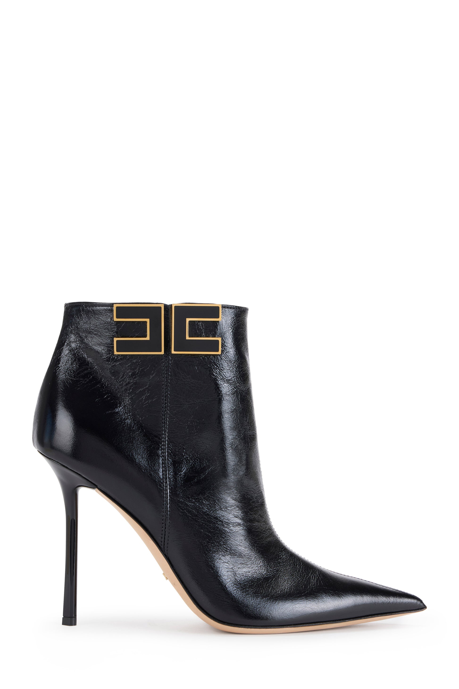 Leather boots with tapered toe and stiletto heels. They are characterised by the side logo with gold-finished edges for a bright contrast.