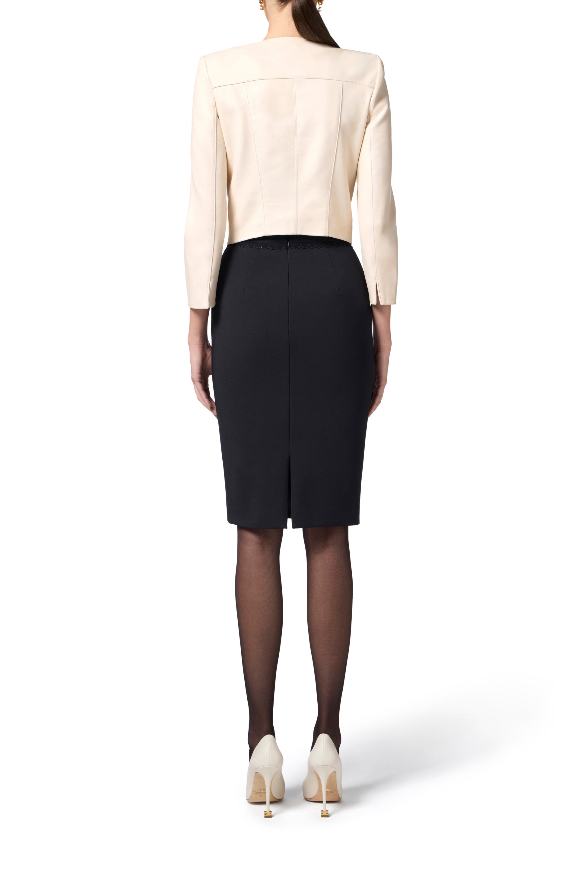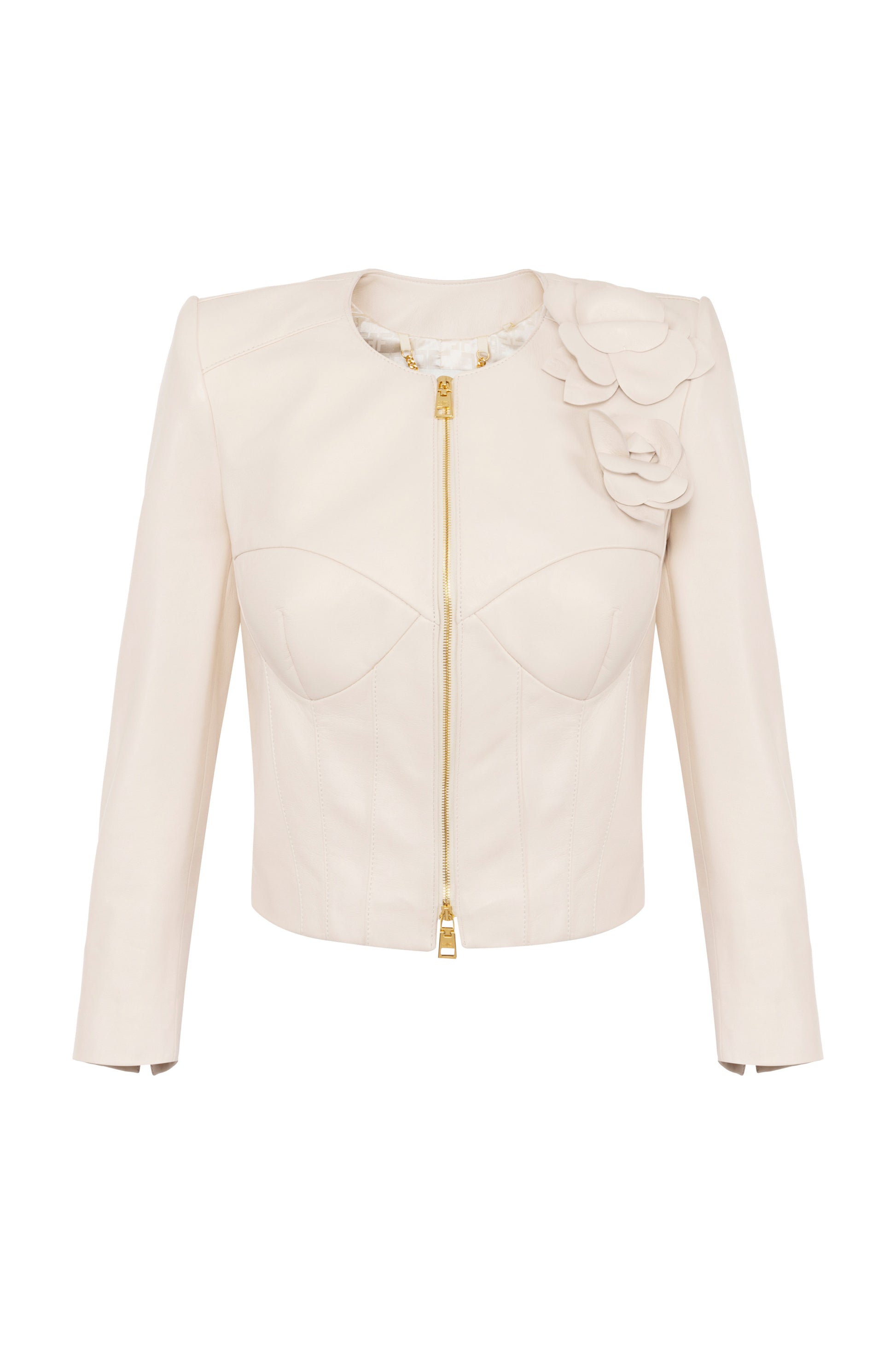 Cropped jacket made of supple leather with contrasting profiles that design a bustier motif. The fitted silhouette with round neck is completed with 3D leather flower appliqués. Golden metal zip closure with double pull-tab.