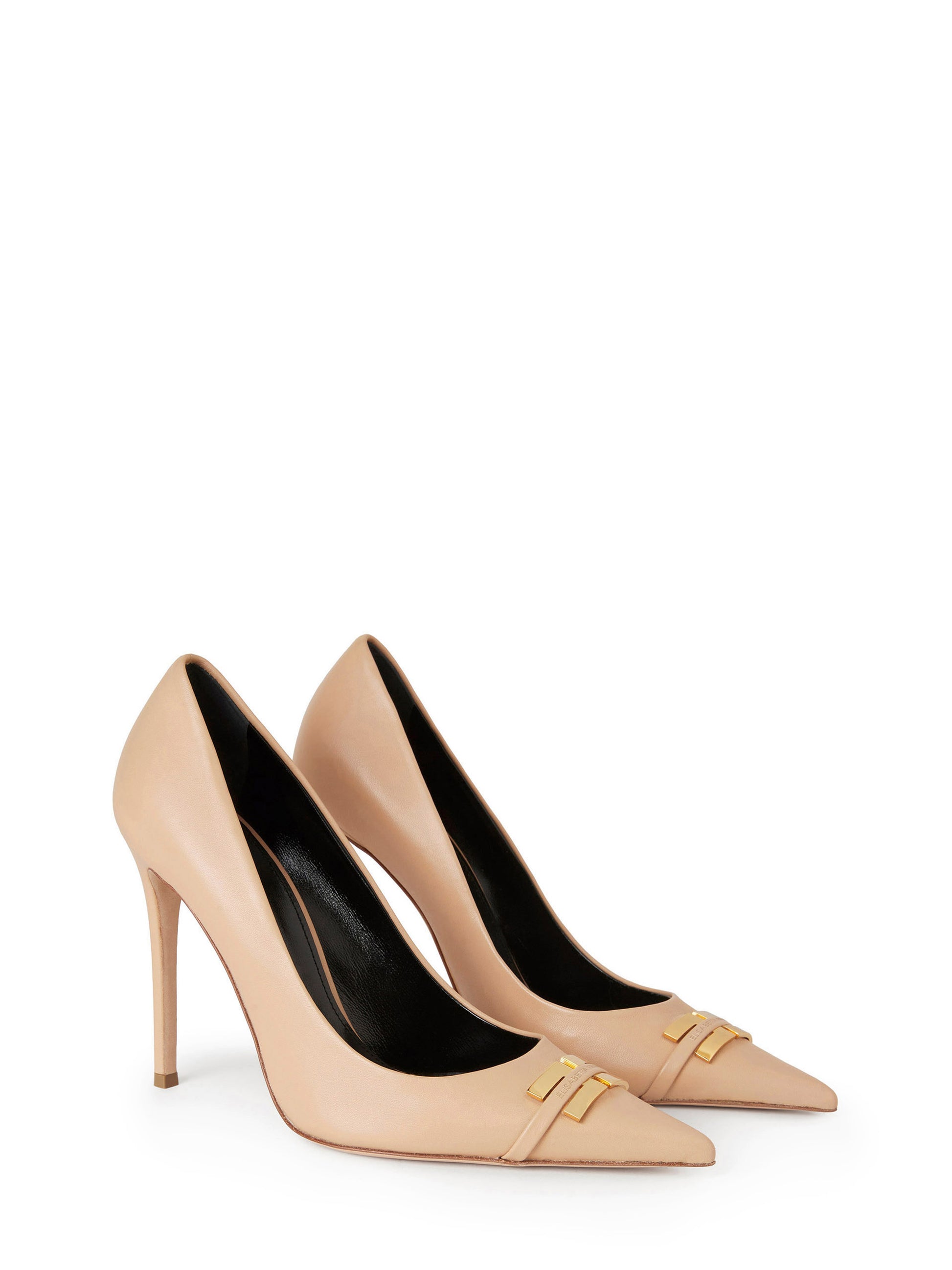 Pumps made of leather with stiletto heel and tapered toe. With a simple, bold design, they are embellished with a logo detail decorating the front.