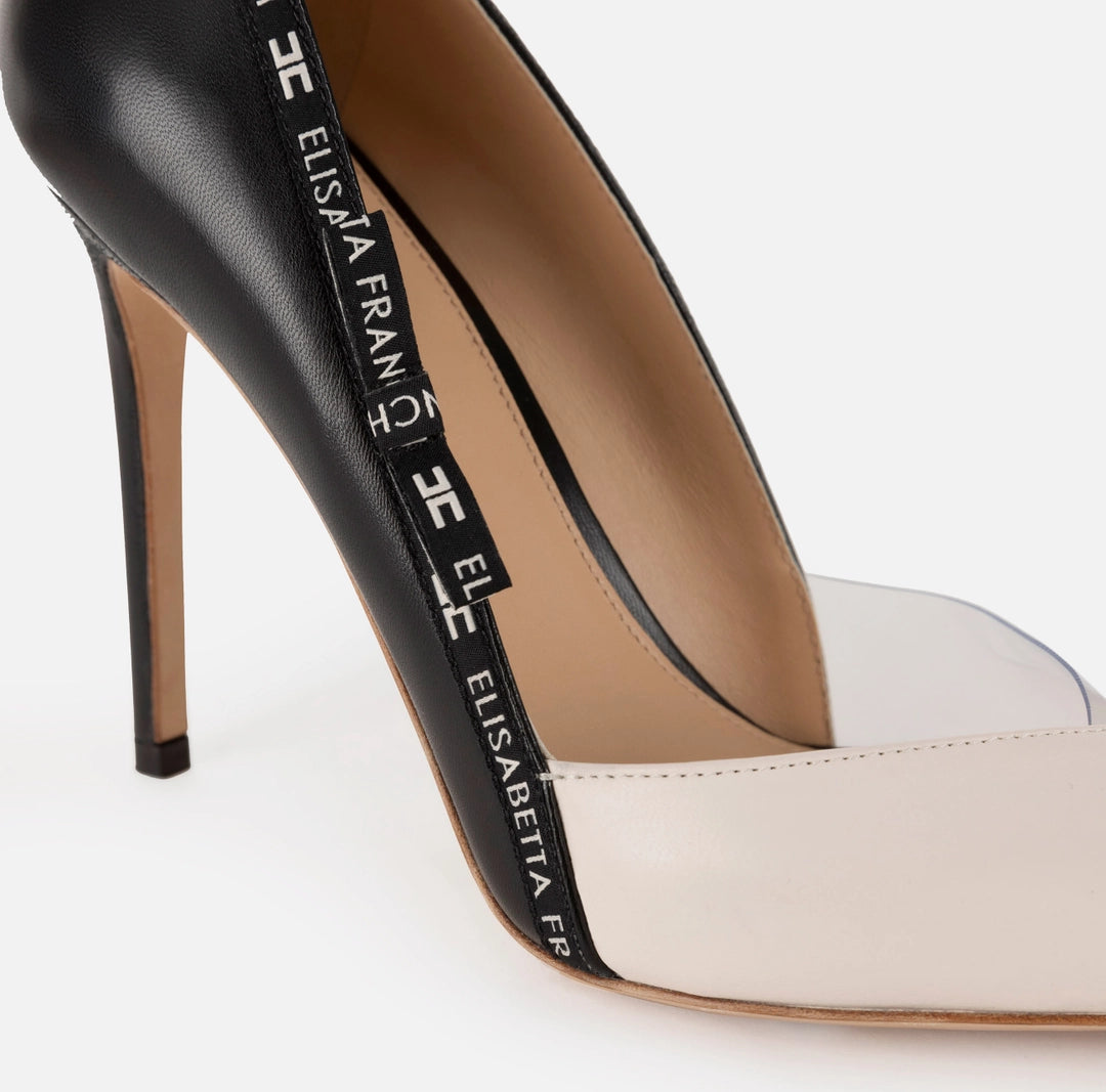 Leather and PVC pumps with wrapped stiletto heels. They are characterised by a logoed ribbon ending in a bow on the side.