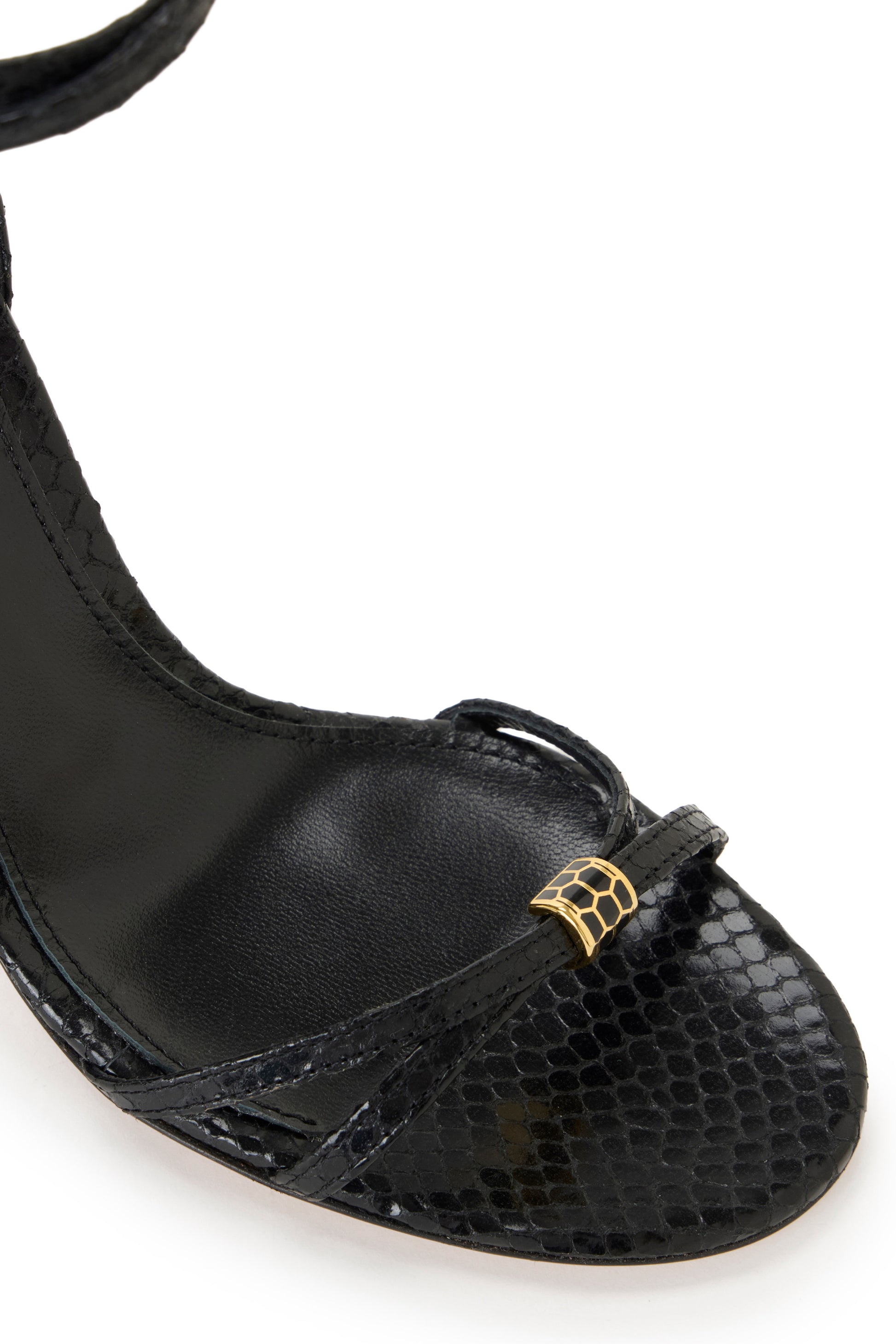 Leather sandals. They have a stiletto heel embellished with enamelled bead with a snake-inspired pattern and an ankle strap. The python print texture lends character. Crossed straps on the front, held by a rhinestone loop.