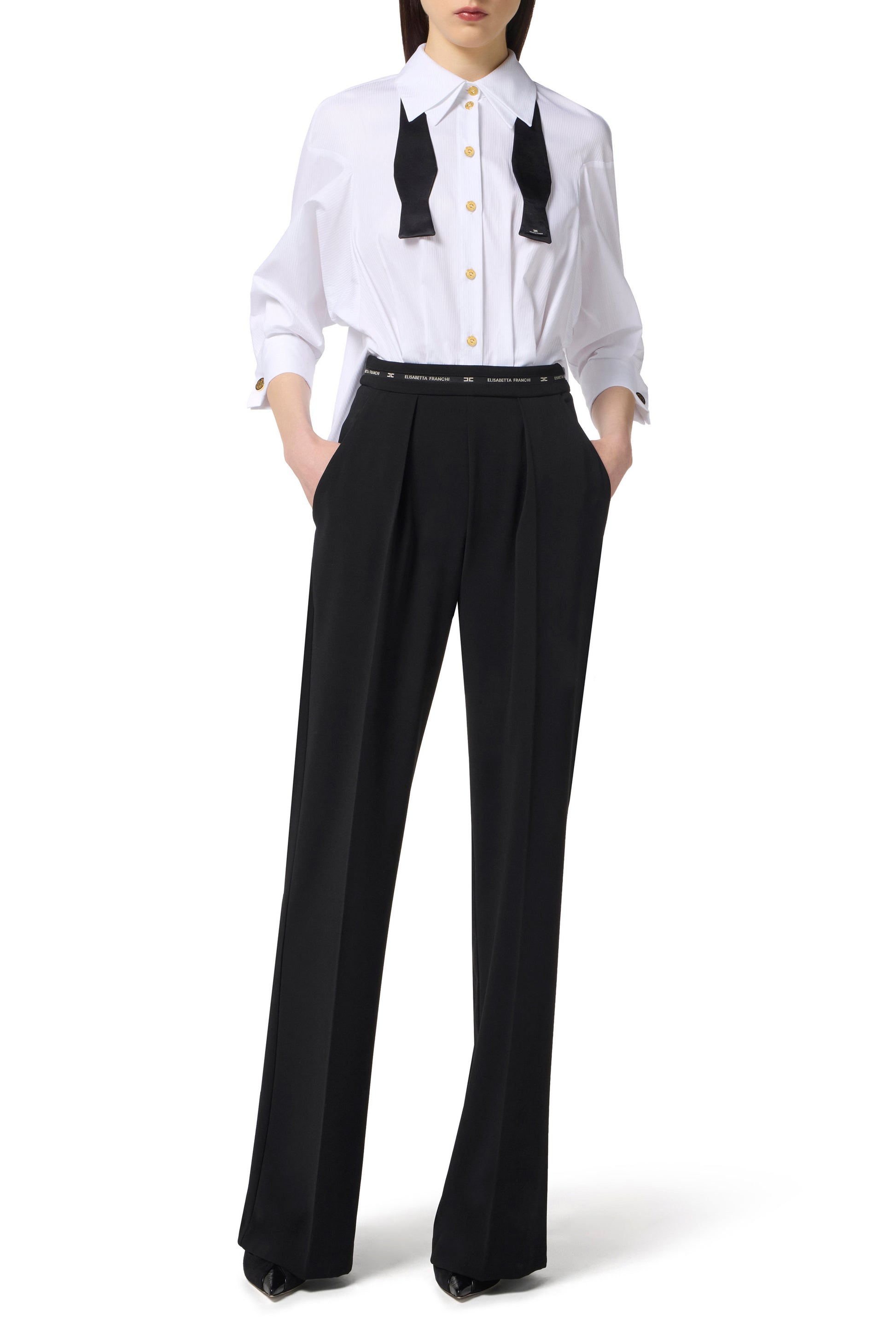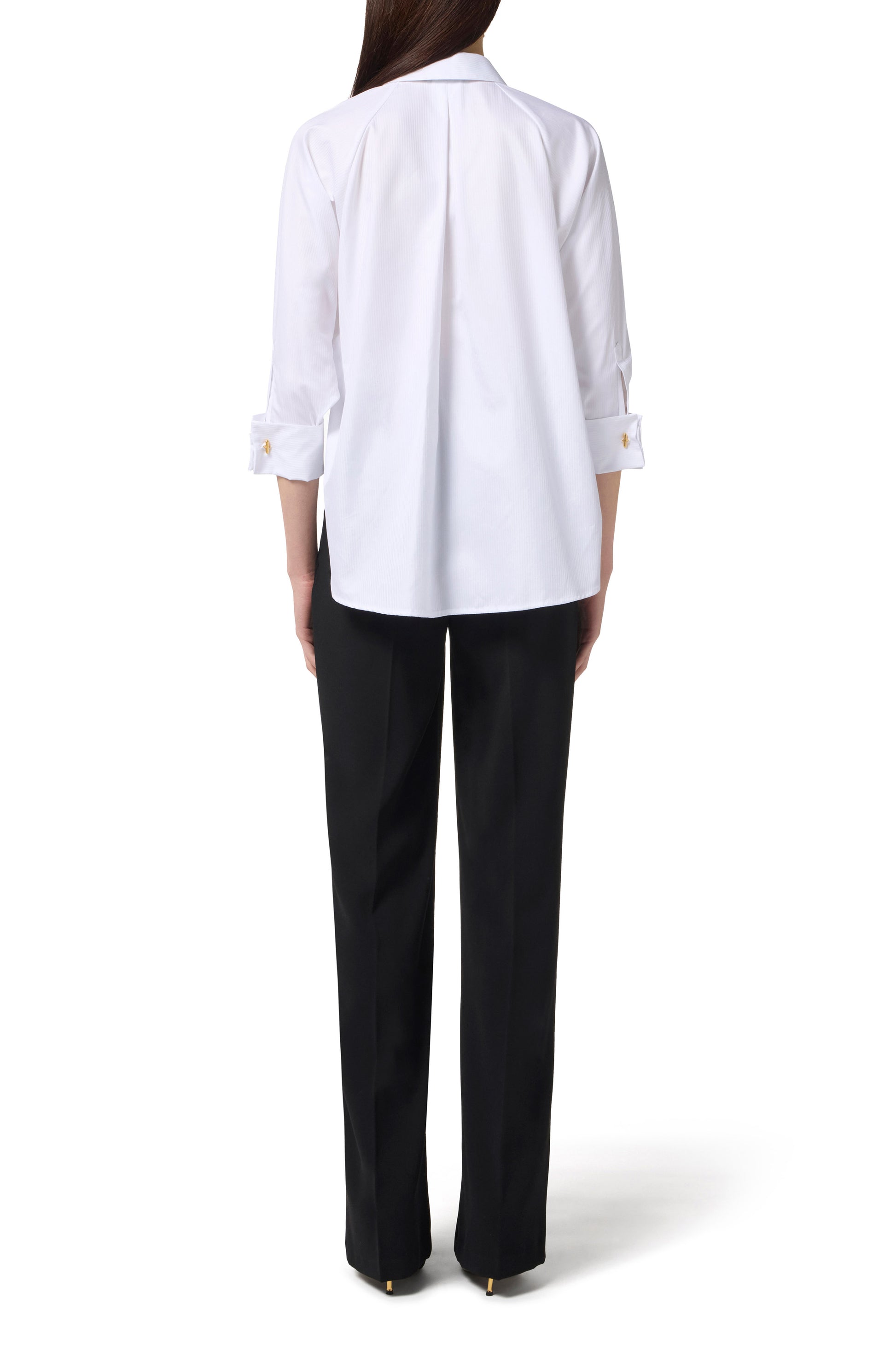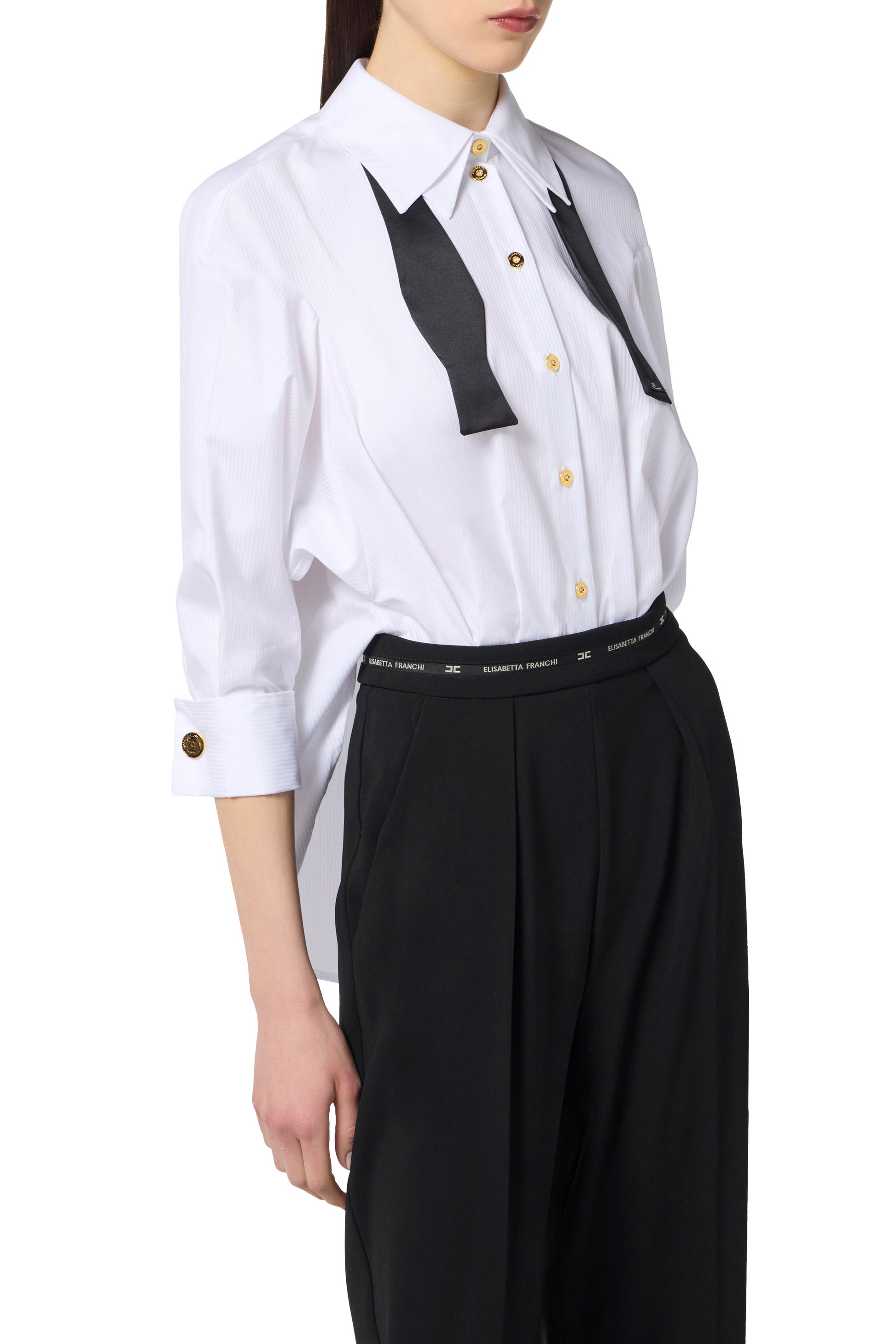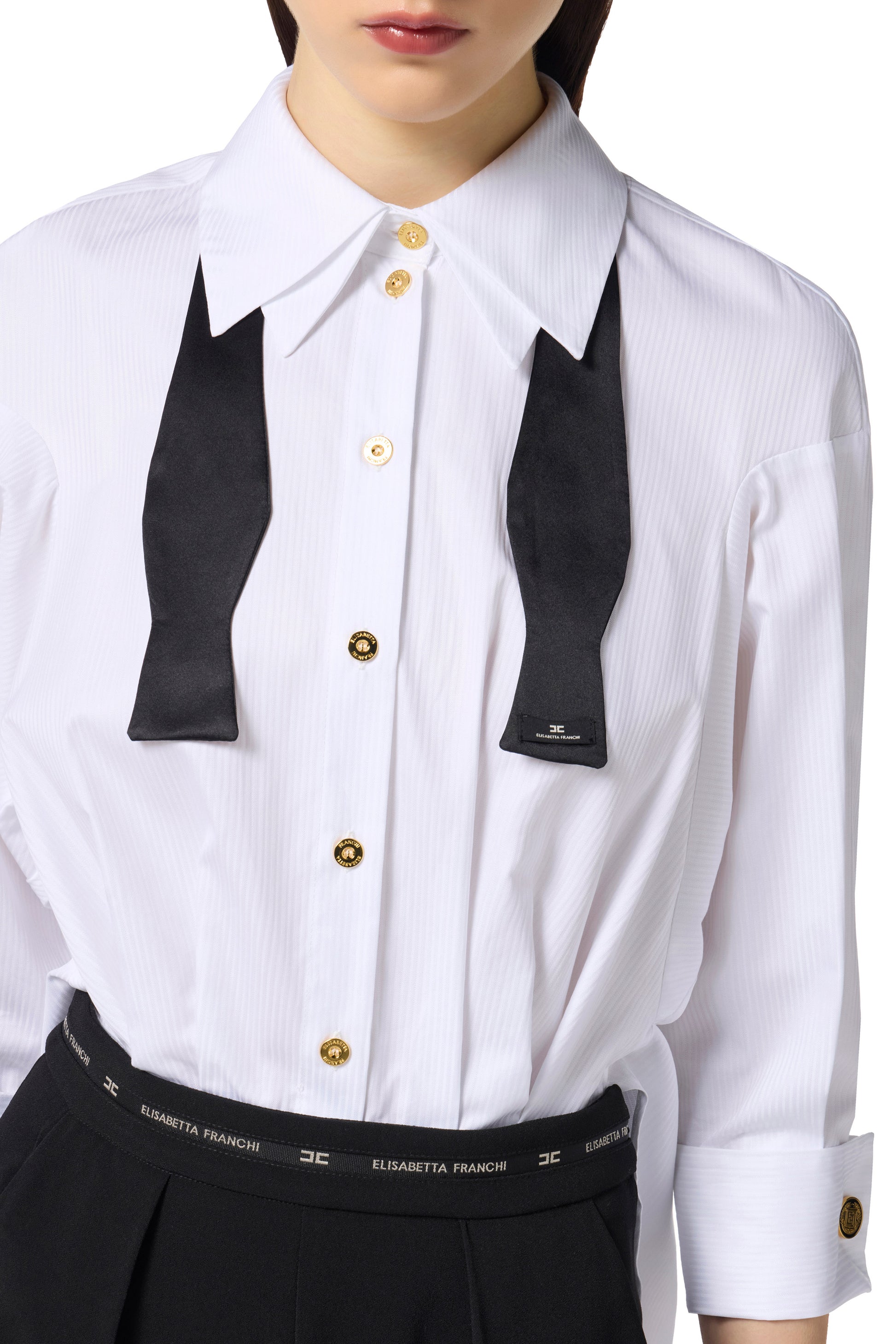 Jumpsuit with matching striped cotton poplin shirt and lightweight crêpe fabric trousers. With a double collar and untied bow tie, it has a longer hem at the back that protrudes from the trousers. The waist is defined by the logo ribbon, while the golden metal buttons add bright touches. Regular fit.