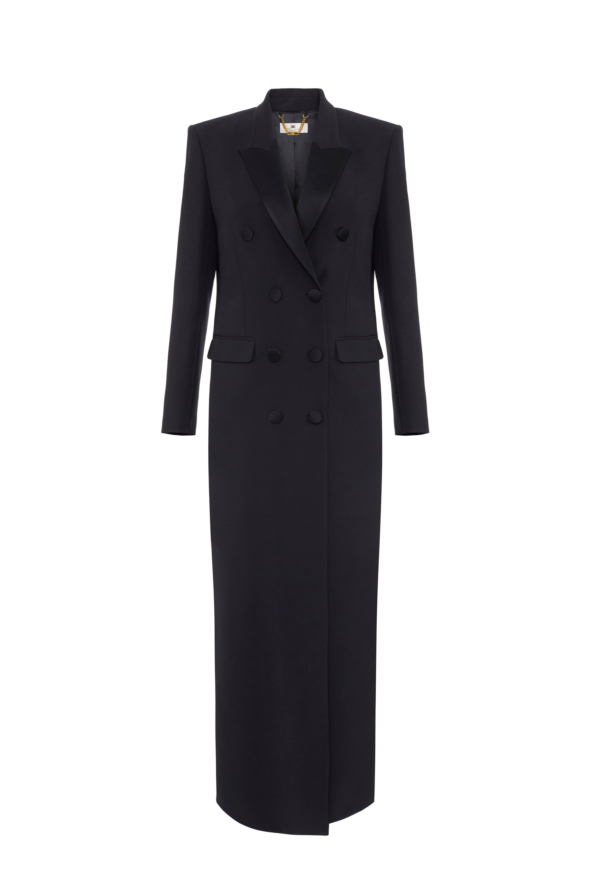Long double-breasted coat with a regular fit. The garment has structured shoulders and is characterised by the satin lapels and buttons that create a bright texture contrast. Button closure.