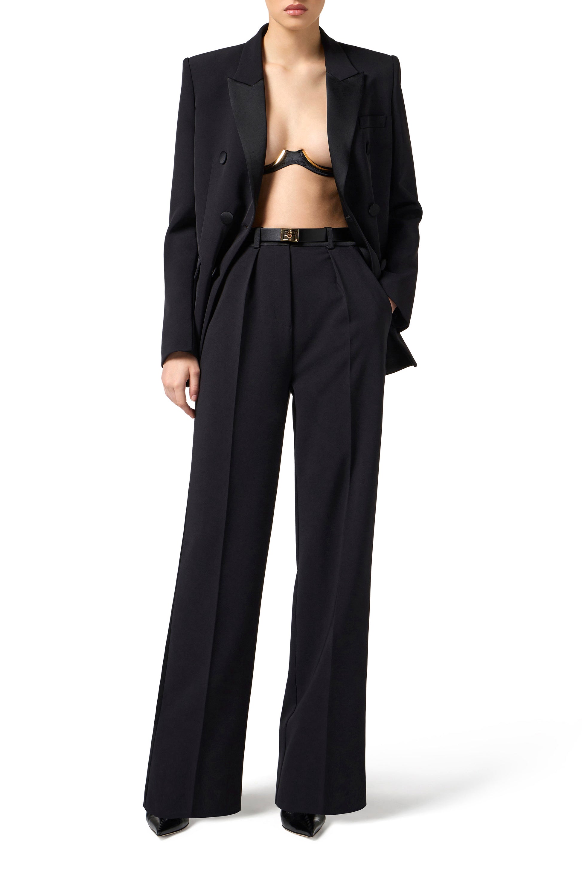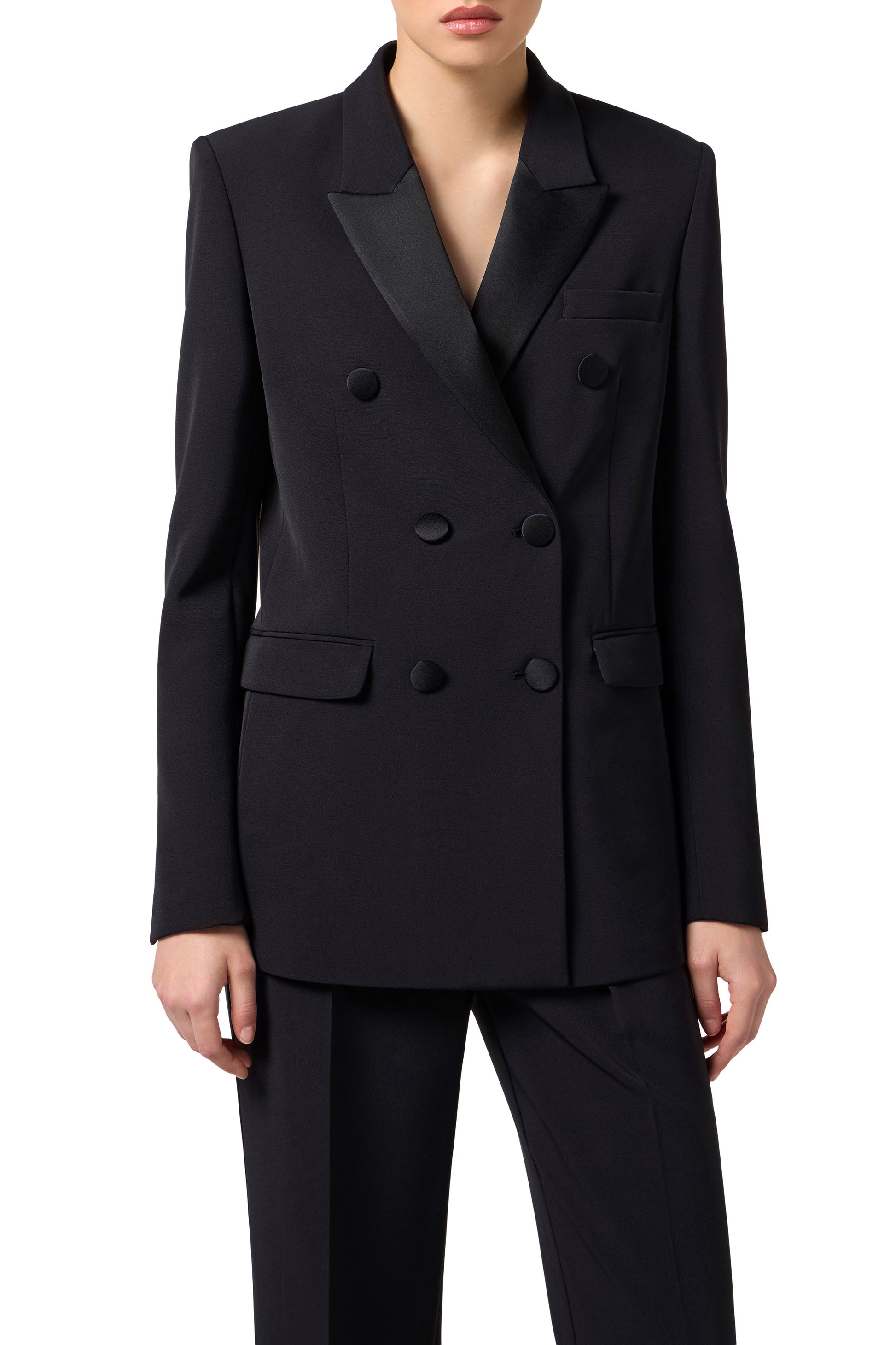 Double-breasted jacket in lightweight crêpe. The blazer has structured shoulders, breast pocket and flap appliqués. It is characterised by peak lapels and buttons in satin, for a bright texture contrast. Regular fit.