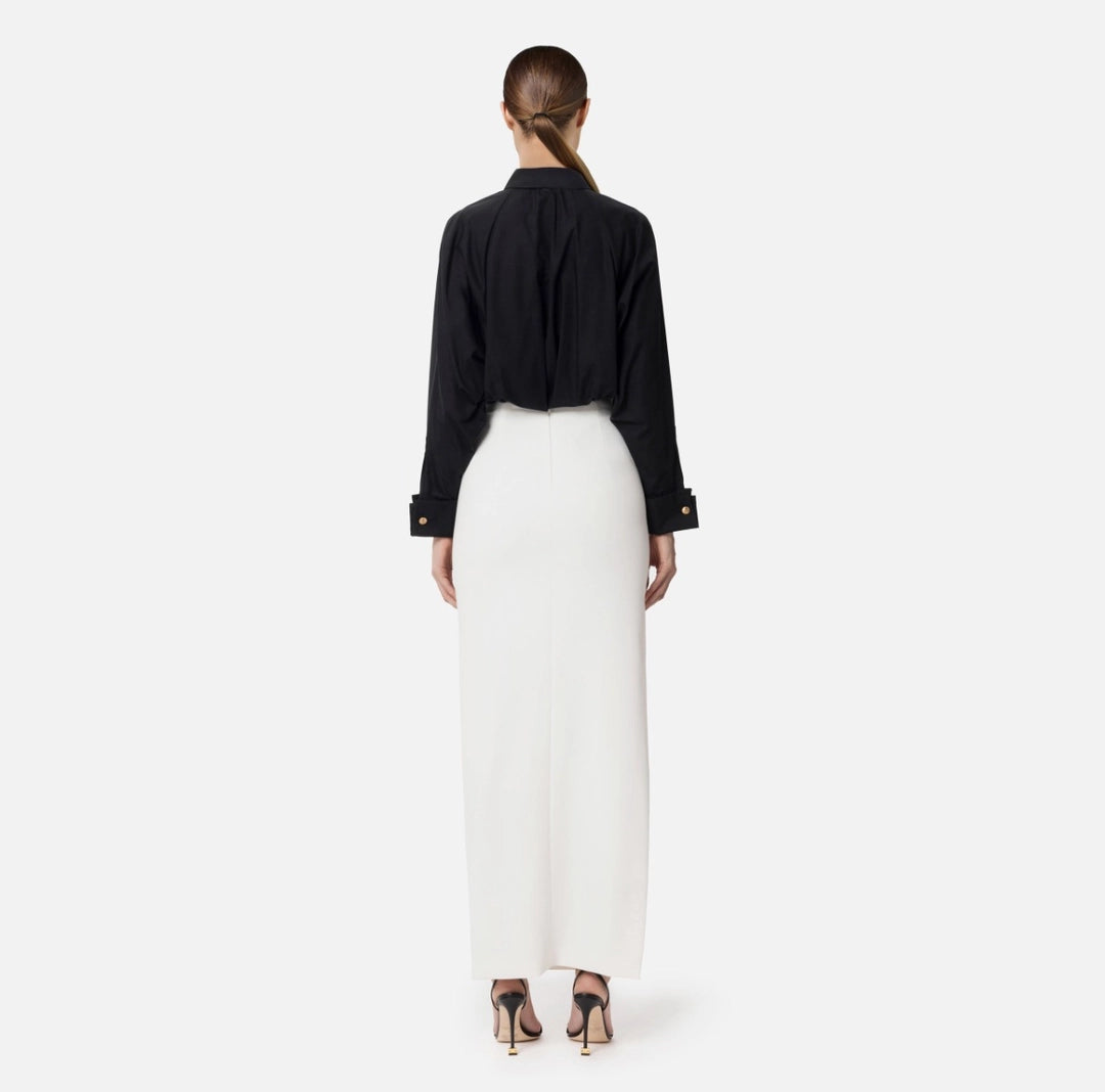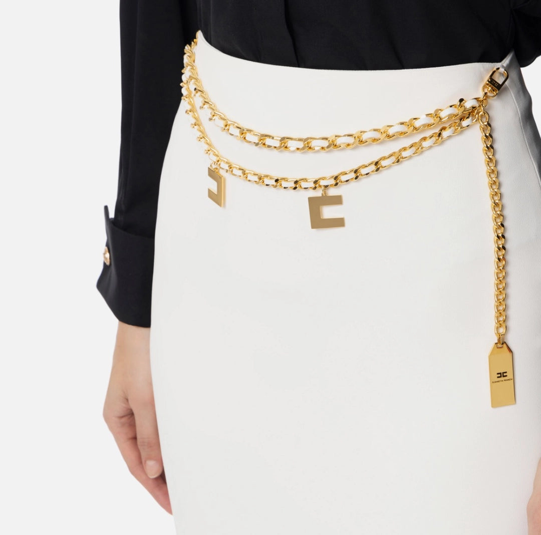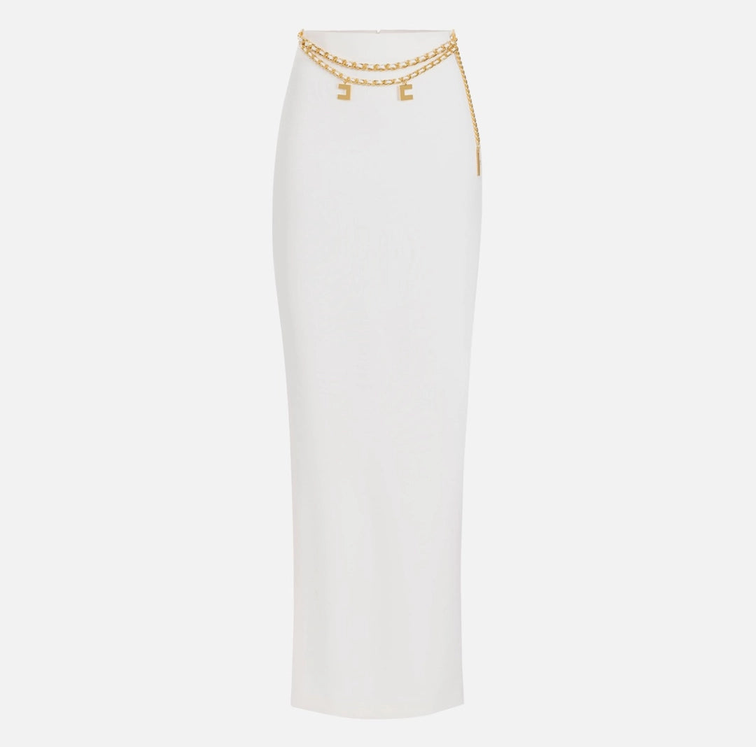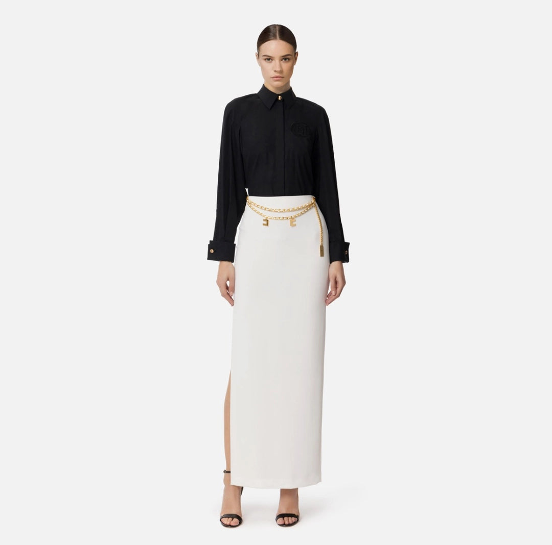 Lightweight crepe long skirt with French pockets and side slit. The waist is emphasized by a threaded chain belt and gold metal logo charms.