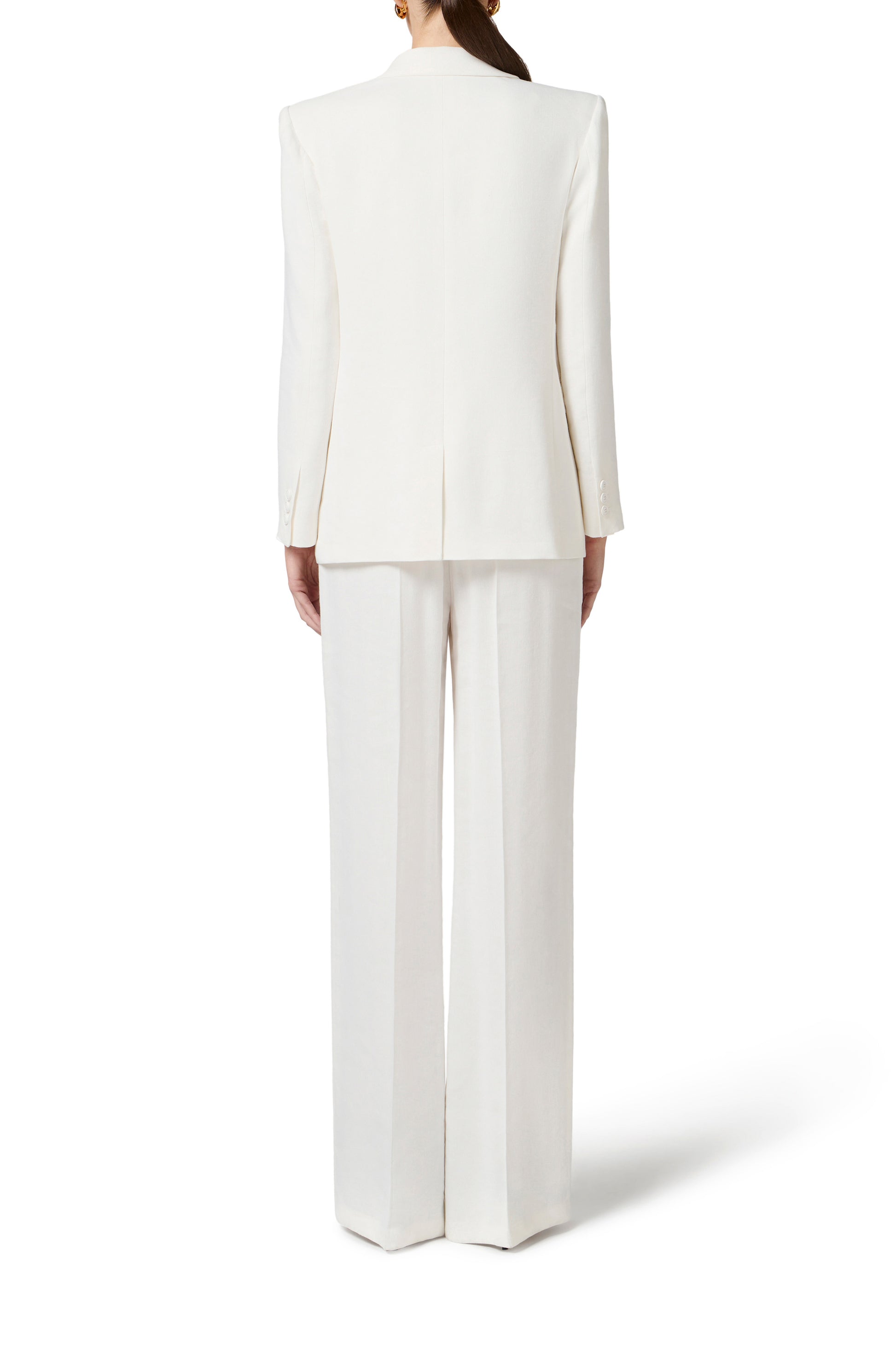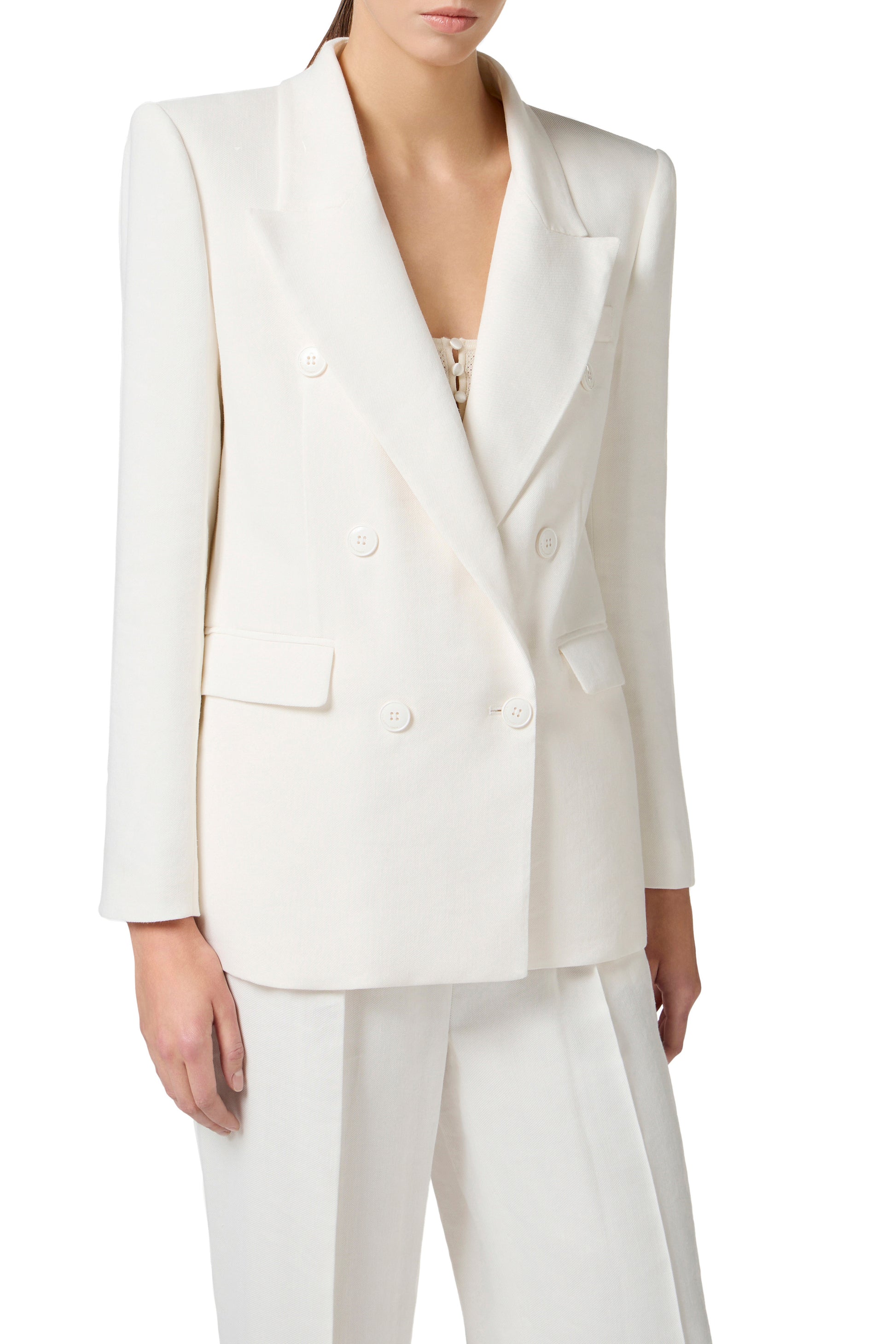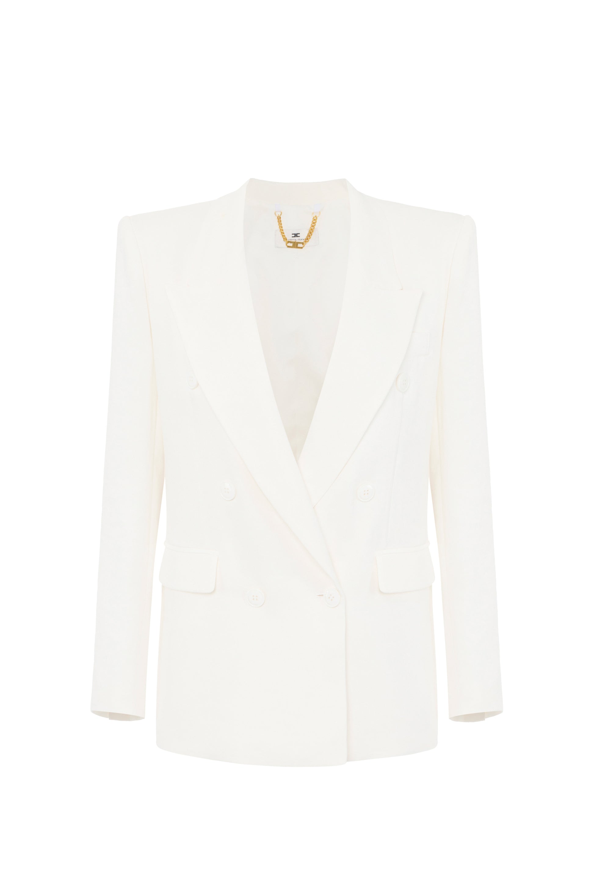 Linen blend gabardine jacket. The blazer has structured shoulders with peak lapels and patch flaps. The double-breasted closure with tone-on-tone buttons gives an elegant and decisive figure. Regular fit.