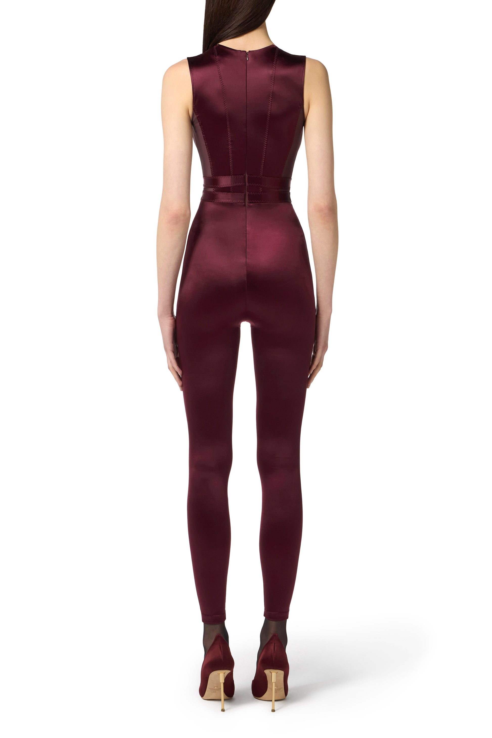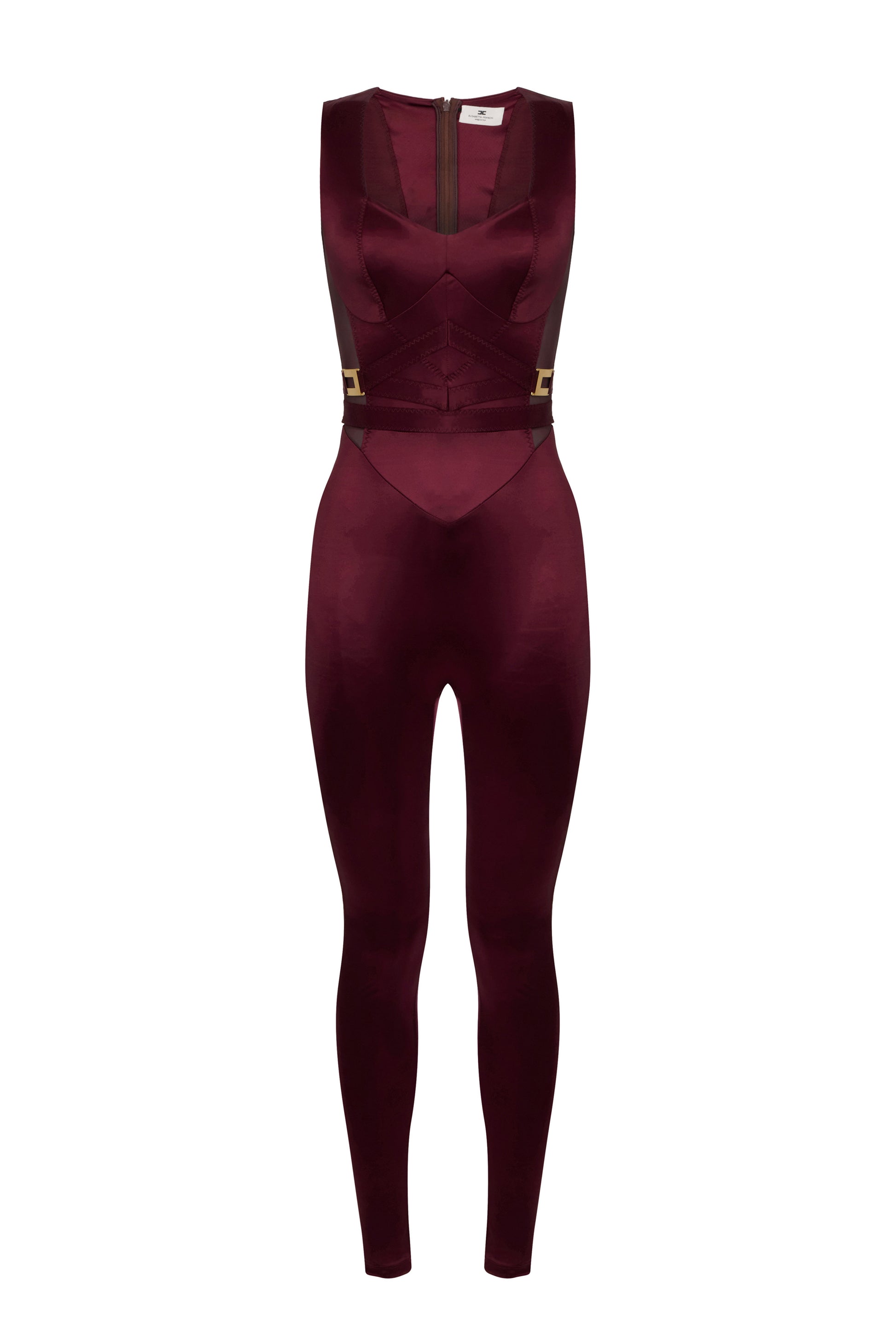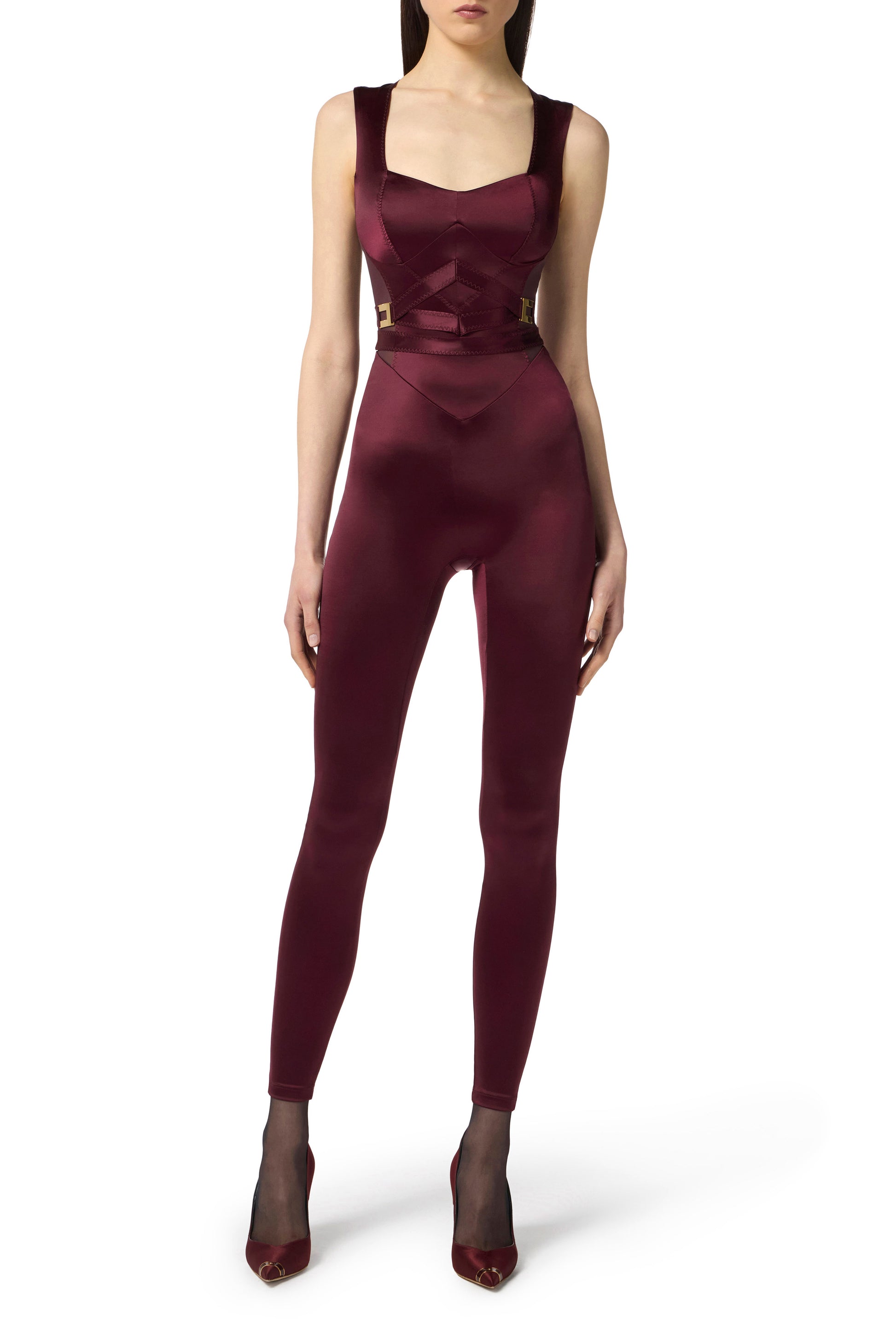 Lycra jumpsuit with a slim fit, sweetheart neckline and cups. It stands out for the ribbons with zigzag stitching inspired by the world of corsetry, drawing a geometric pattern on the front. Embellished with jewel logos on the hips and mesh inserts for sensual texture contrasts.
