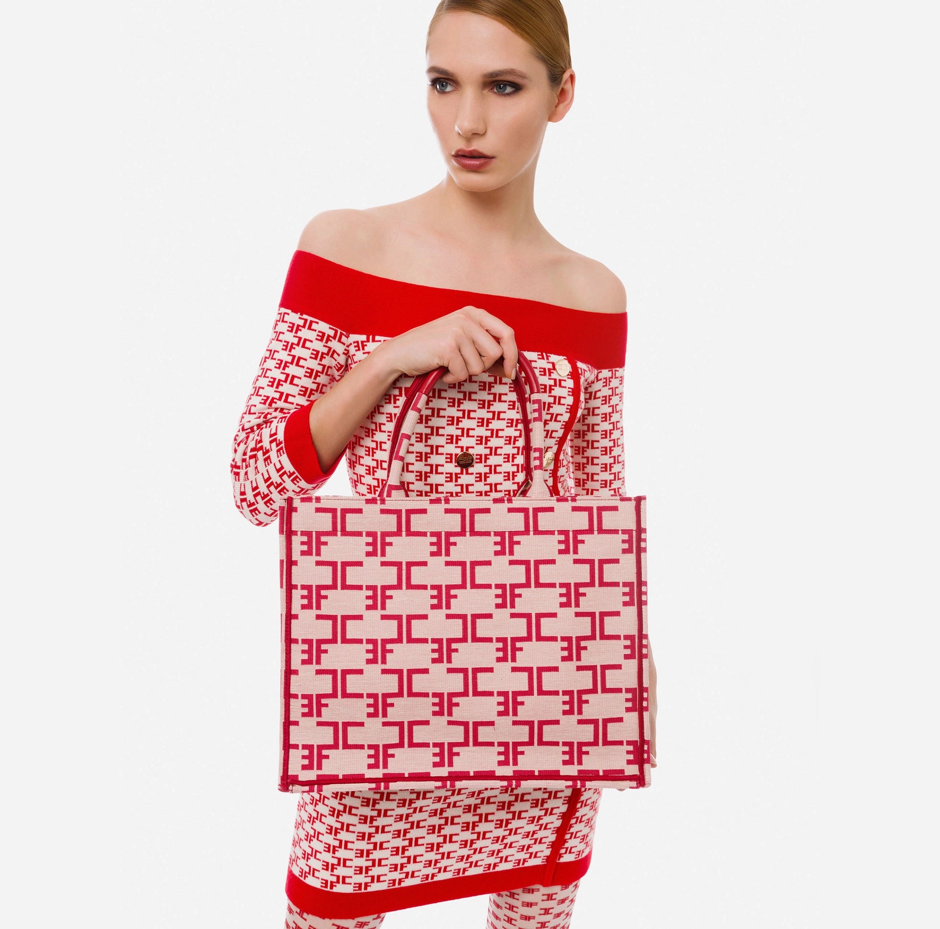 The new iconic bag of the Maison has sophisticated and contemporary lines. A shopper with practical, comfy handles, a roomy and rigorous silhouette, it is made of jacquard cloth and is covered entirely with the new monogram. Elisabetta Franchi offers it in two different models: try it out in the mini size and carry it with you 24 hours a day.