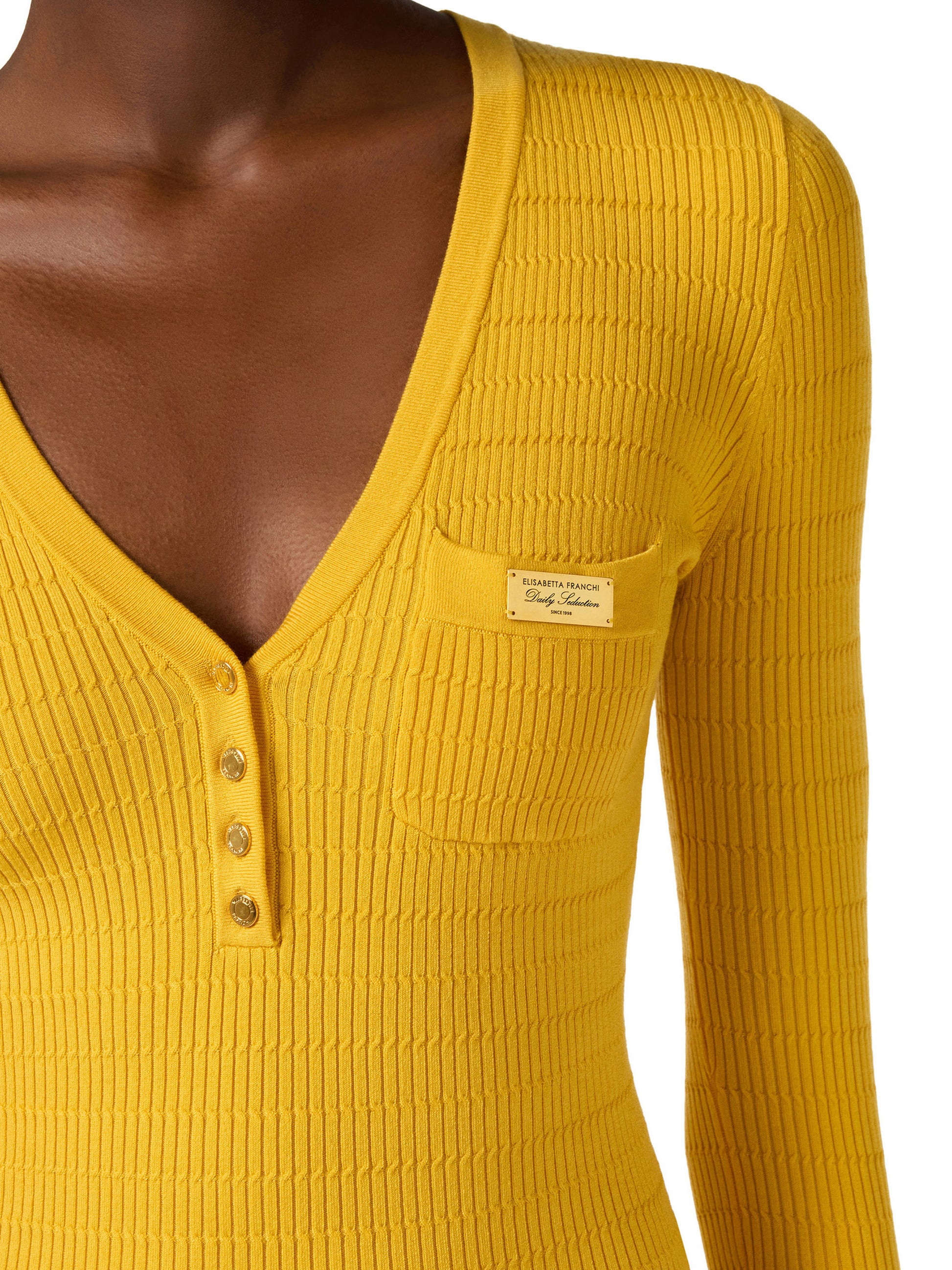 Knit dress with a slim fit. The dress has a V-neck with buttons and long sleeves. It features elaborate workmanship, with the weave enlivened by micro-braided ribs along its entire length, creating a dynamic tactile pattern. Breast pocket with golden metal plaque for a final stylish detail.